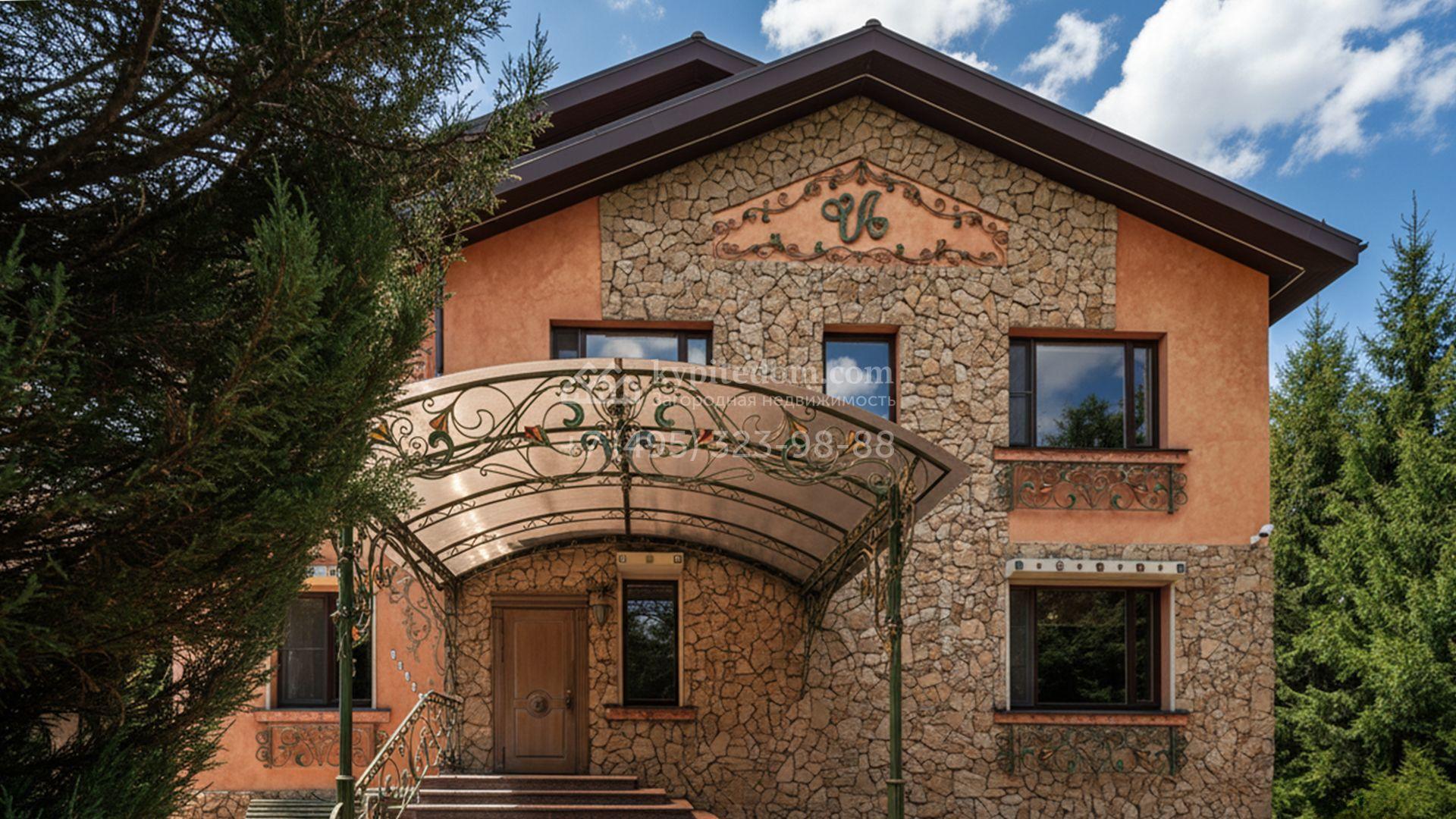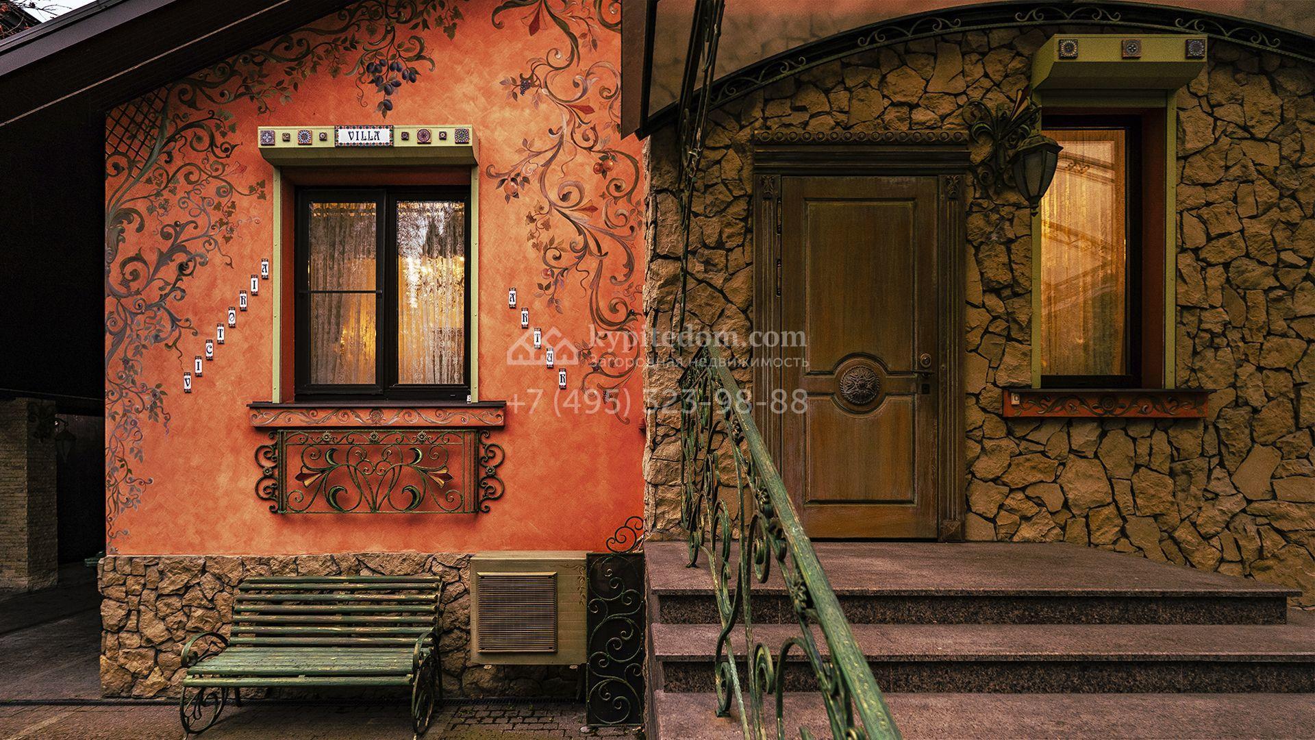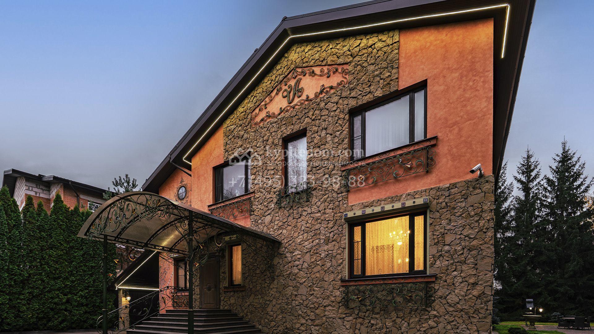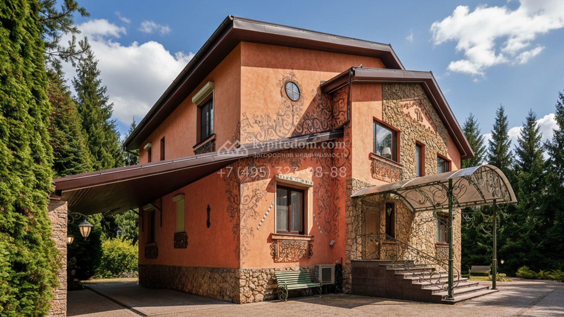 Загородный коттедж площадью 600 м² расположен на полевом участке 14 соток. Фасад, выполненный в европейском стиле, облицован коралловой штукатуркой и плиткой с фактурой камня, а также украшен рисунками с цветочными мотивами.