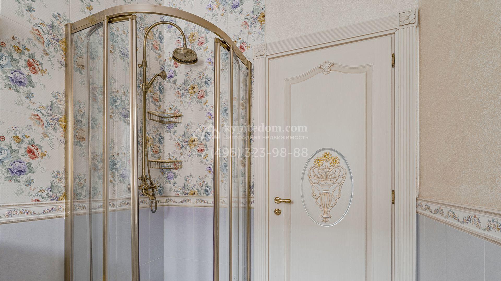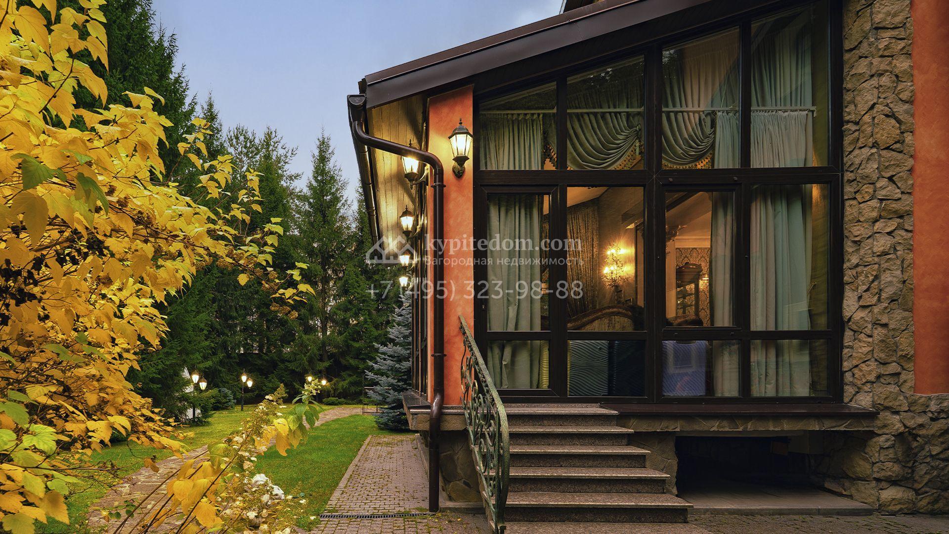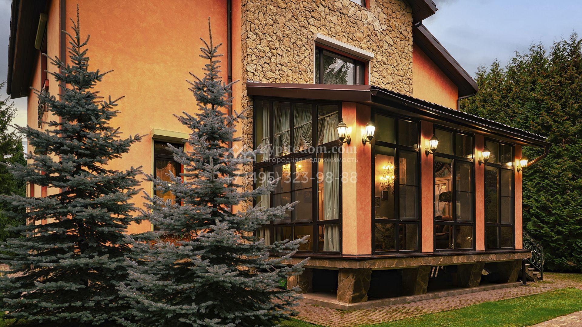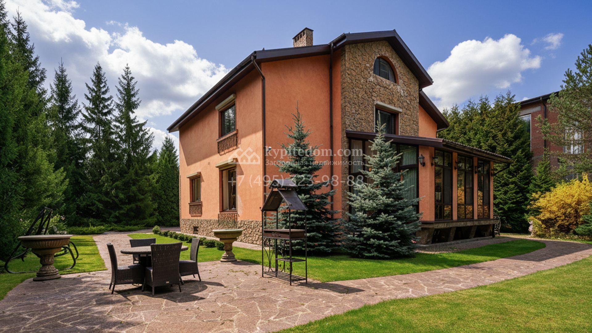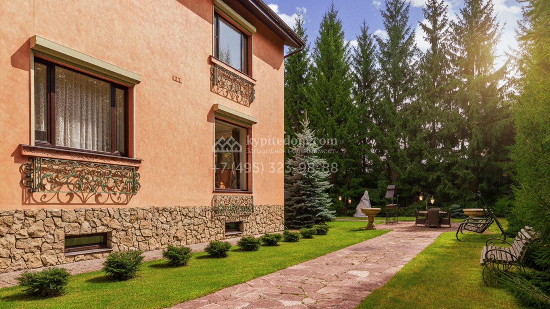 Загородный коттедж площадью 600 м² расположен на полевом участке 14 соток. Фасад, выполненный в европейском стиле, облицован коралловой штукатуркой и плиткой с фактурой камня, а также украшен рисунками с цветочными мотивами.