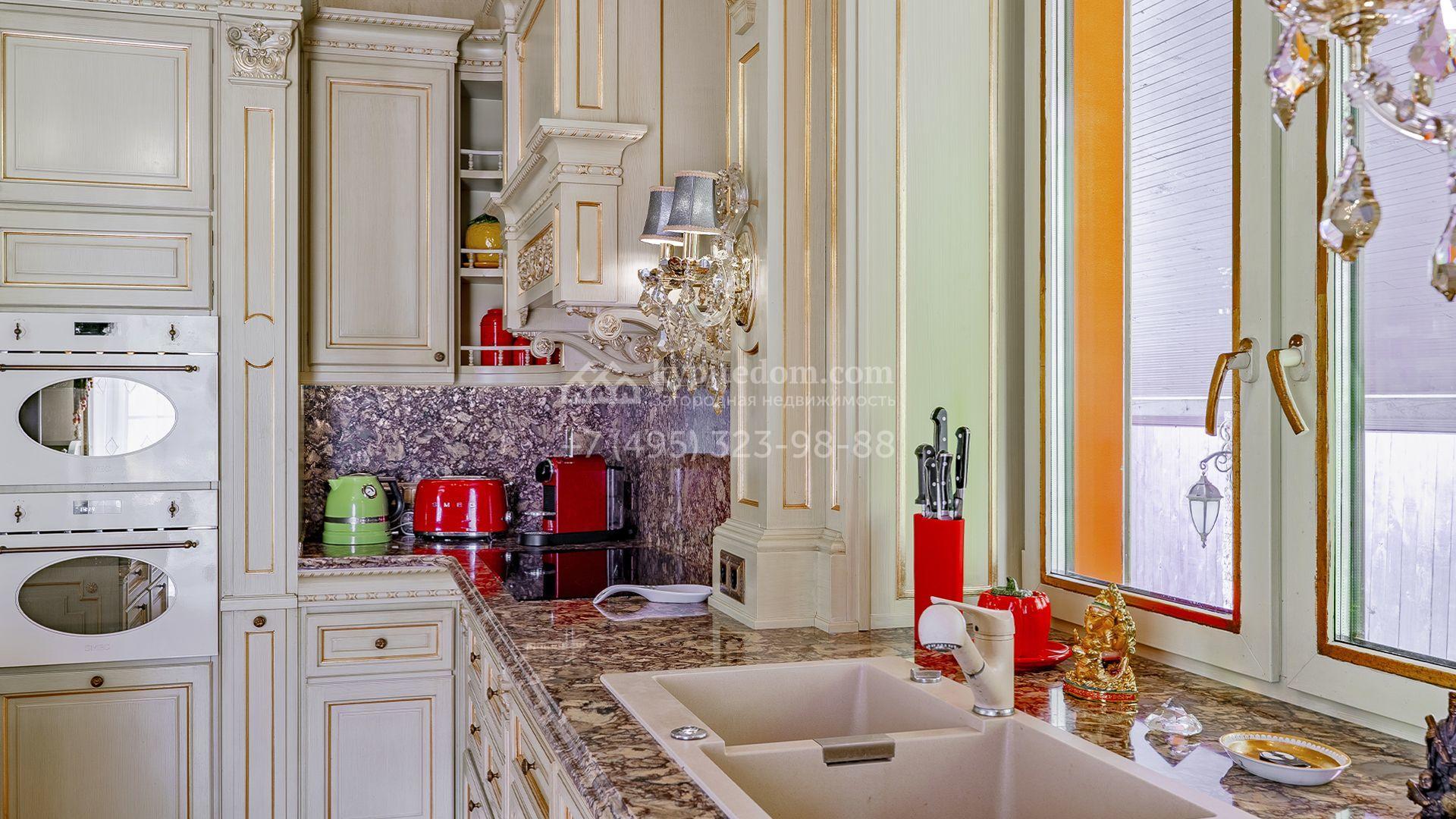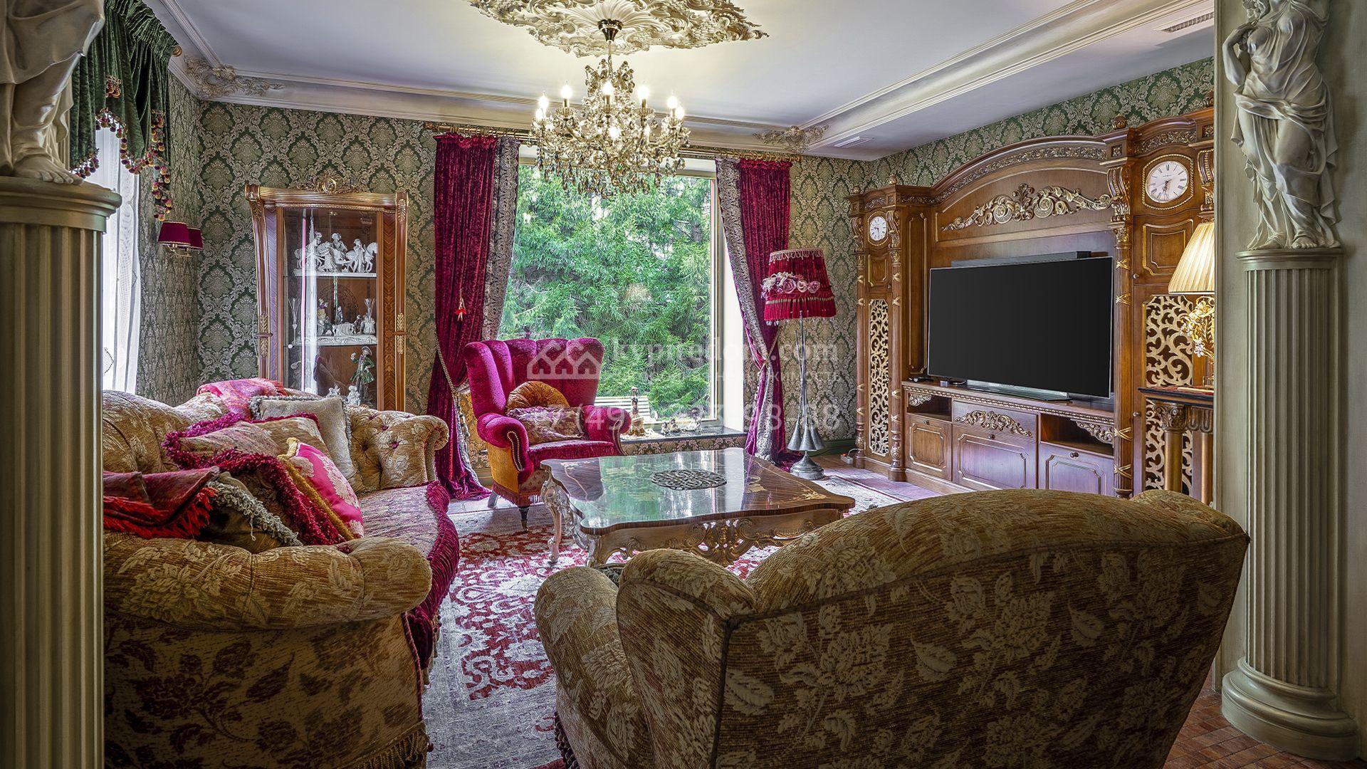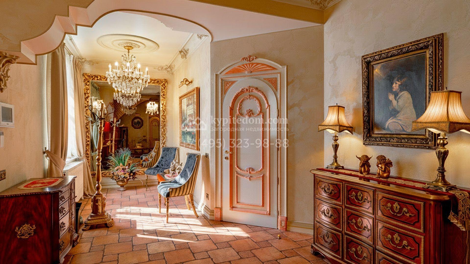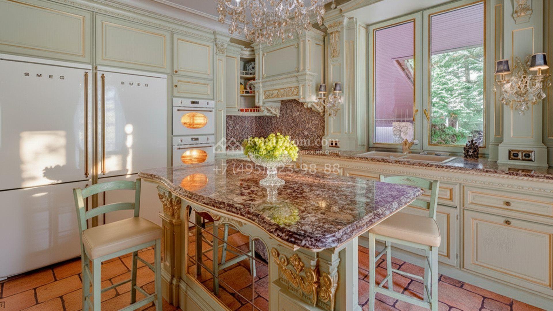 Интерьеры, гармонично сочетающиеся с внешним обликом здания, щедро украшены художественной росписью, лепниной, молдингами, изящными люстрами, антикварными акцентами и предметами ручной работы. Дом укомплектован бархатной мебелью Provasi, роскошным текстилем и бытовой техникой ведущих брендов — Smeg, Miele и Bosch. Система кондиционирования обеспечивает комфортный микроклимат в течение всего года.