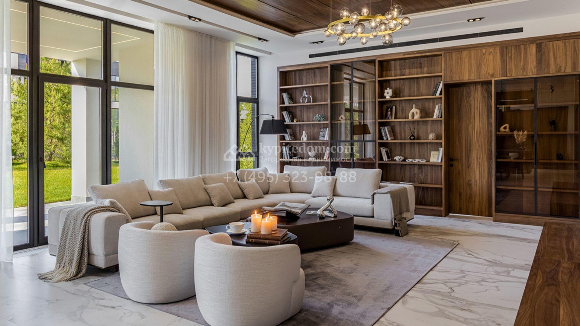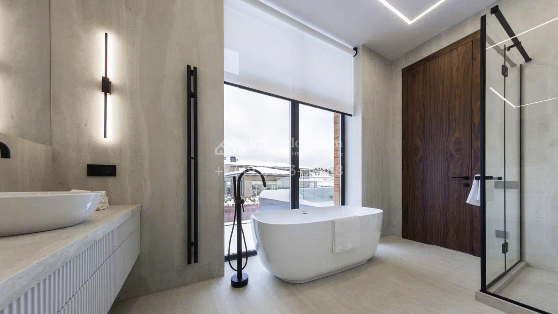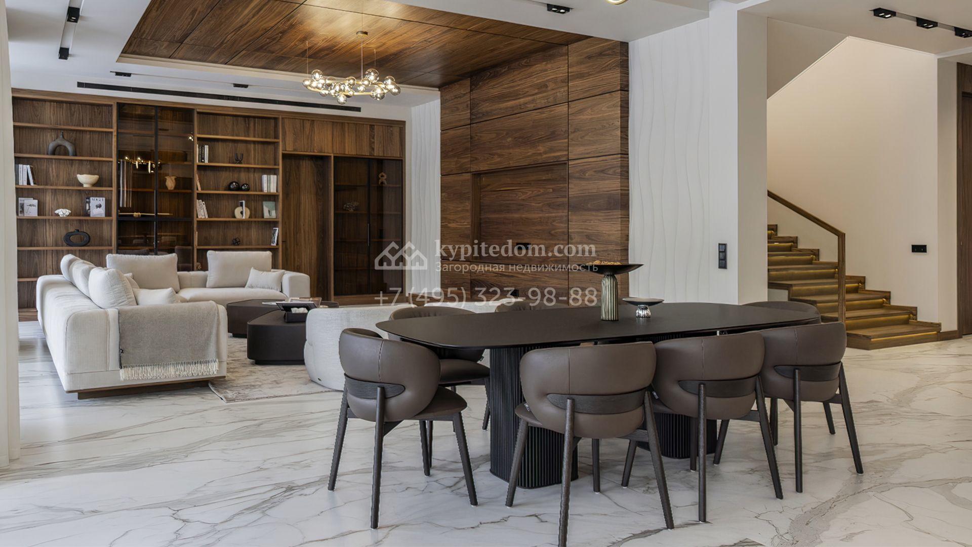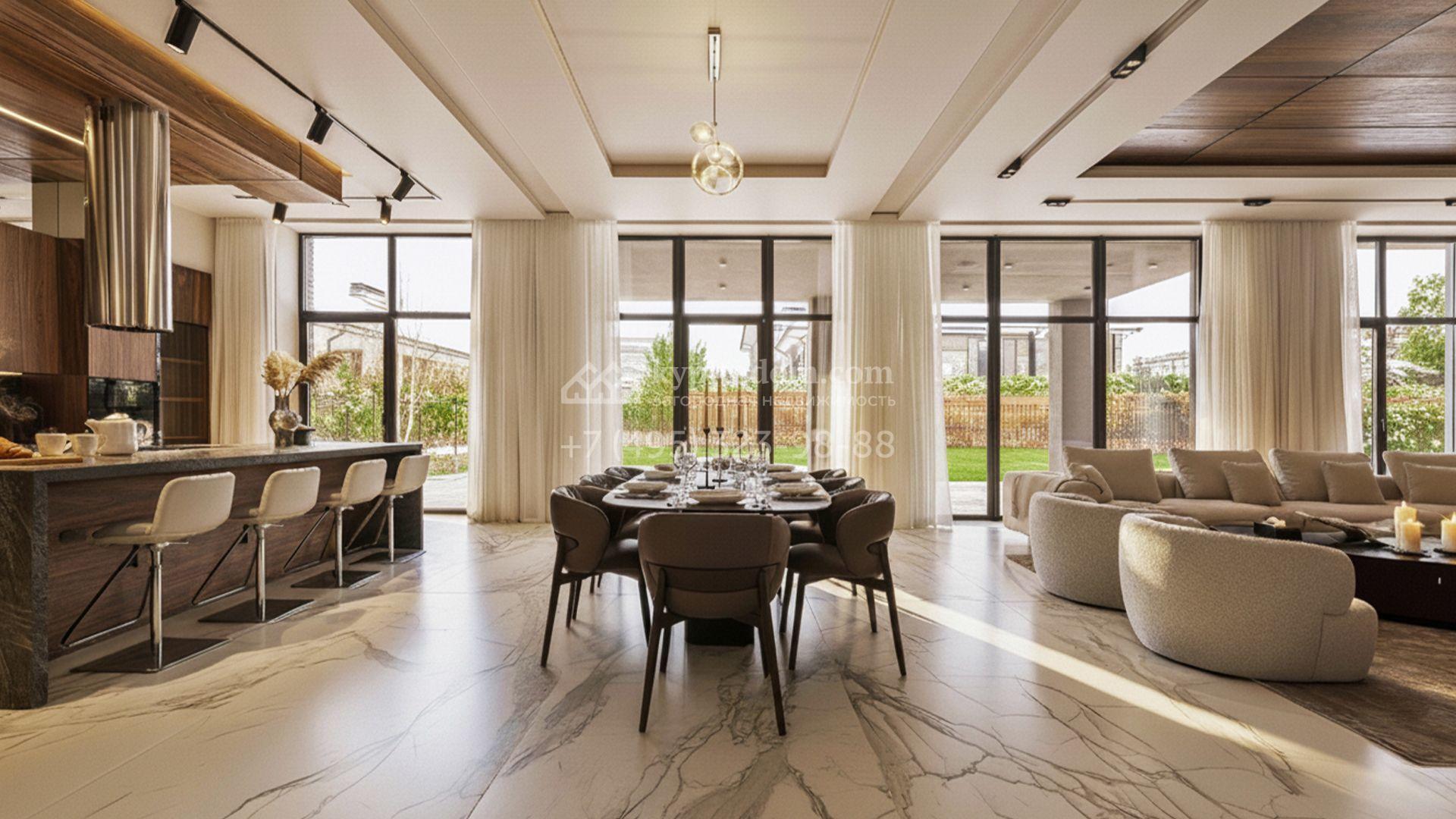 Интерьеры оформлены в современном стиле, где преобладают мягкие нейтральные оттенки. Натуральные древесные текстуры вносят акценты, добавляя пространству теплоту и сложность. Панорамные окна и многоуровневые потолки с тщательно продуманным освещением создают игру света и тени, создавая атмосферу уюта и гармонии. Дом полностью меблирован и укомплектован техникой от ведущих производителей.