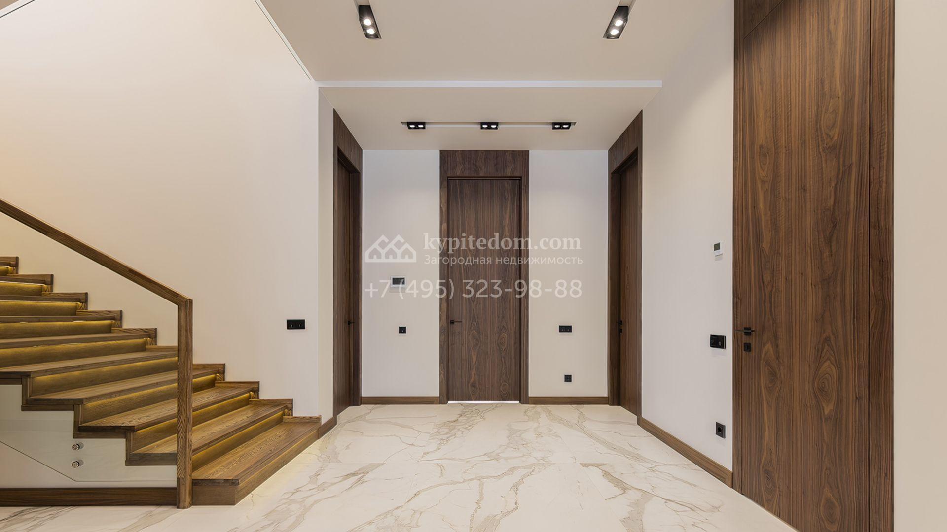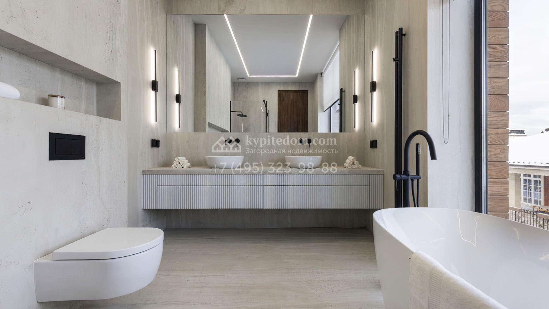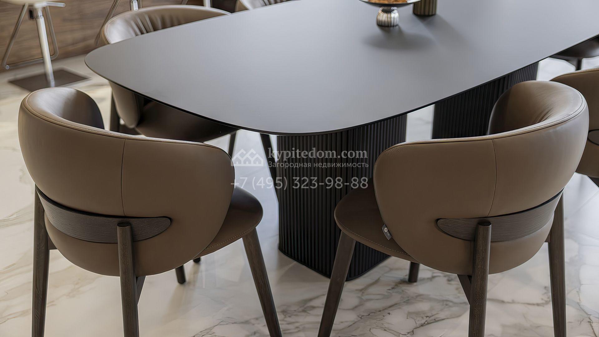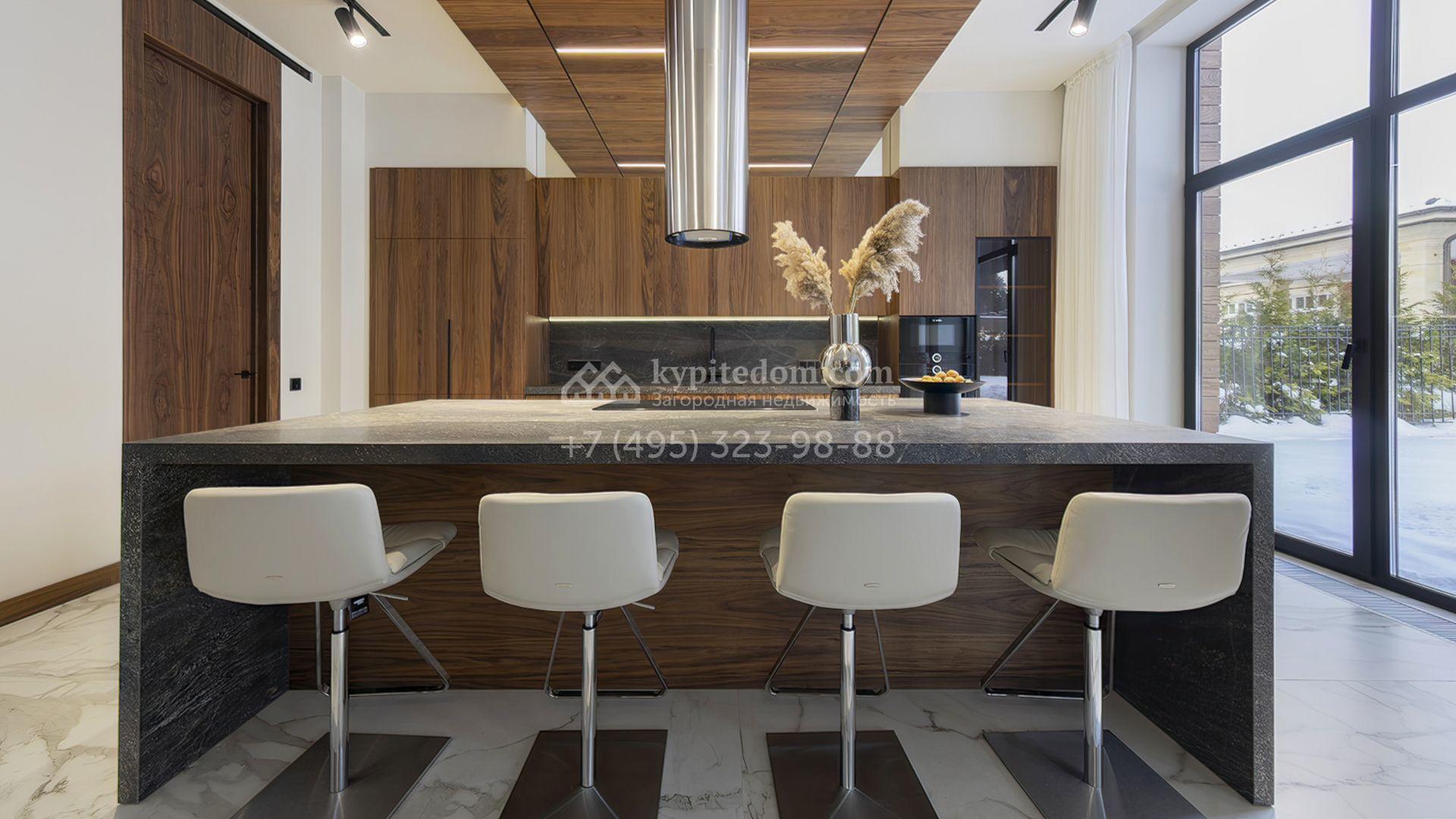 Интерьеры оформлены в современном стиле, где преобладают мягкие нейтральные оттенки. Натуральные древесные текстуры вносят акценты, добавляя пространству теплоту и сложность. Панорамные окна и многоуровневые потолки с тщательно продуманным освещением создают игру света и тени, создавая атмосферу уюта и гармонии. Дом полностью меблирован и укомплектован техникой от ведущих производителей.