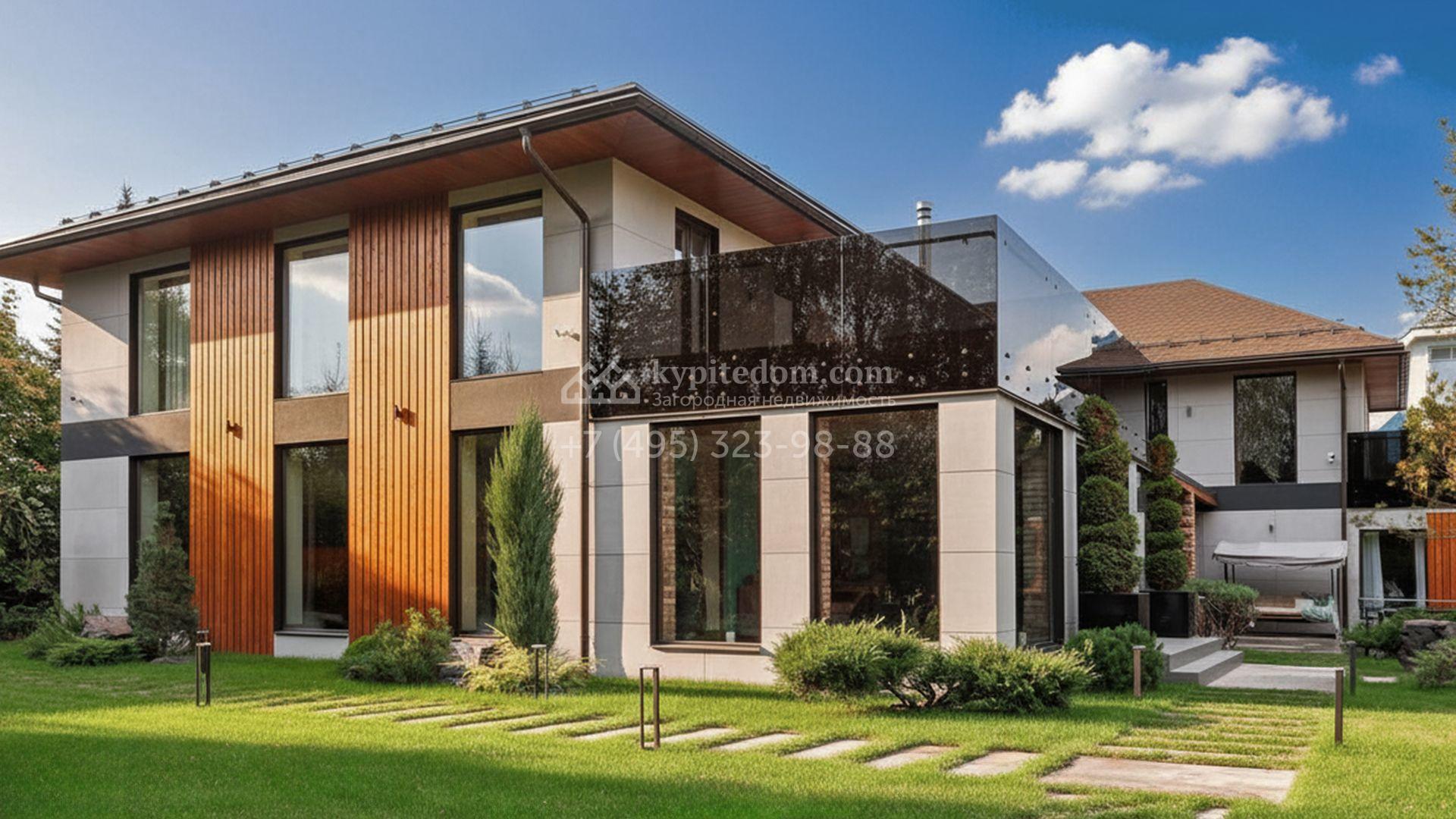 Загородный коттедж площадью 975 м² расположен на полевом участке 30 соток. Современный фасад облицован плиткой в лаконичных чёрно-белых тонах и дополнен планкеном. Эффектные панорамные окна стирают грань между наполненными солнцем интерьерами и живописными видами на природу.