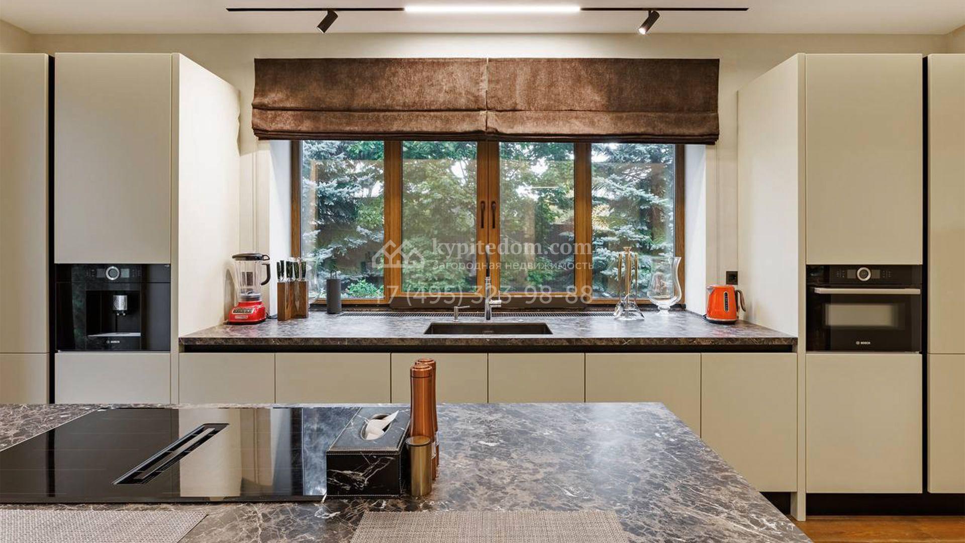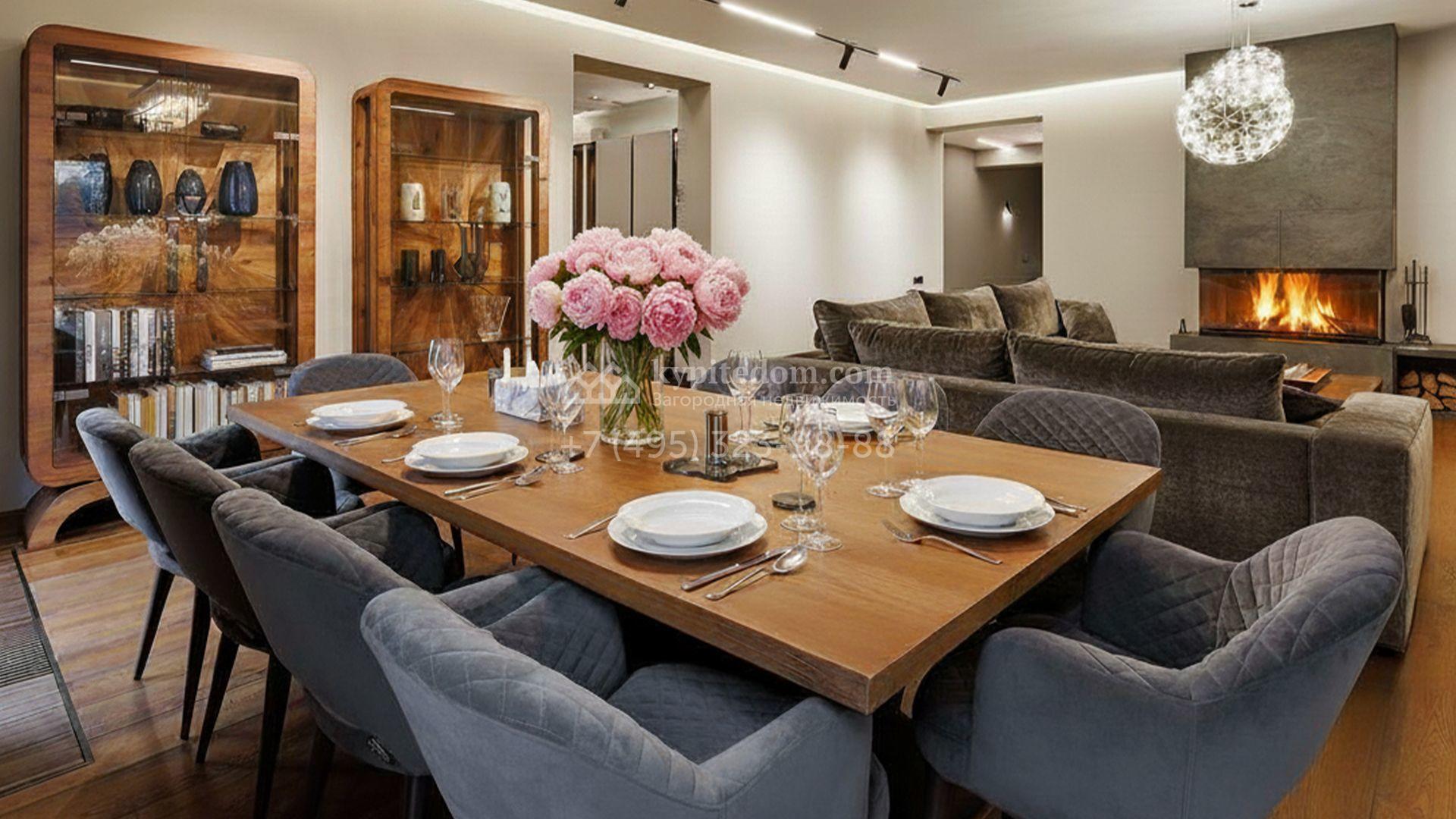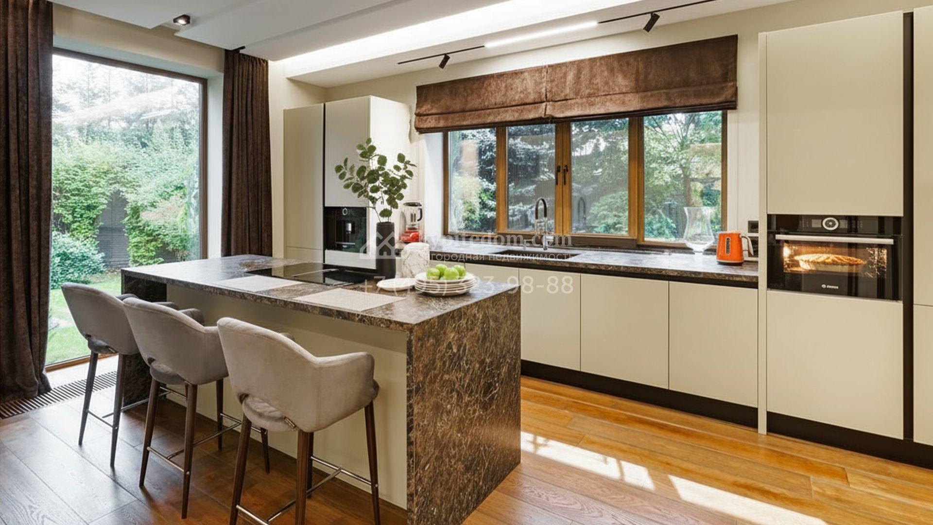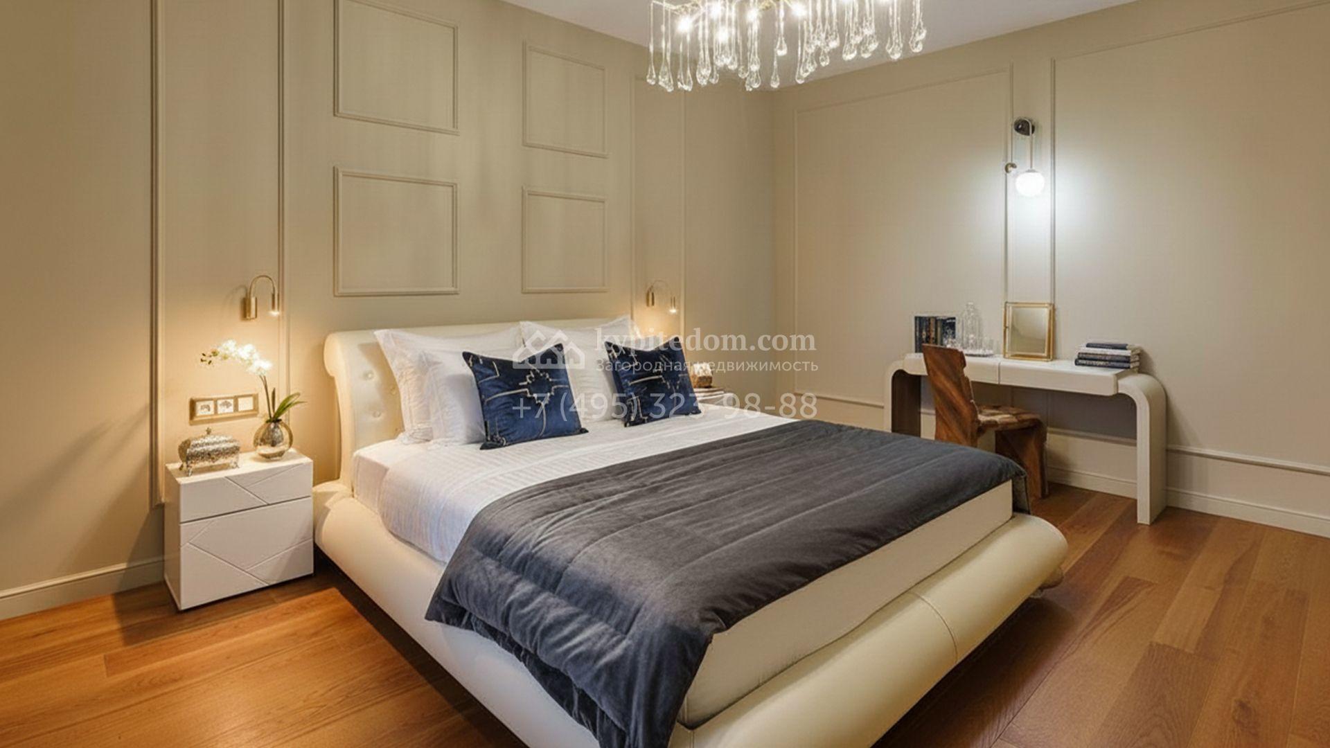 Внутренние пространства выдержаны в спокойной светлой палитре, где гармонично сочетаются фактуры камня и дерева. Дом украшают изящные молдинги, красивые люстры и стильные предметы декора. Комфортная мебель, встроенная бытовая техника Bosch и система кондиционирования формируют идеальную среду для жизни. Планировка включает просторную гостиную с камином, кухню с функциональным островом, пять уютных спален, кинотеатр с баром и спа-зону с бассейном и хаммамом. Дополнительными преимуществами стали встроенный четырёхместный гараж и квартира для персонала.