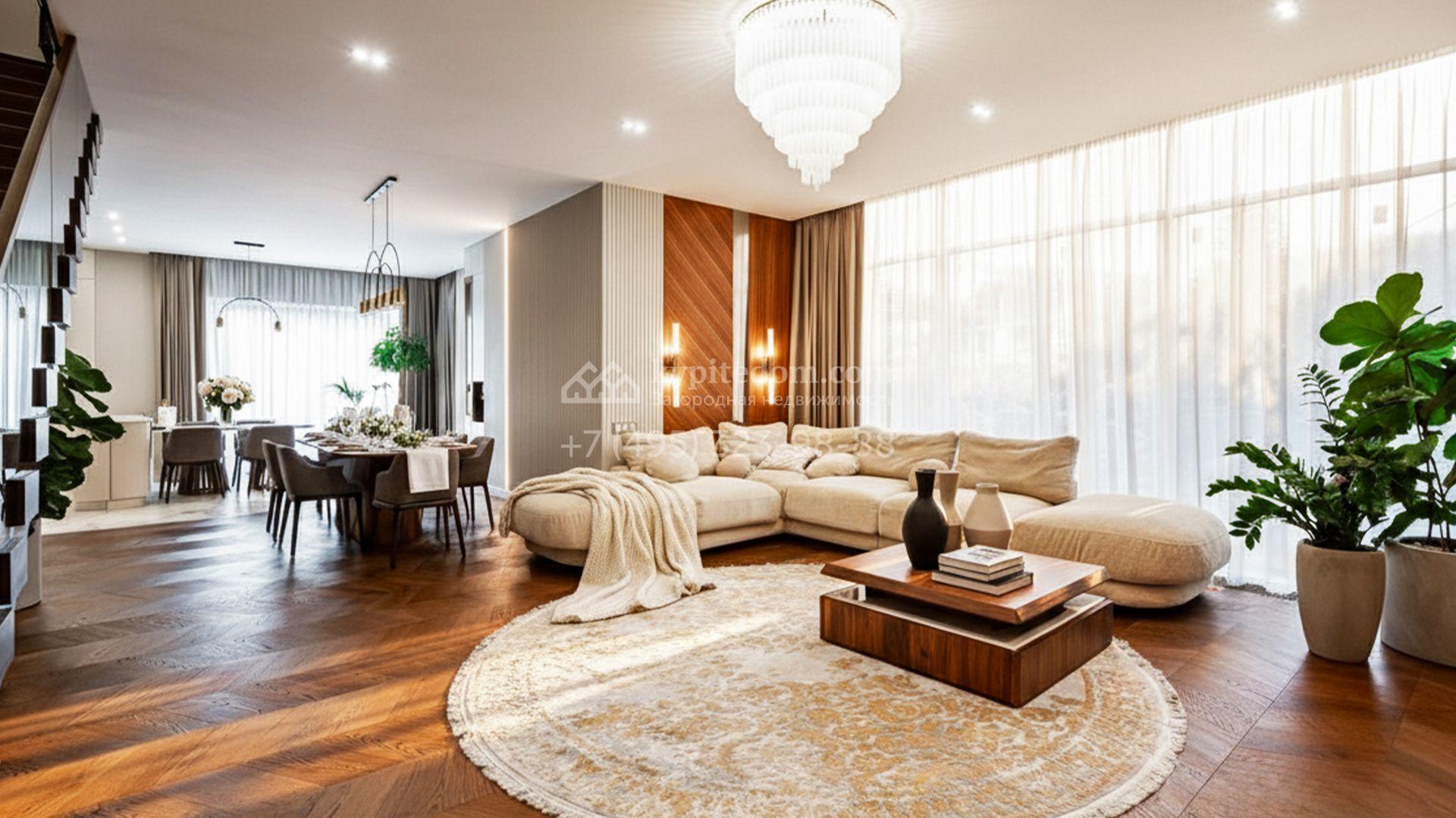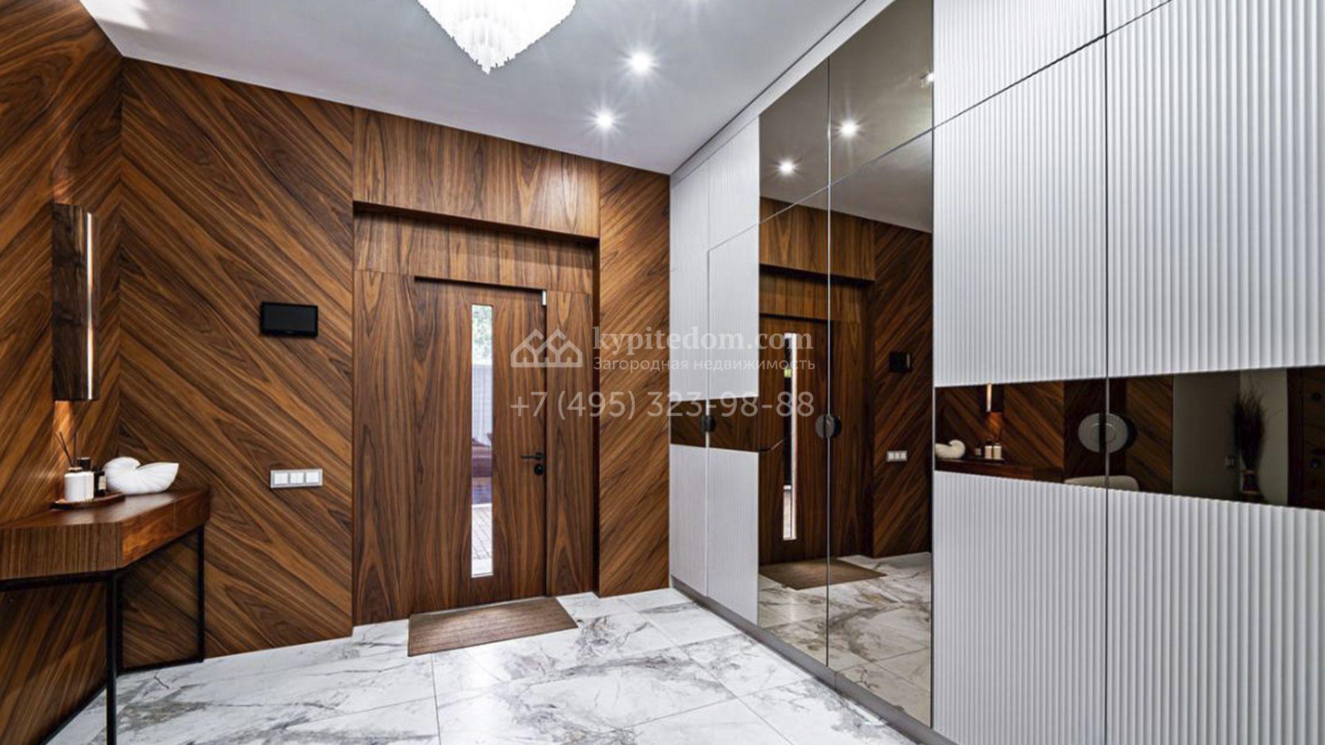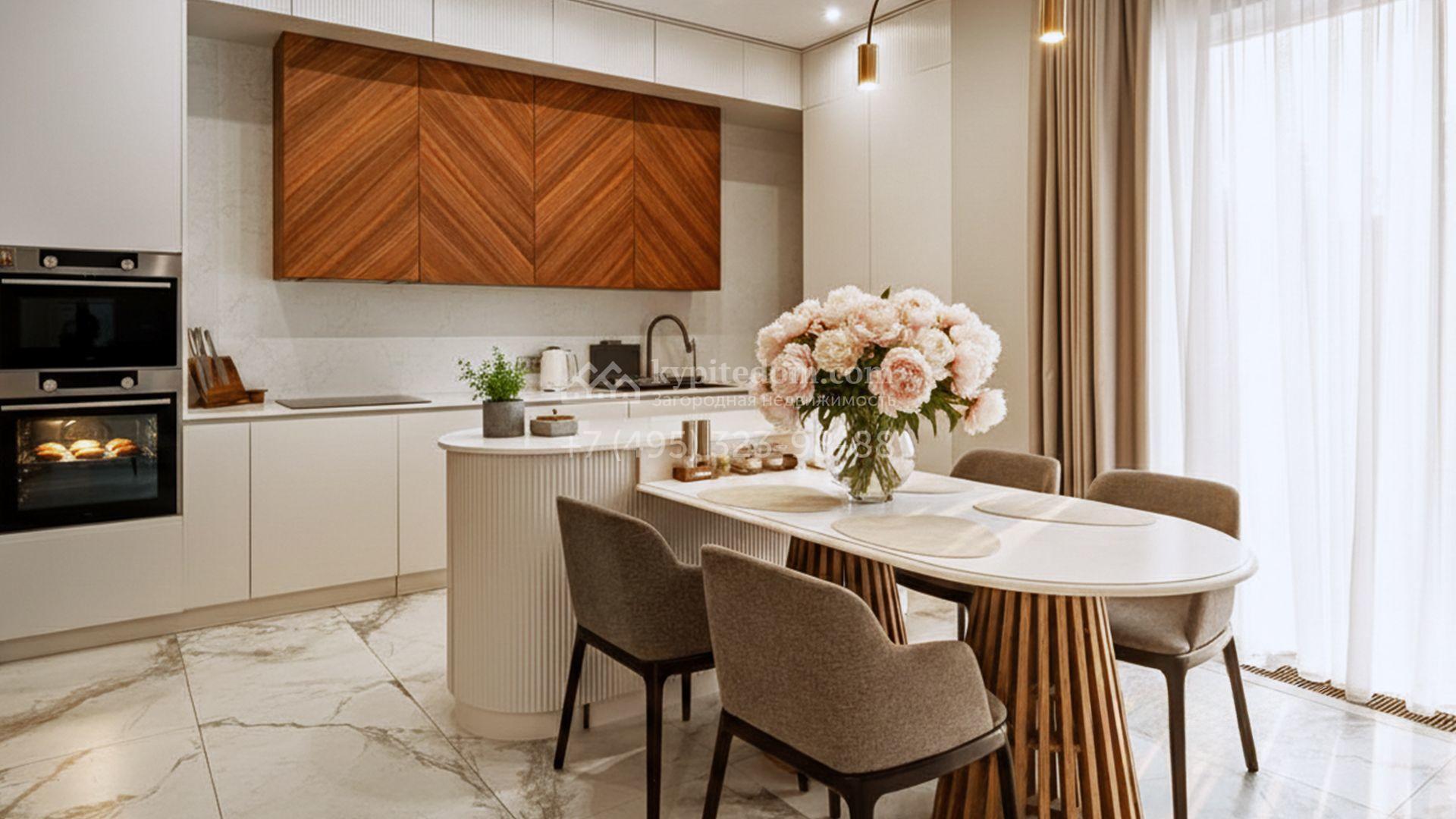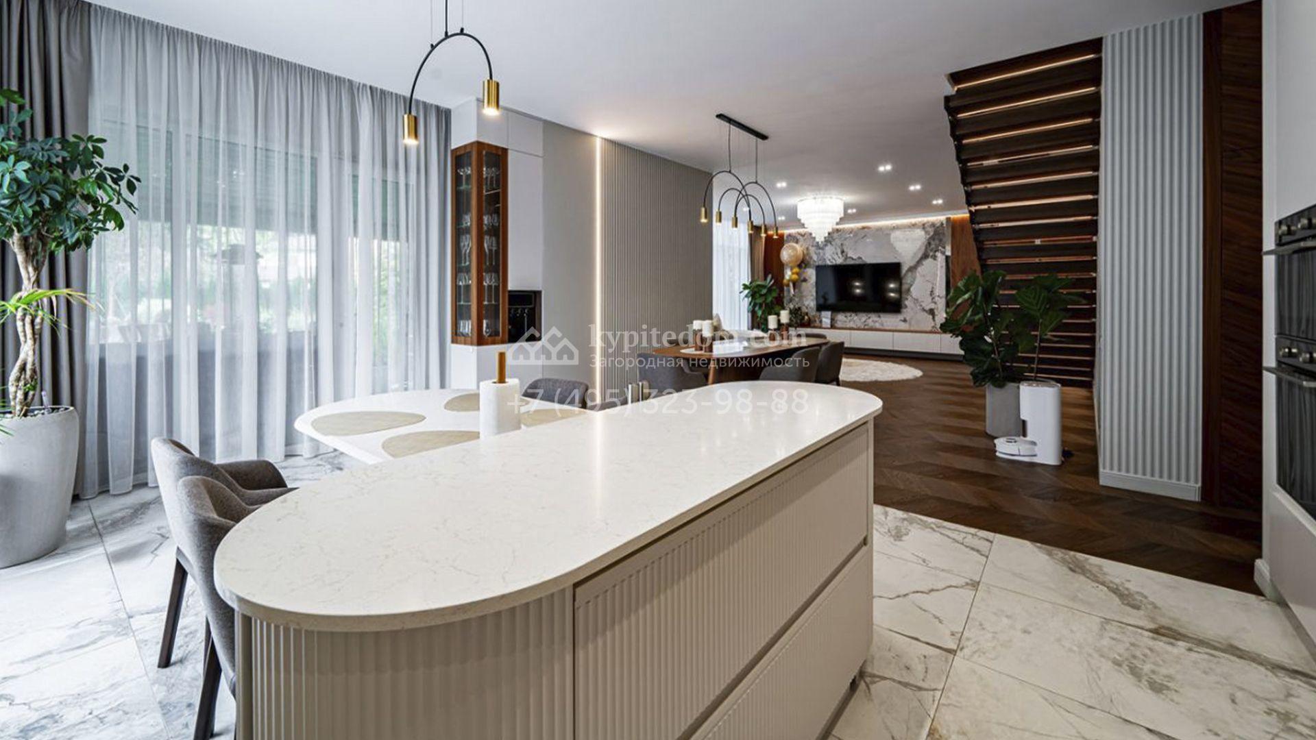 Загородный коттедж площадью 357 м² расположен на полевом участке 10 соток. Современный фасад облицован клинкерным кирпичом и планками с благородной фактурой дерева. Панорамные окна наполняют дом солнцем и визуально расширяют внутренние пространства. Стильные интерьеры выдержаны в светлых тонах, украшены элегатными молдингами, эффектными стеновыми панно и изящными люстрами, а также укомплектованы комфортной мебелью и бытовой техникой. Система кондиционирования круглый год поддерживает идеальный микроклимат.