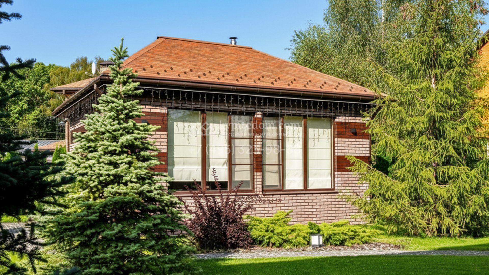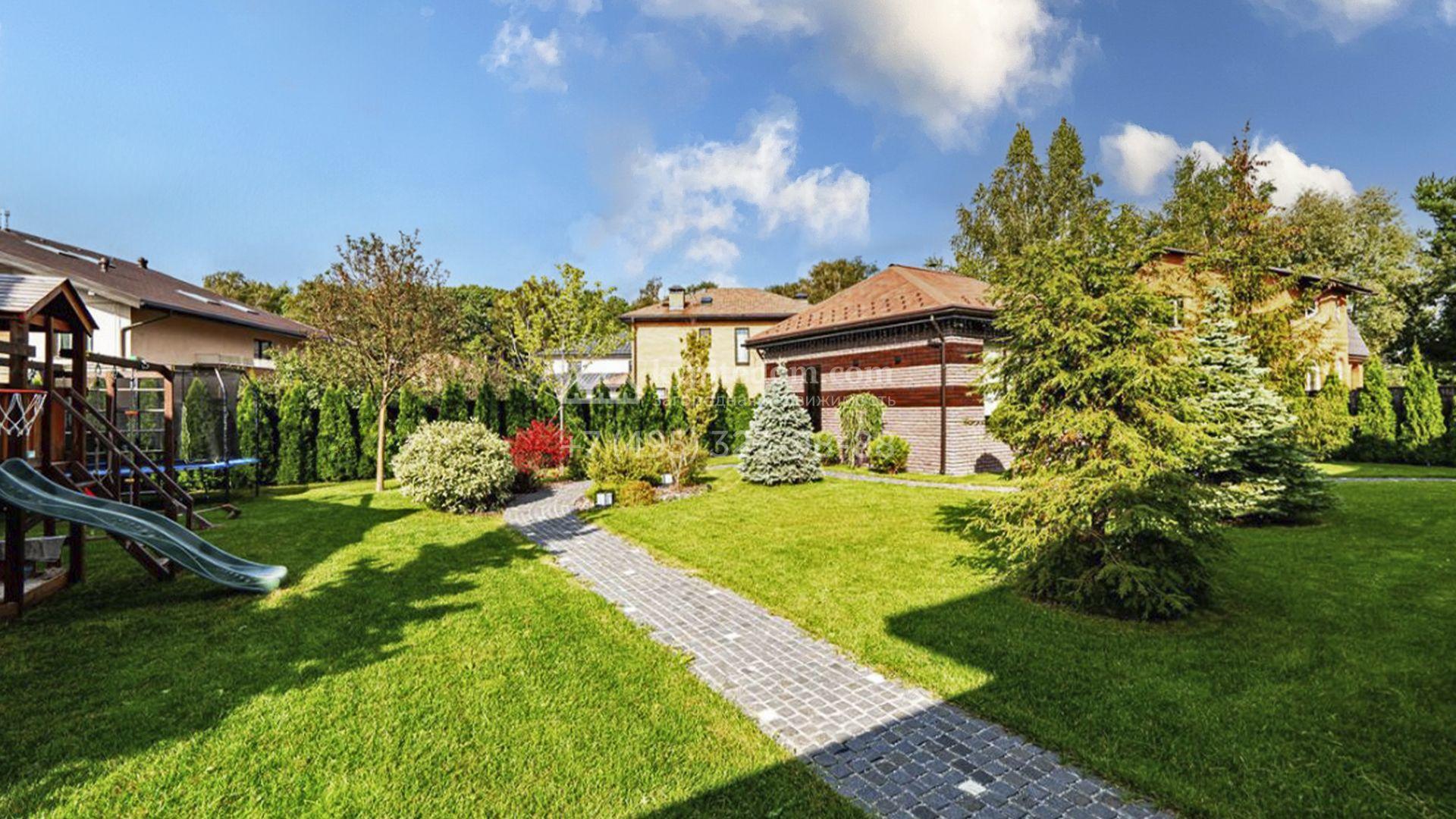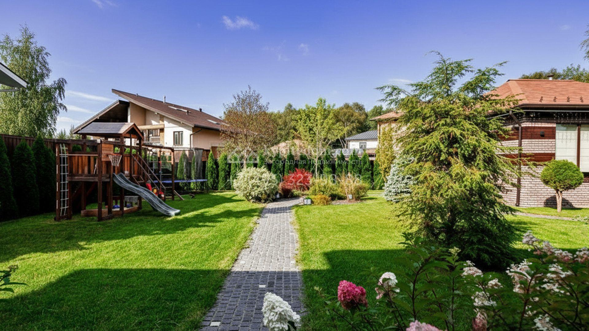 Планировка включает просторную кухню-гостиную, пять спален и приватный кабинет для работы. На уютной застеклённой террасе будет приятно провести вечер в кругу семьи и друзей. Оставить машины можно во встроенном гараже. Кроме того, на территории построена баня площадью 50 м². На участке вдохните запах свежескошенной травы, прогуливаясь по мощёным дорожкам в тени деревьев, и любуйтесь декоративными кустарниками, а для активных игр на свежем воздухе предусмотрена детская площадка.