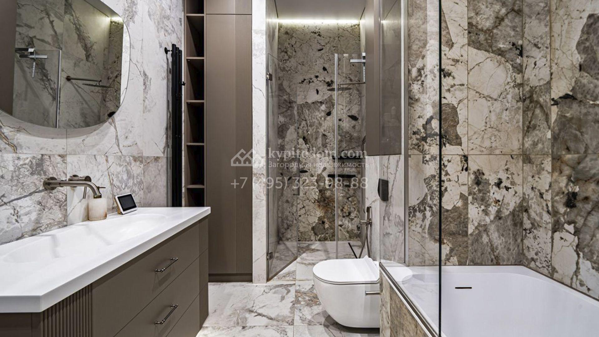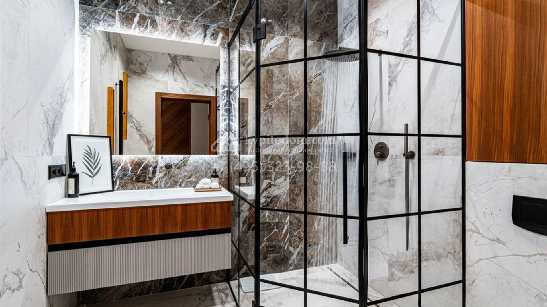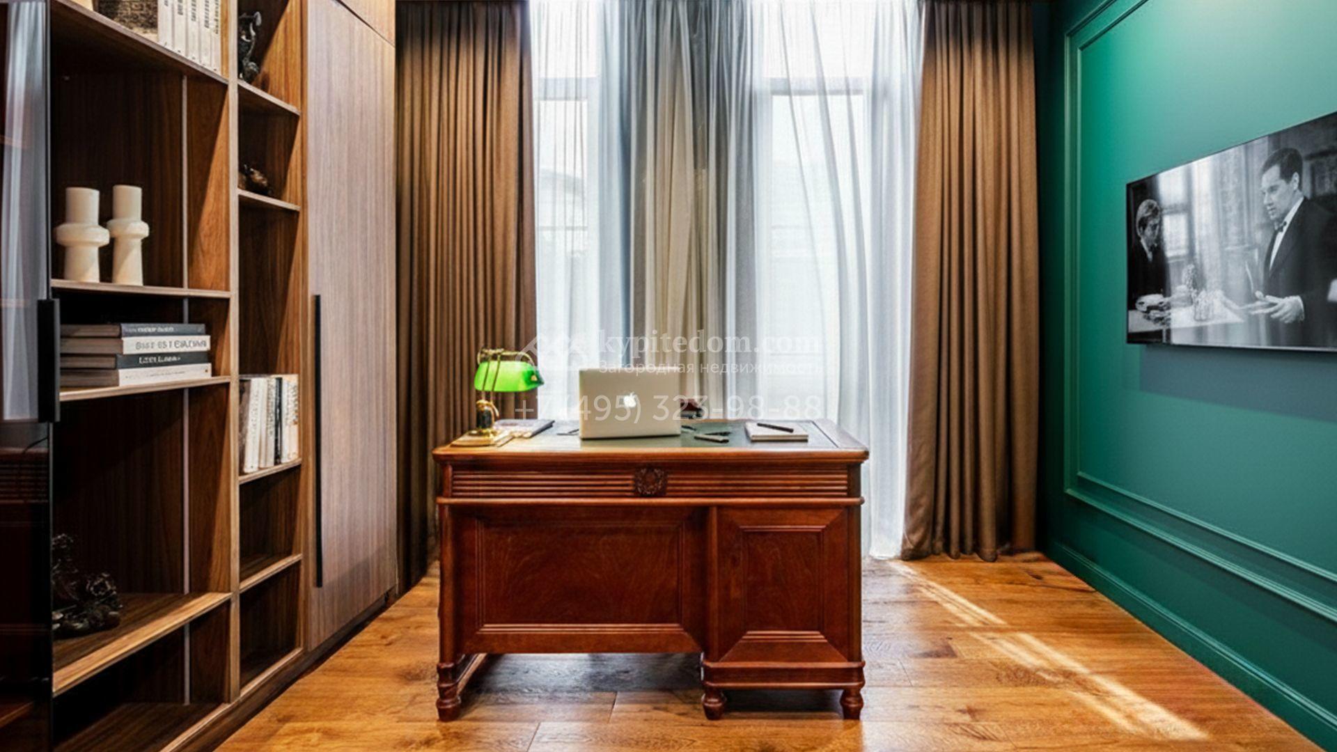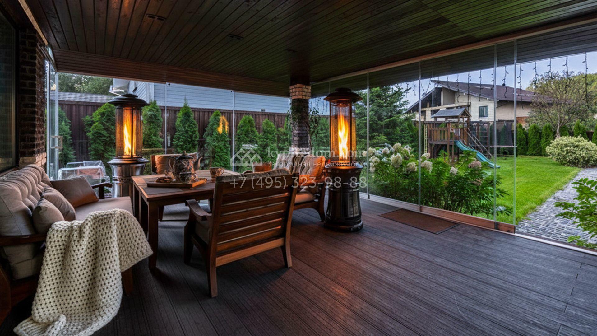 Планировка включает просторную кухню-гостиную, пять спален и приватный кабинет для работы. На уютной застеклённой террасе будет приятно провести вечер в кругу семьи и друзей. Оставить машины можно во встроенном гараже. Кроме того, на территории построена баня площадью 50 м². На участке вдохните запах свежескошенной травы, прогуливаясь по мощёным дорожкам в тени деревьев, и любуйтесь декоративными кустарниками, а для активных игр на свежем воздухе предусмотрена детская площадка.