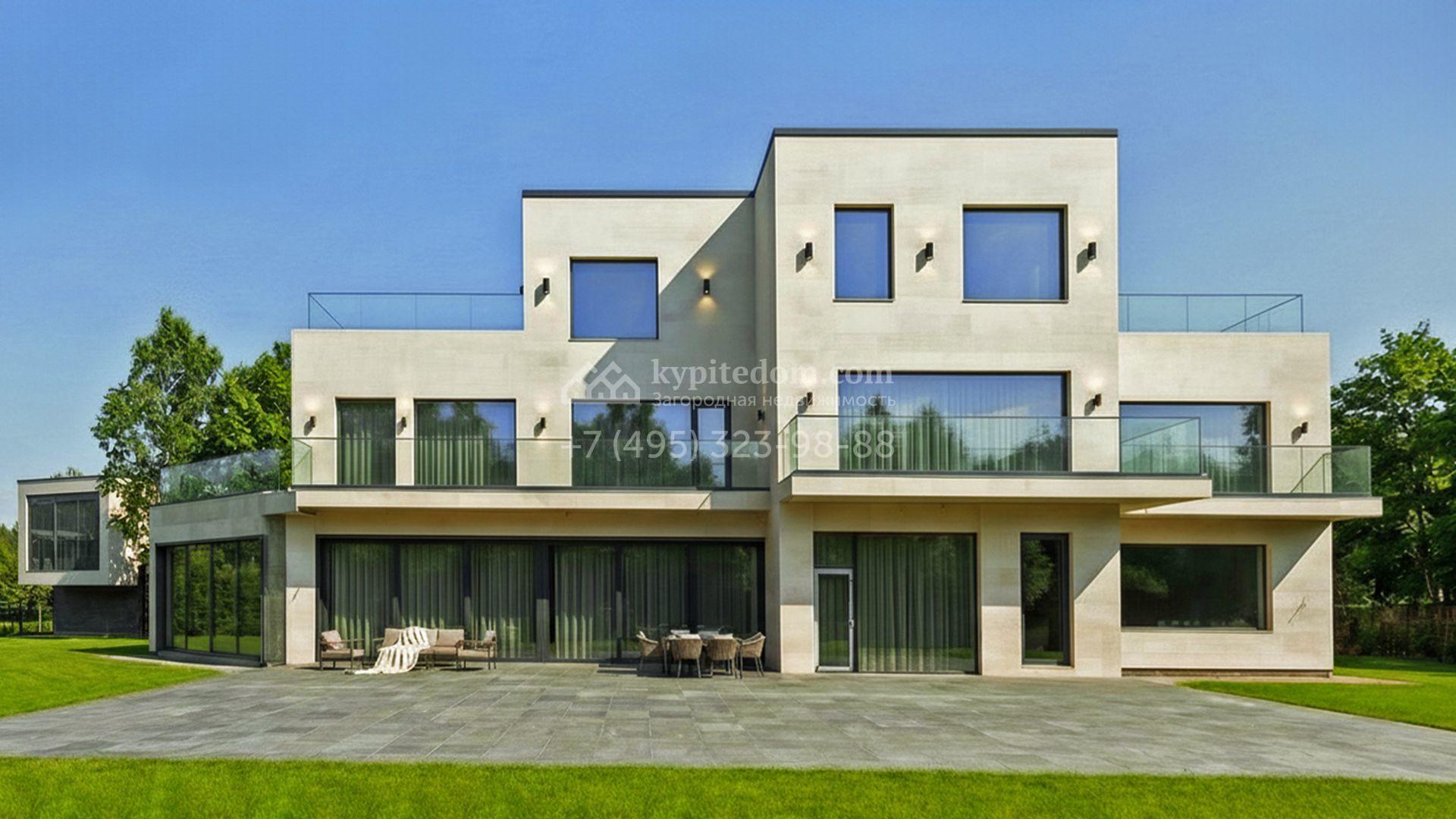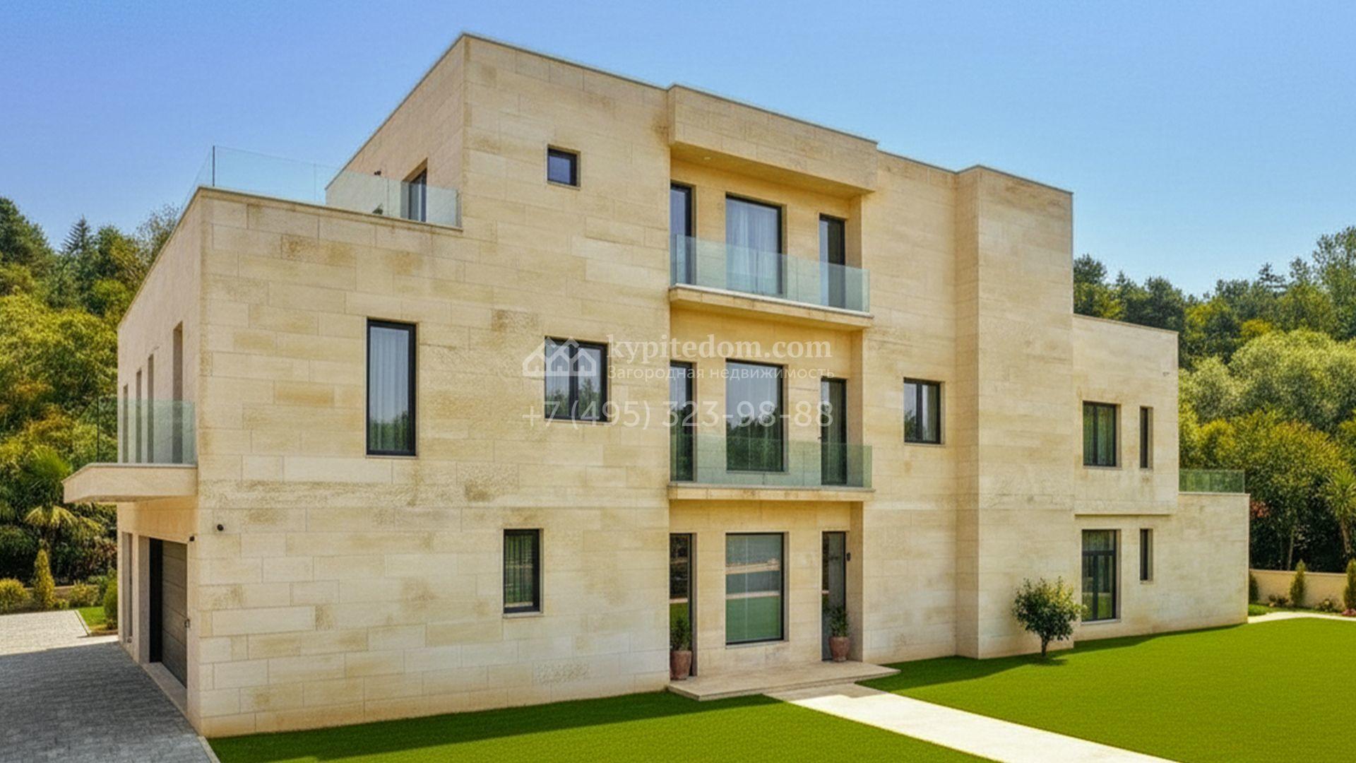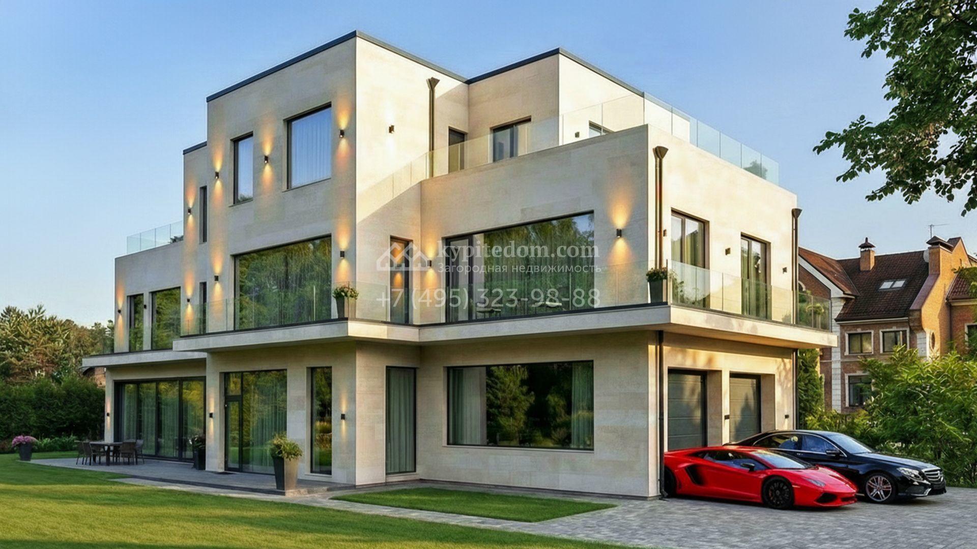 Сердцем дома стала зона первого этажа, где разместили просторную кухню-гостиную с камином, столовую для приёма 8-10 гостей, кабинет и гостевую спальню. Второй уровень представляет собой приватную семейную зону, вмещающую мастер-спальню с вместительной гардеробной и три дополнительные спальни. Третий этаж полностью посвящён отдыху — здесь вас ждут современный тренажёрный зал, сауна, хаммам, гостиная для вечеринок и две большие террасы, на одной из которых установили джакузи. Особый комфорт обеспечивают лифт, отдельный блок для персонала и встроенный двухместный гараж. Благоустроенный участок завершает гармоничную картину — здесь засеян аккуратный газон, вымощены дорожки и высажены деревья.