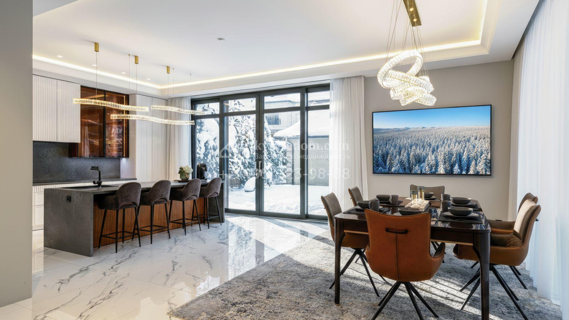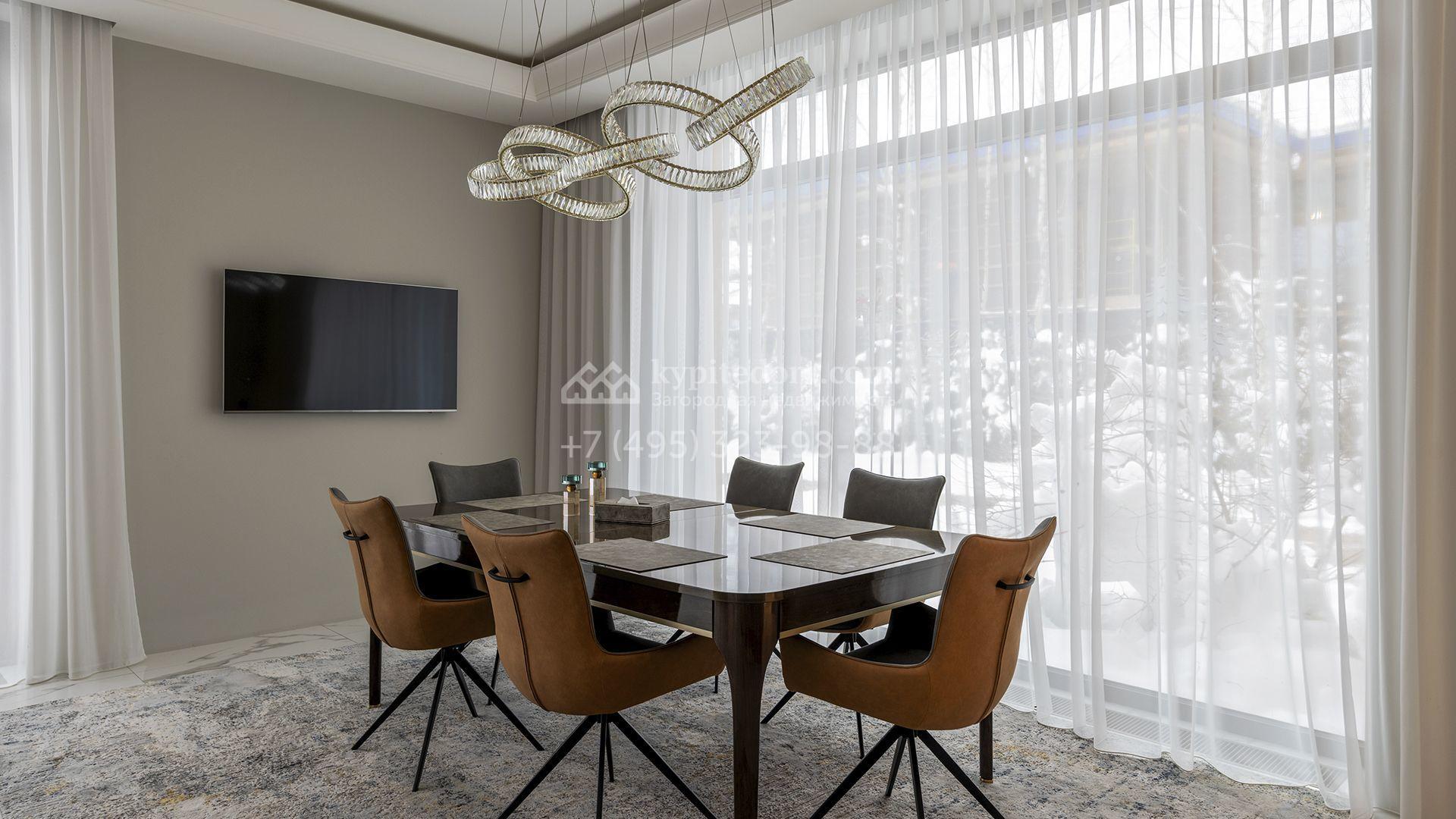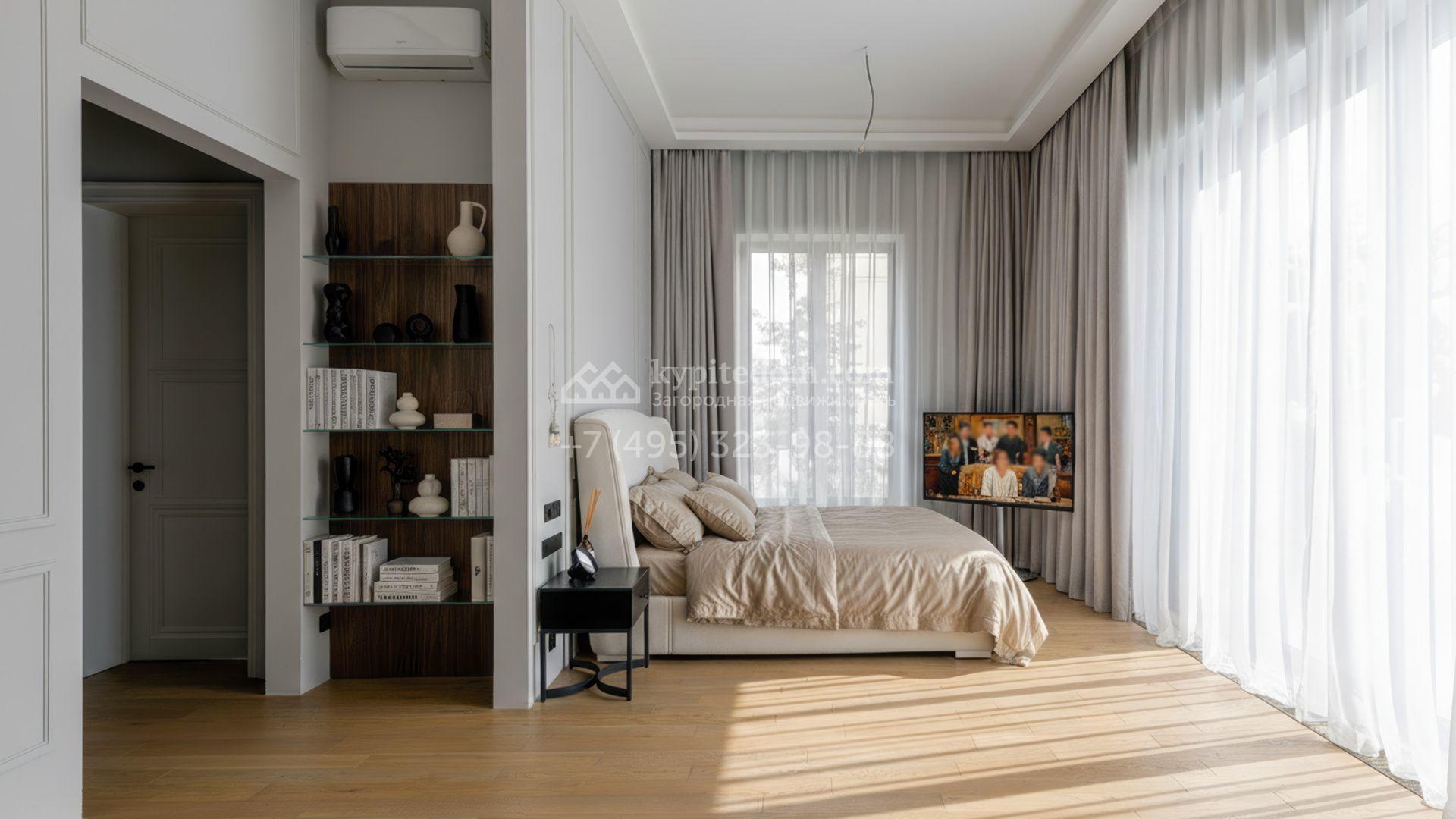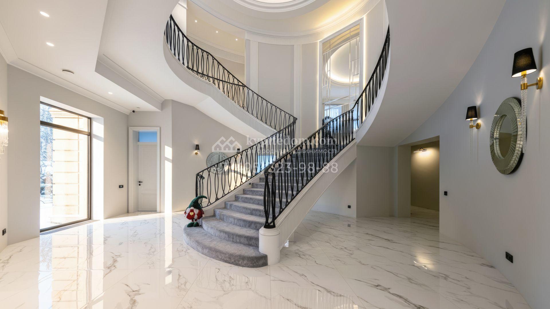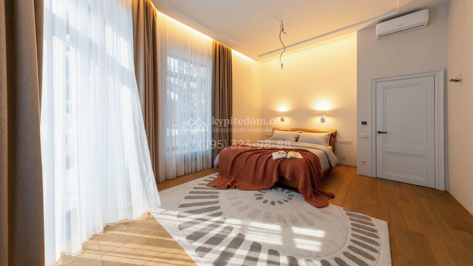 Загородный коттедж площадью 600 м² расположен на участке 26 соток рядом с живописным лесом. Его архитектура выполнена в благородном неоклассическом стиле: фасад, облицованный натуральным камнем, украшен изящной рустовкой, пилястрами и эркерами. Современным акцентом стало тройное панорамное остекление Schuco, наполняющее внутренние пространства солнечными лучами и ощущением простора. Элегантные интерьеры выдержаны в светлых тонах, декорированы молдингами, а также укомплектованы стильной мебелью, встроенной бытовой техникой и современной сантехникой.