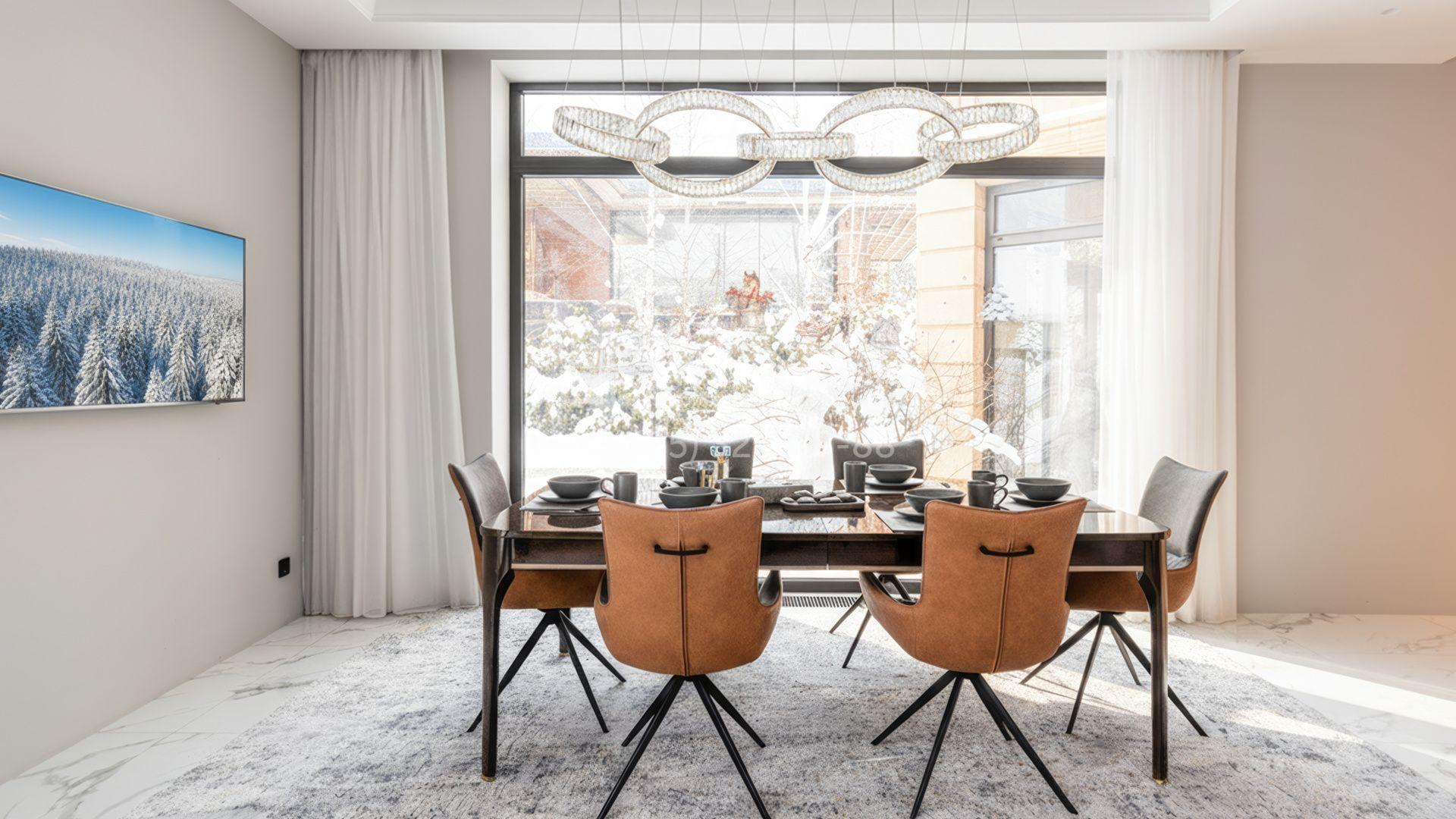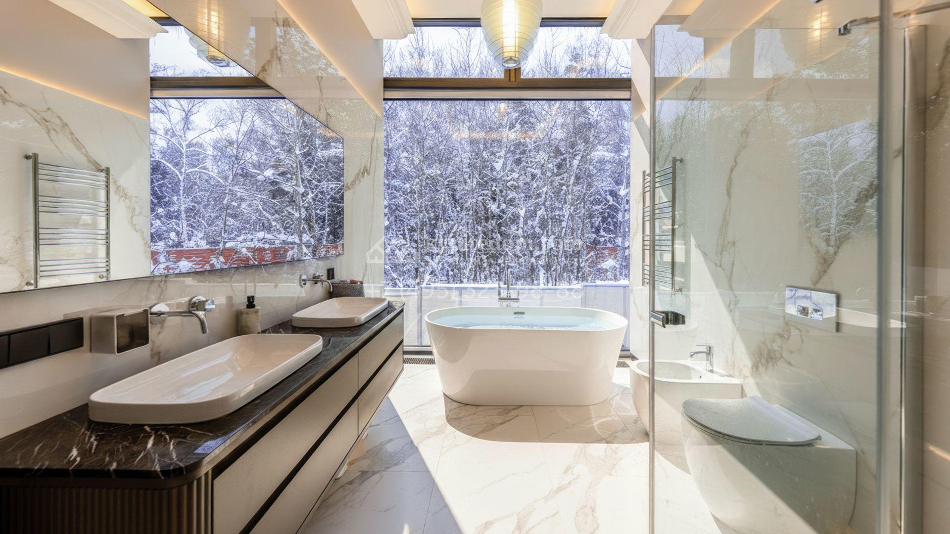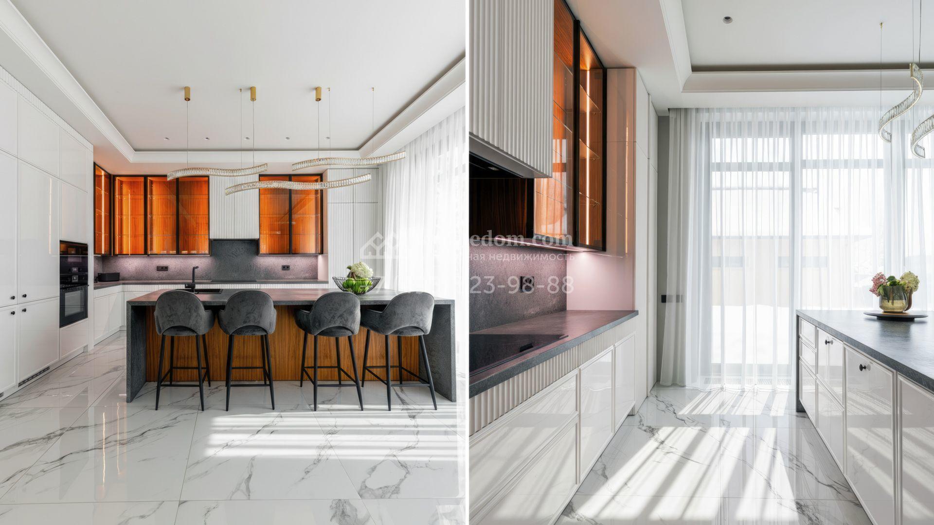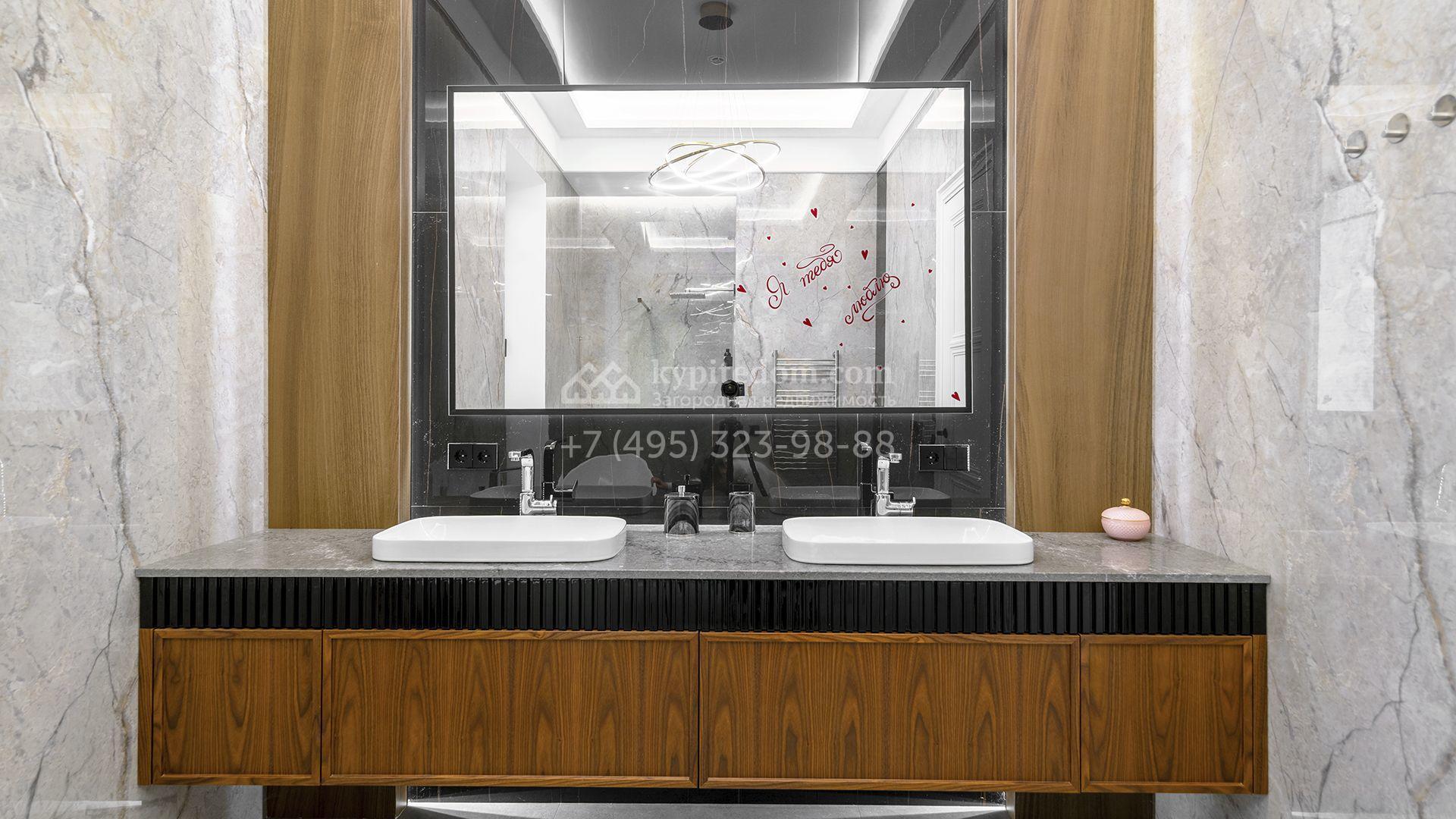 Загородный коттедж площадью 600 м² расположен на участке 26 соток рядом с живописным лесом. Его архитектура выполнена в благородном неоклассическом стиле: фасад, облицованный натуральным камнем, украшен изящной рустовкой, пилястрами и эркерами. Современным акцентом стало тройное панорамное остекление Schuco, наполняющее внутренние пространства солнечными лучами и ощущением простора. Элегантные интерьеры выдержаны в светлых тонах, декорированы молдингами, а также укомплектованы стильной мебелью, встроенной бытовой техникой и современной сантехникой.