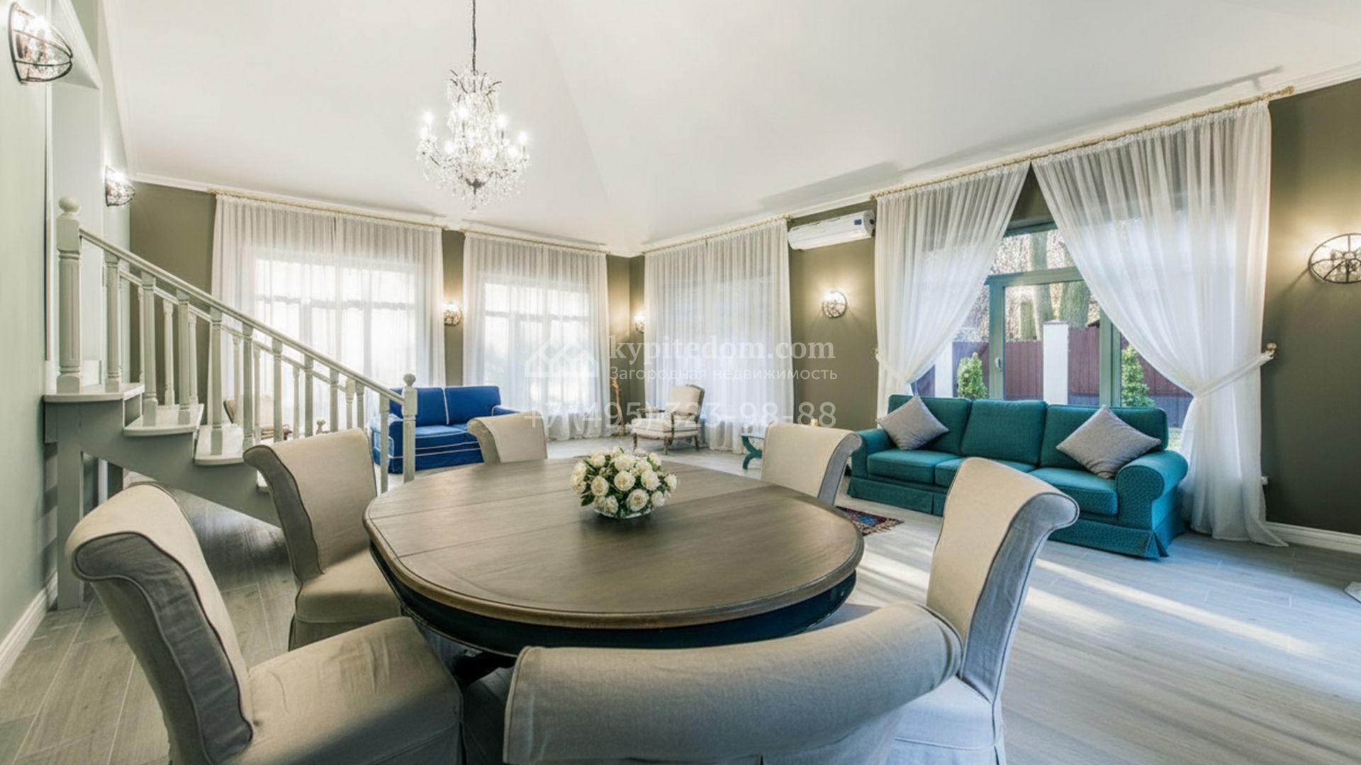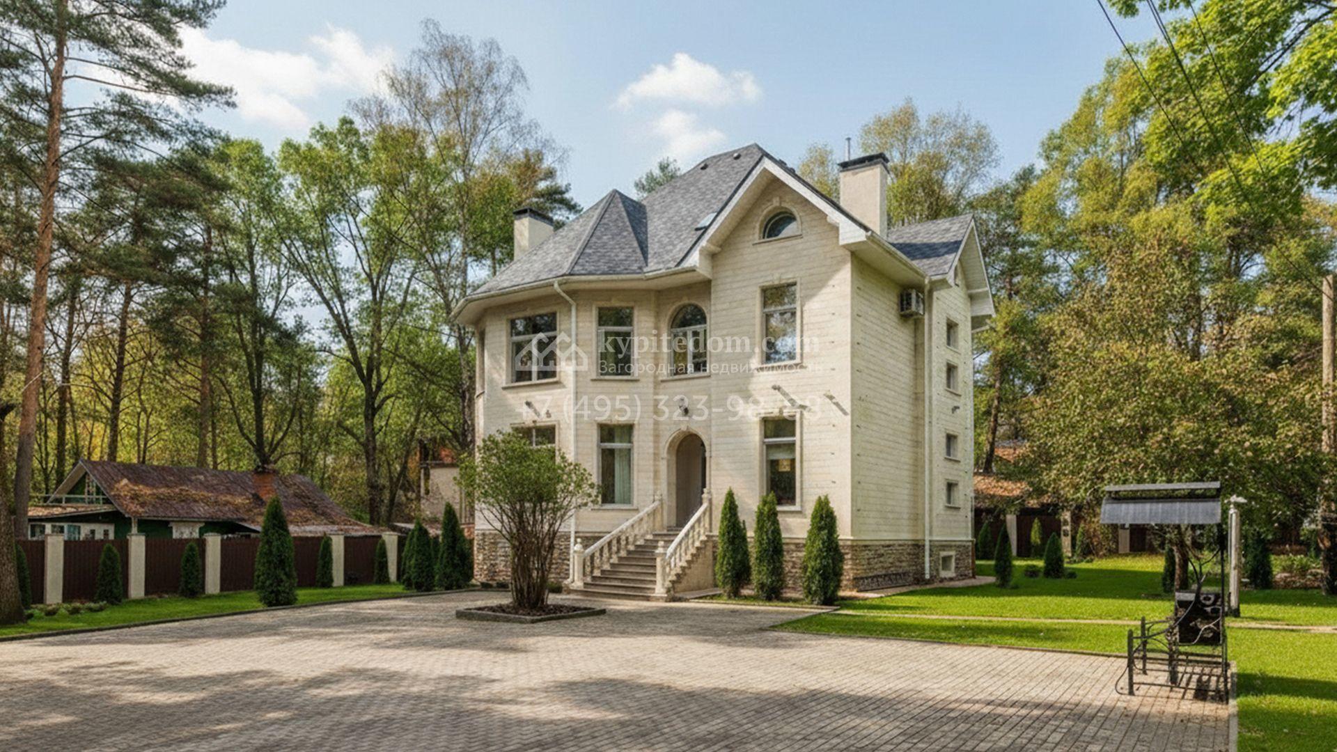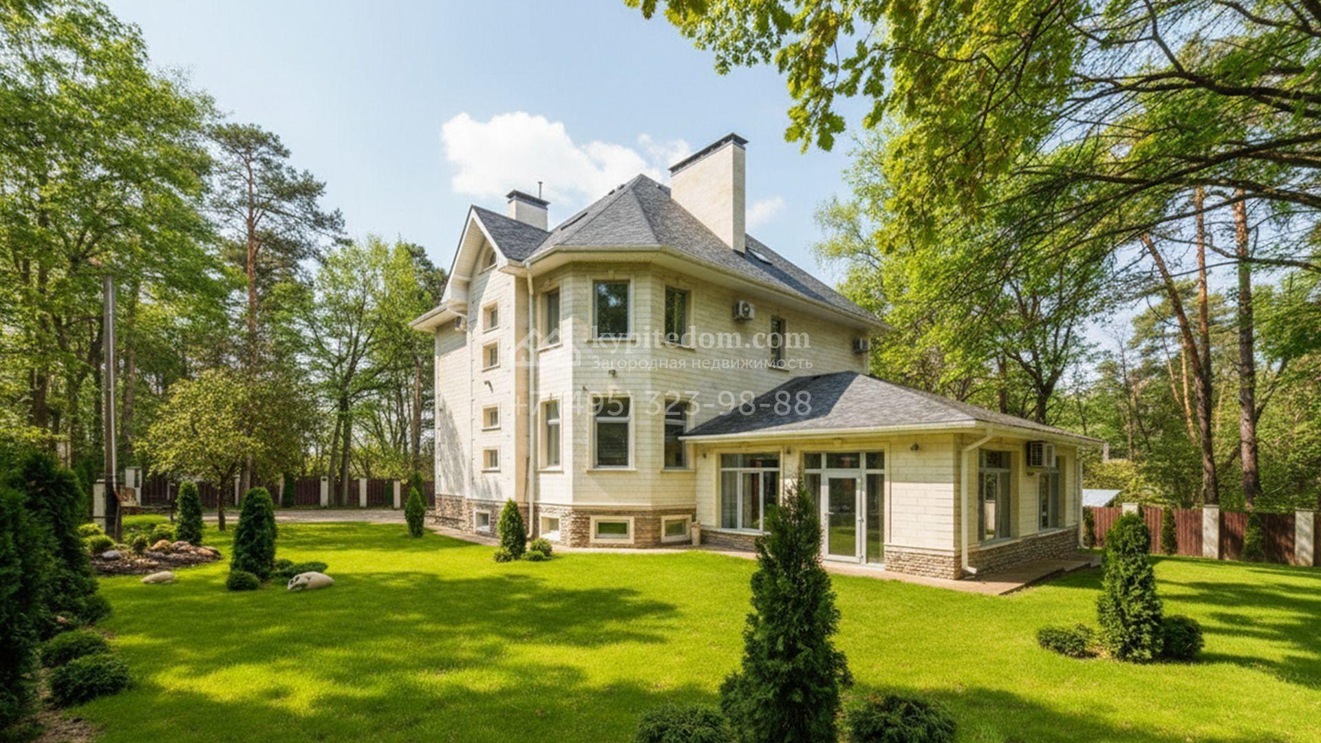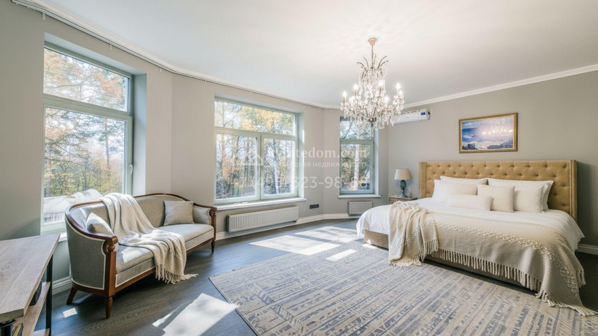 Внутренние пространства выдержаны в неоклассической стилистике с нейтральной палитрой. Панорамные окна раскрывают вид на участок и наполняют помещения дневным светом. Планировка включает пять спален, гостиную с камином, кухню-столовую, приватные комнаты отдыха, сауну и отдельный блок для персонала с собственным входом. Участок оформлен газоном и хвойными насаждениями. На территории размещены зона барбекю и навес для автомобилей.