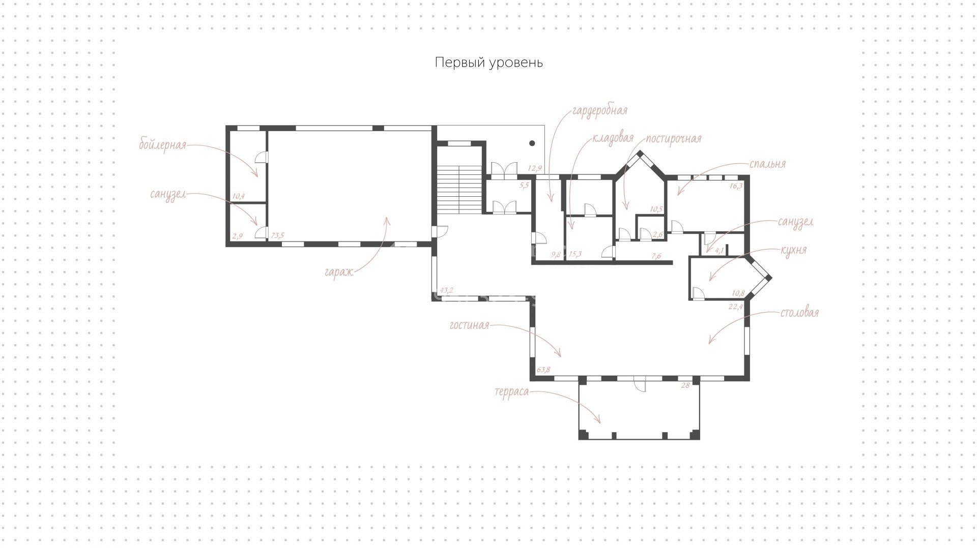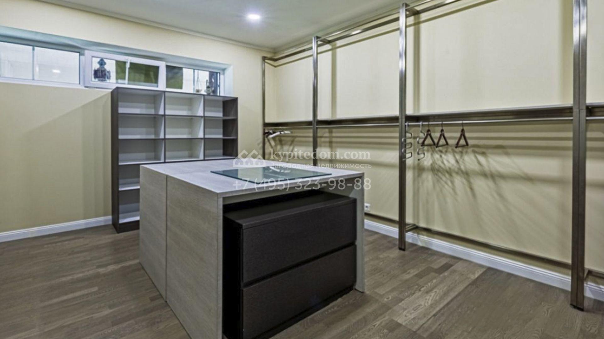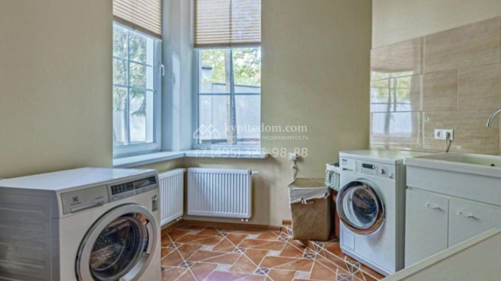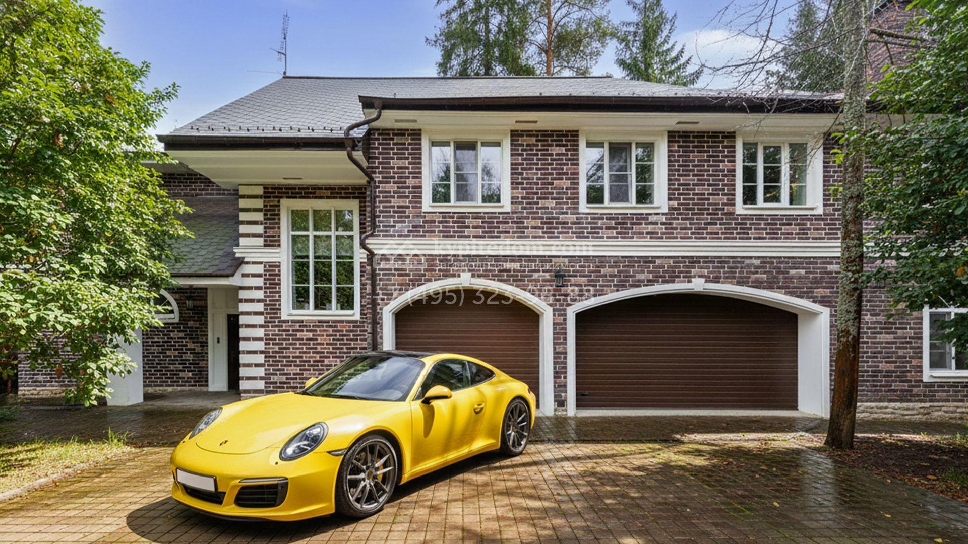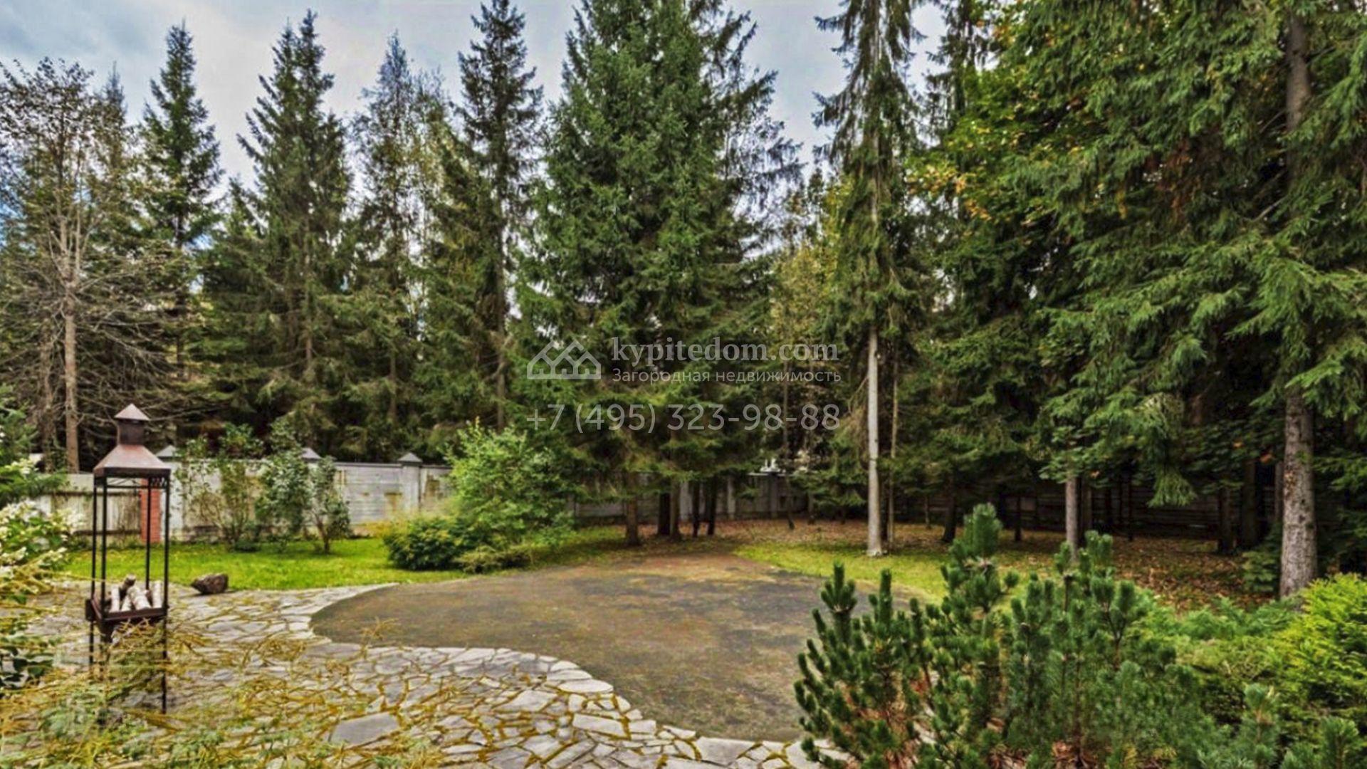 Планировка первого этажа включает эффектную гостиную-столовую с двухсторонним камином, кухню и спальню. На втором уровне разместили холл-библиотеку, мастер-блок с тремя спальнями с собственными гардеробными, тренажёрным залом и зимним садом, а также гостевой блок с тремя спальнями. Дополнительными преимуществами стали встроенный трёхместный гараж, открытая парковка и квартира для персонала с отдельным входом. На участке выполнен ландшафтный дизайн — здесь засеян аккуратный газон, растут высокие хвойные деревья и проложены дорожки. Для отдыха на свежем воздухе обустроены площадка со специальным покрытием и уютная мангальная зона.