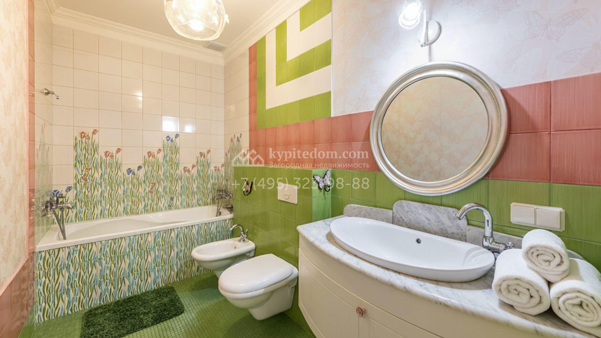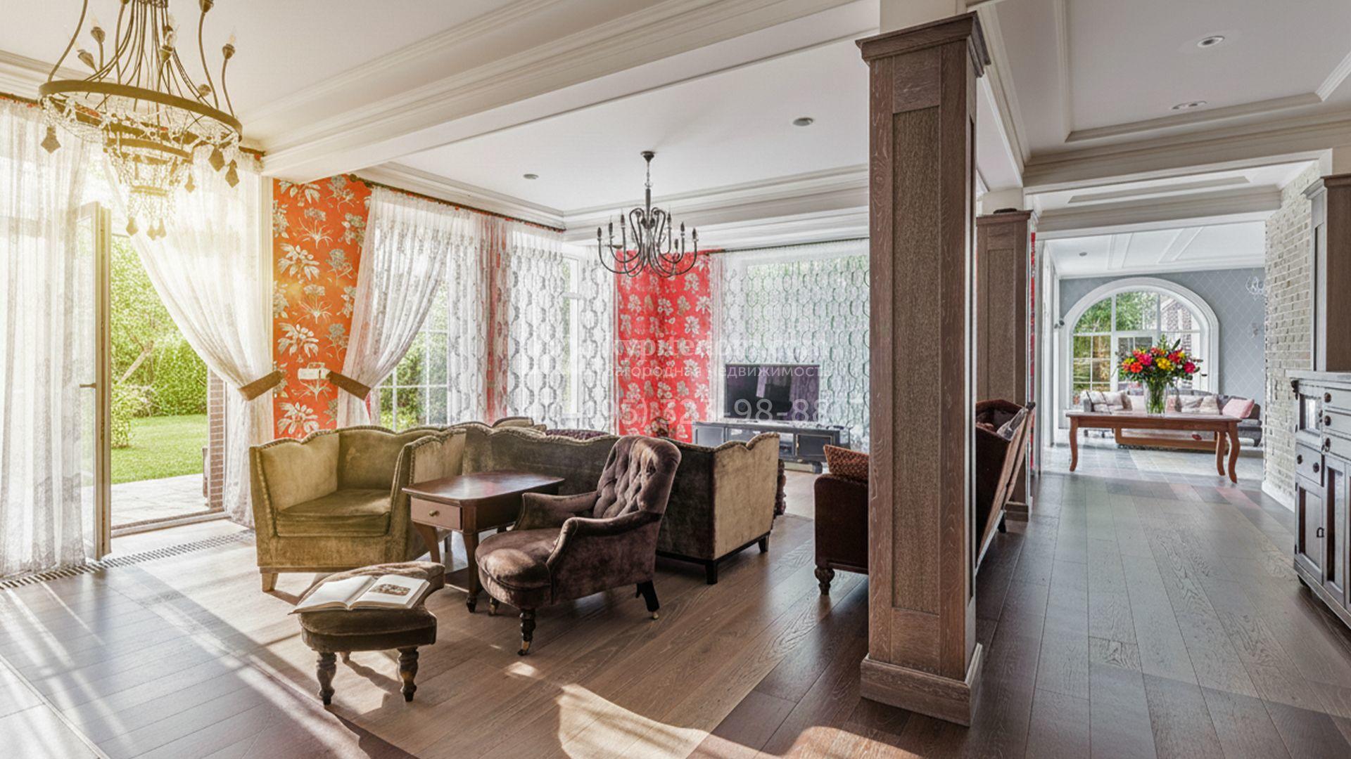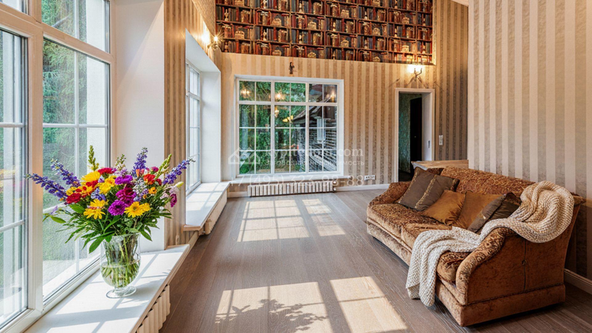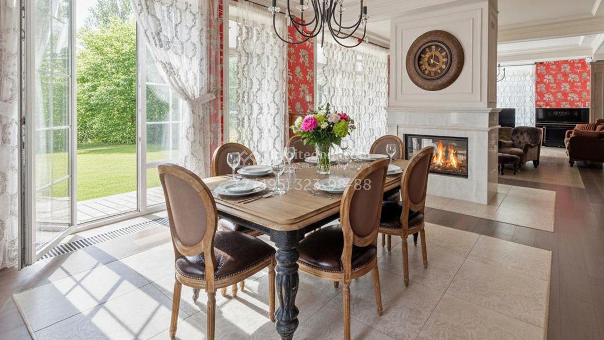 Загородный коттедж площадью 690 м² расположен на живописном лесном участке 25 соток. Фасад, выполненный в английском стиле, облицован благородным клинкерным кирпичом и украшен контрастными белыми колоннами, рустовкой, наличниками и замковым камнем. Большие панорамные окна и высокие потолки создают ощущение простора и свободы. Интерьеры, сочетающие яркие и спокойные тона, отделаны с использованием натуральных материалов и обоев с элегантными принтами. Дом полностью укомплектован комфортной мебелью, изящными предметами декора и встроенной бытовой техникой.