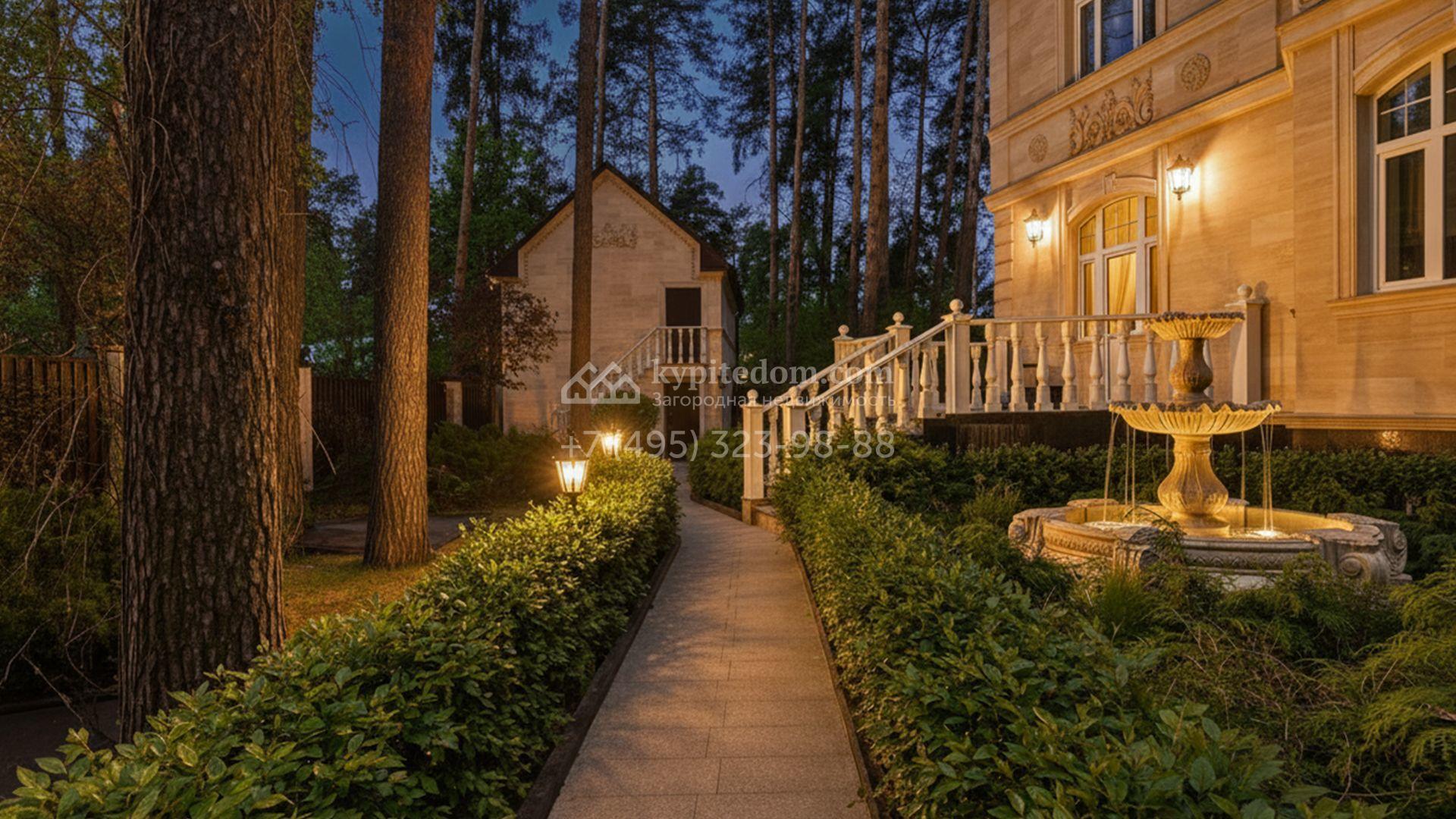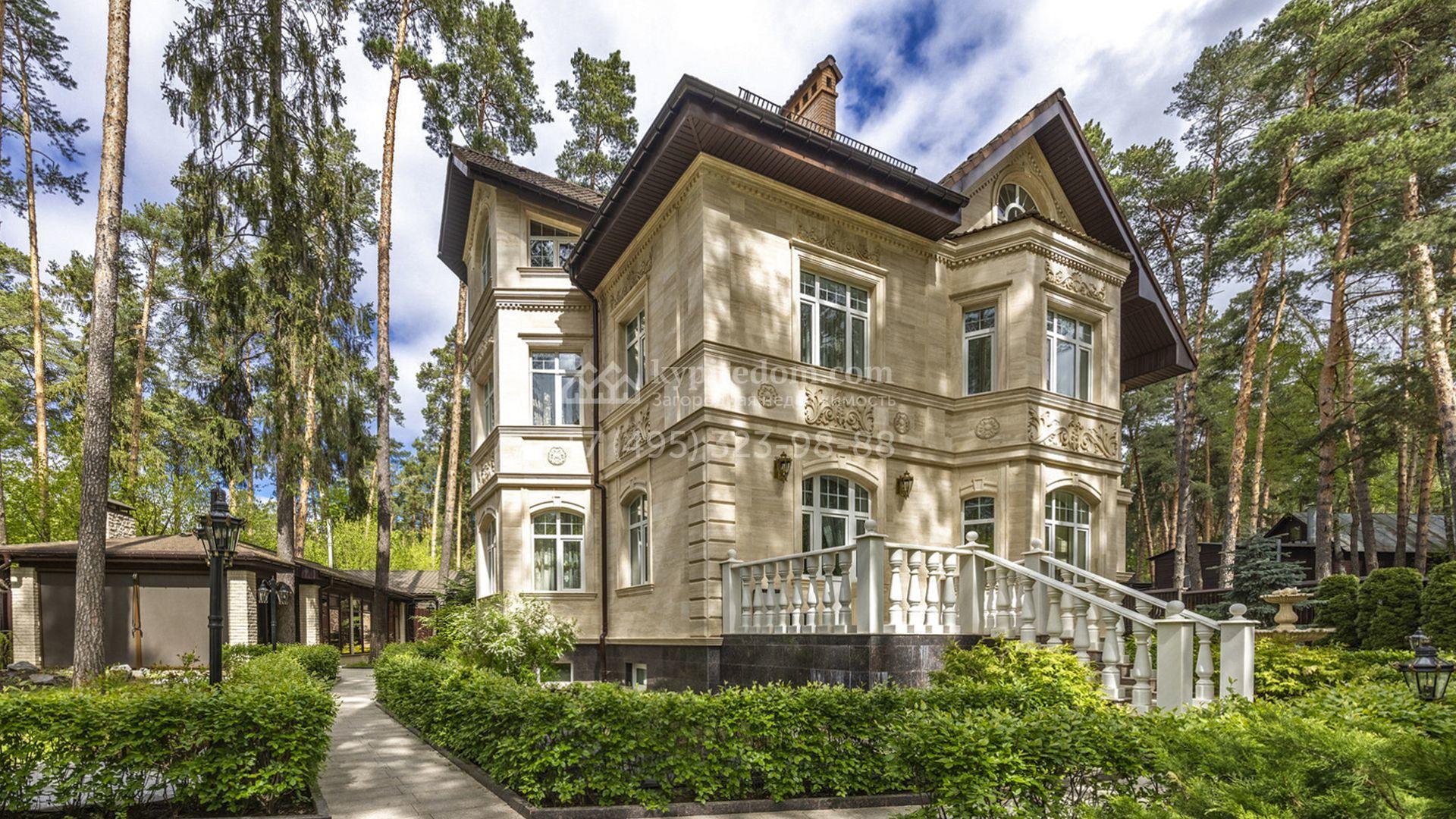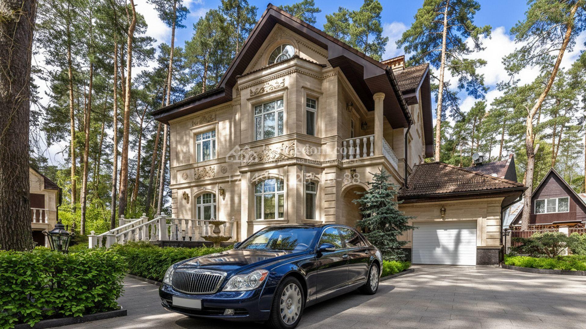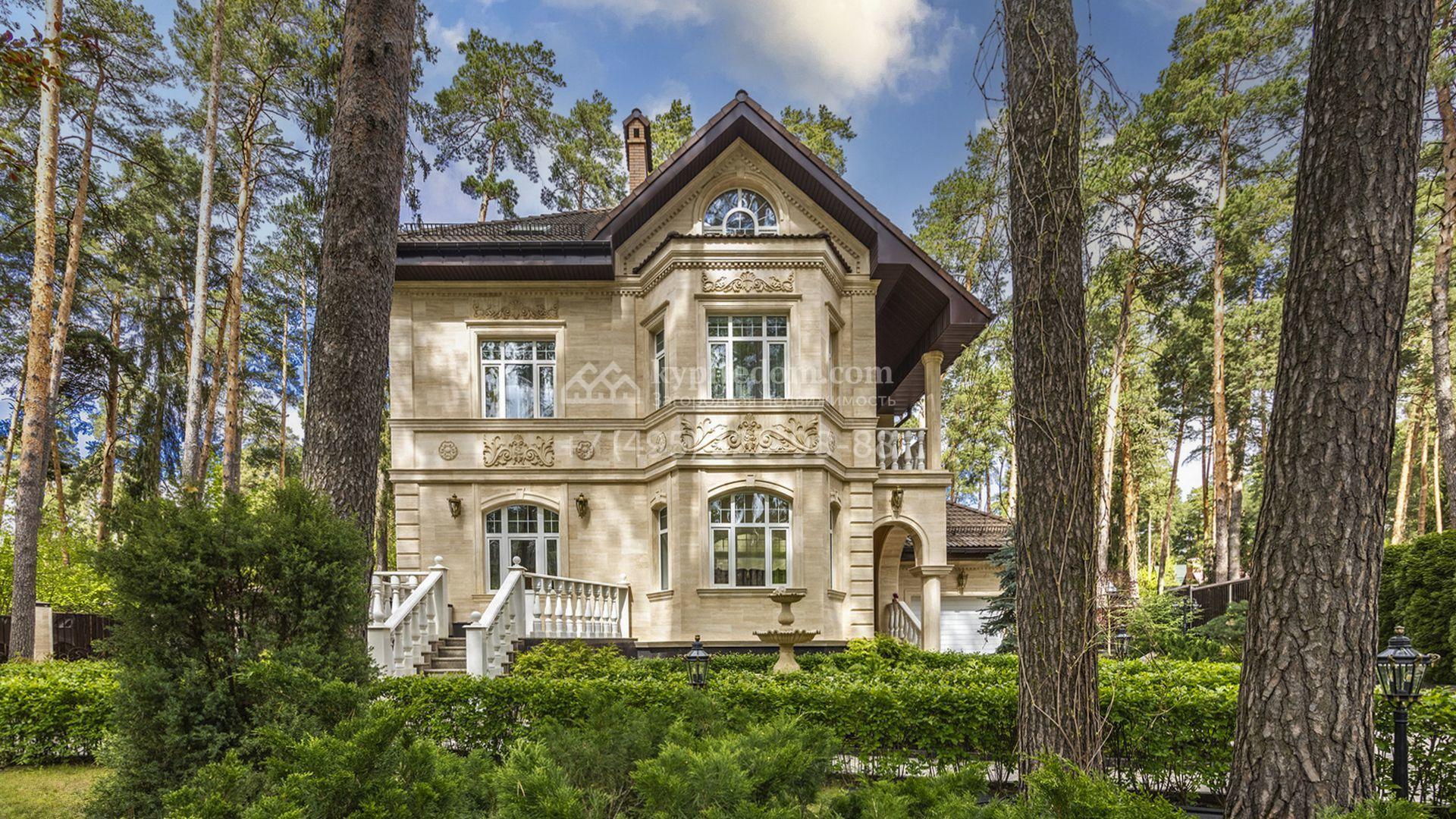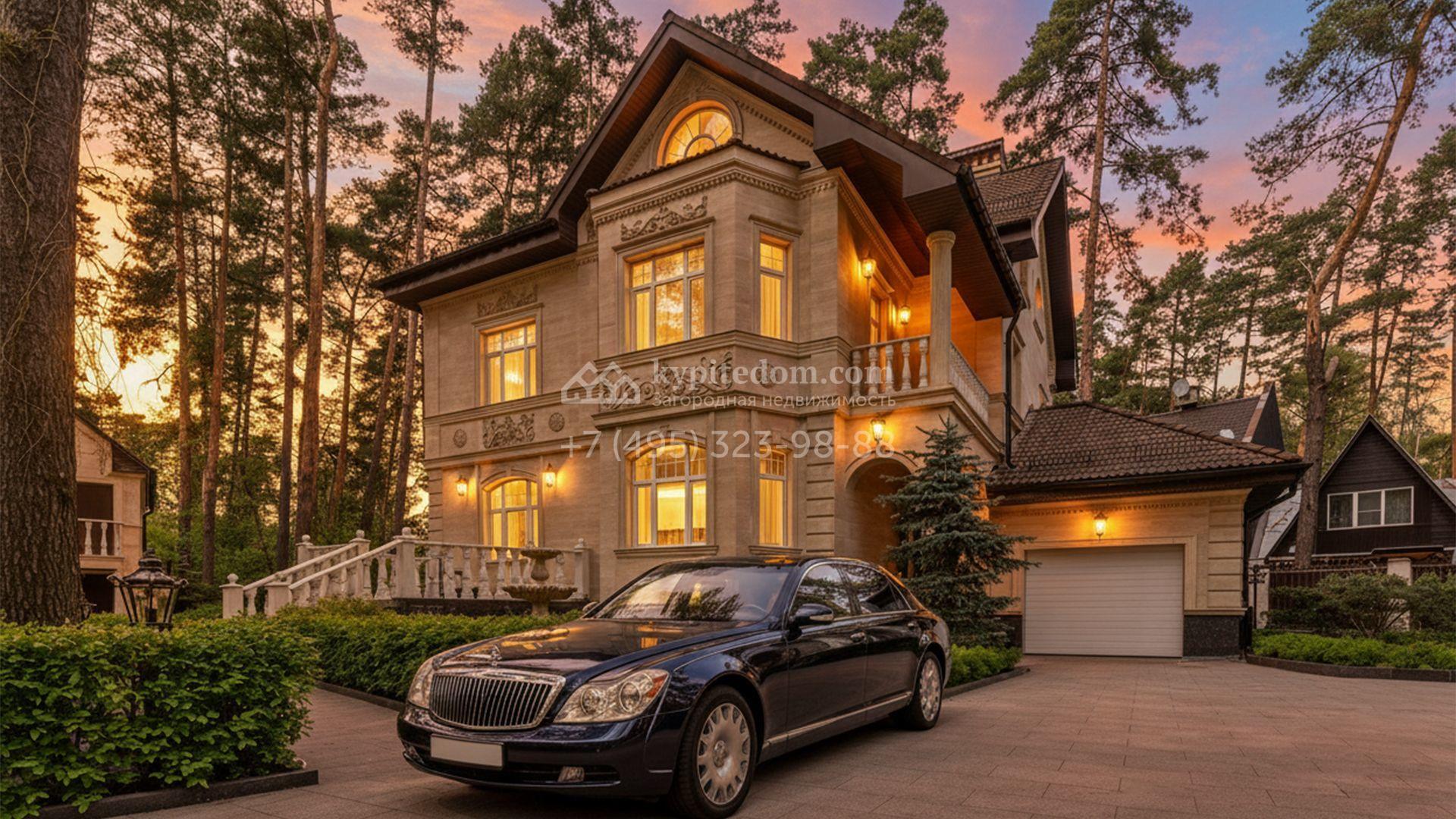 Загородный коттедж площадью 400 м² расположен на живописном лесном участке 12 соток. Фасад, выполненный в классическом стиле, облицован бежевой плиткой с фактурой камня и украшен рустовкой, элегантной лепниной и белоснежными балясинами. Подсветка подчёркивает изящную архитектуру с заходом солнца. Внутреннее убранство гармонично продолжает оформление экстерьера: просторные помещения декорированы пилястрами, молдингами, потолочными розетками и роскошными люстрами. Обстановка дополнена комфортабельной мебелью и встроенной бытовой техникой.