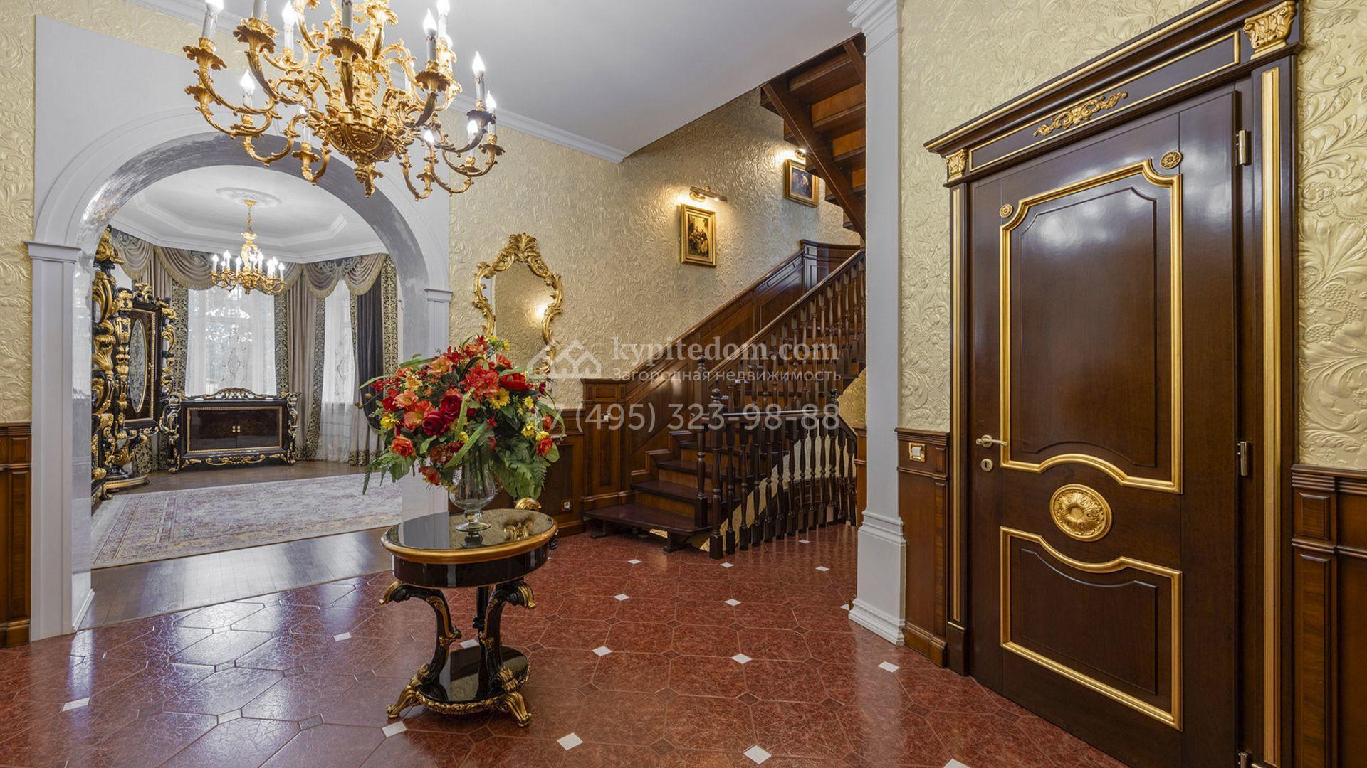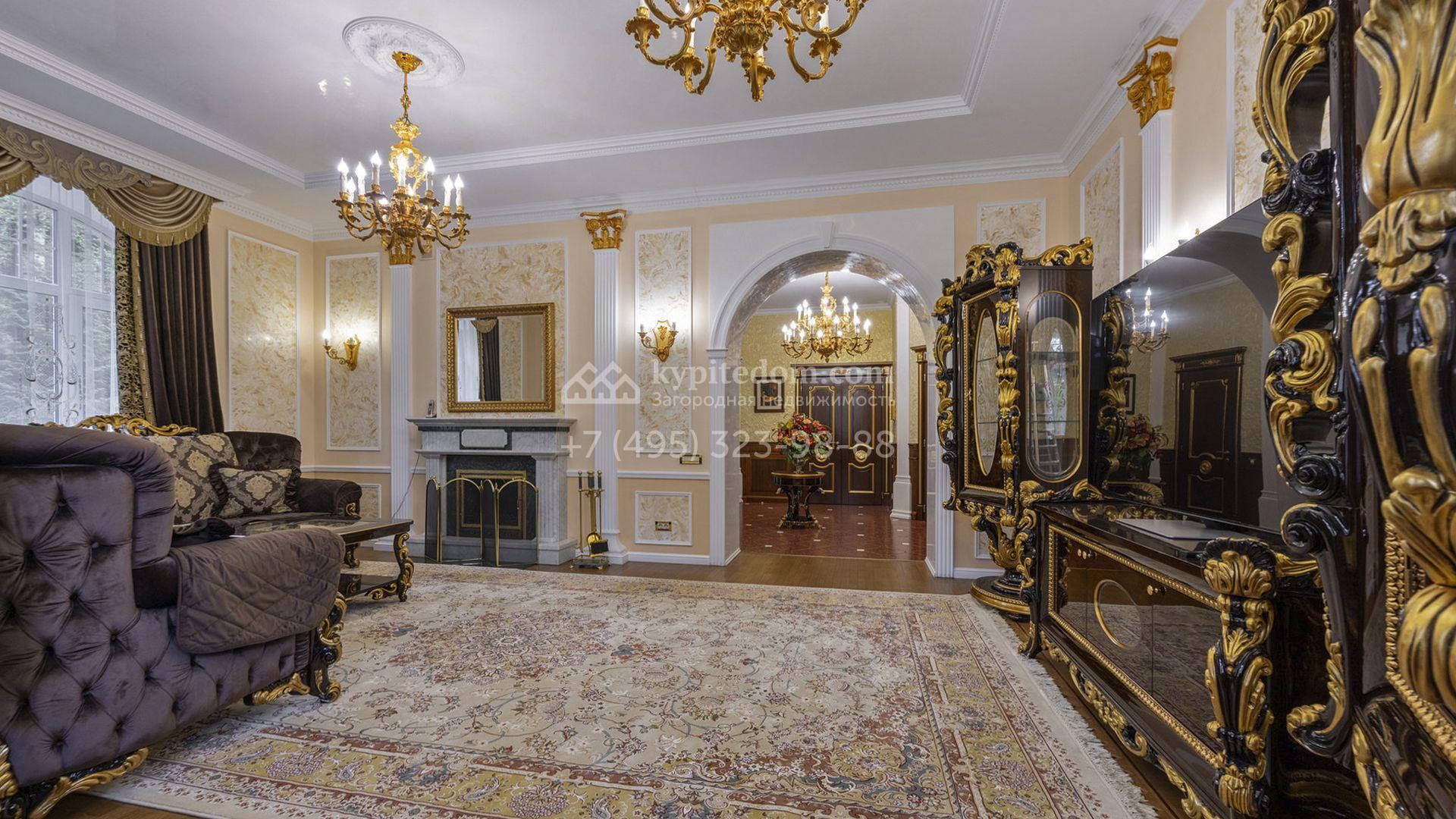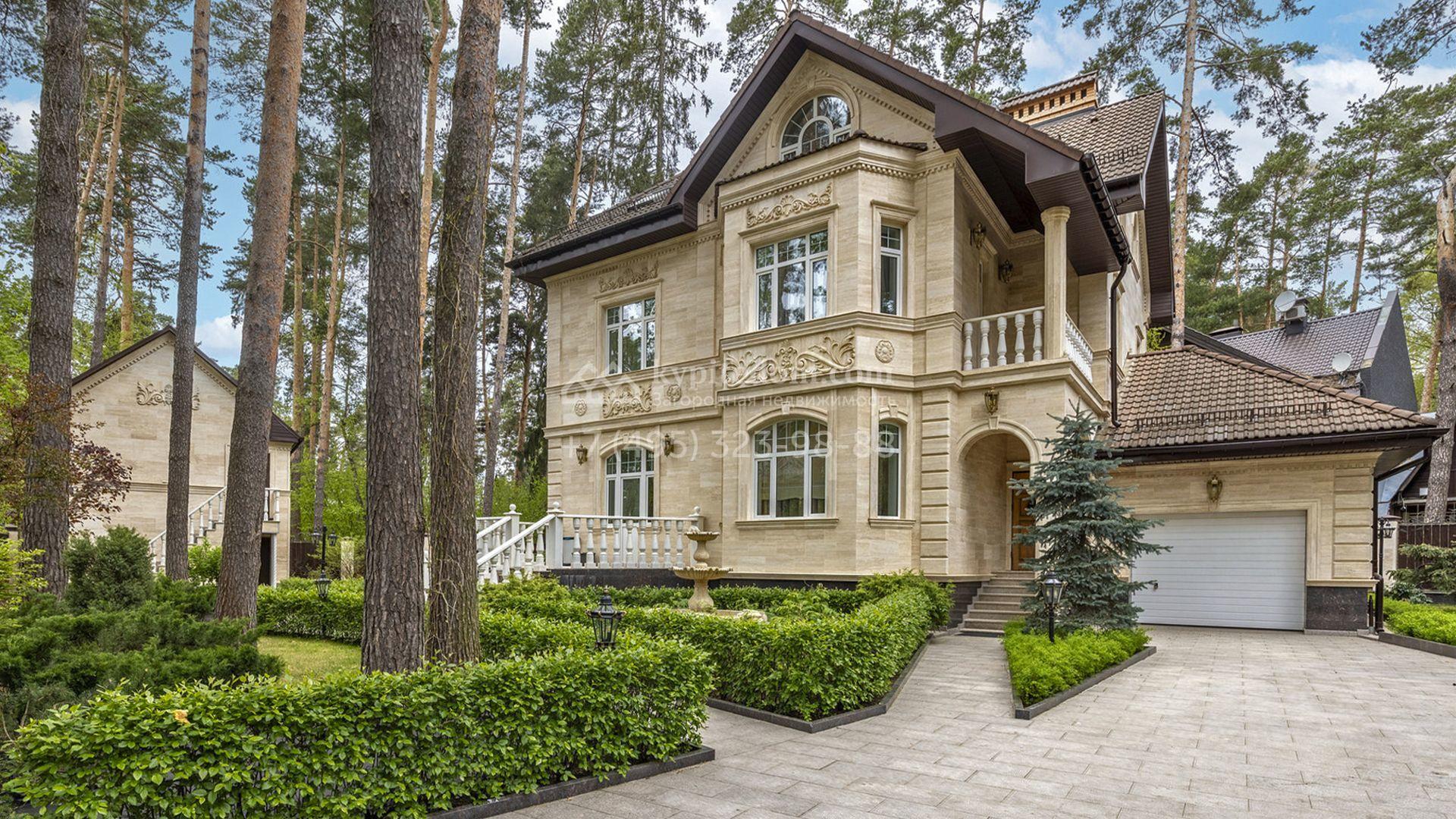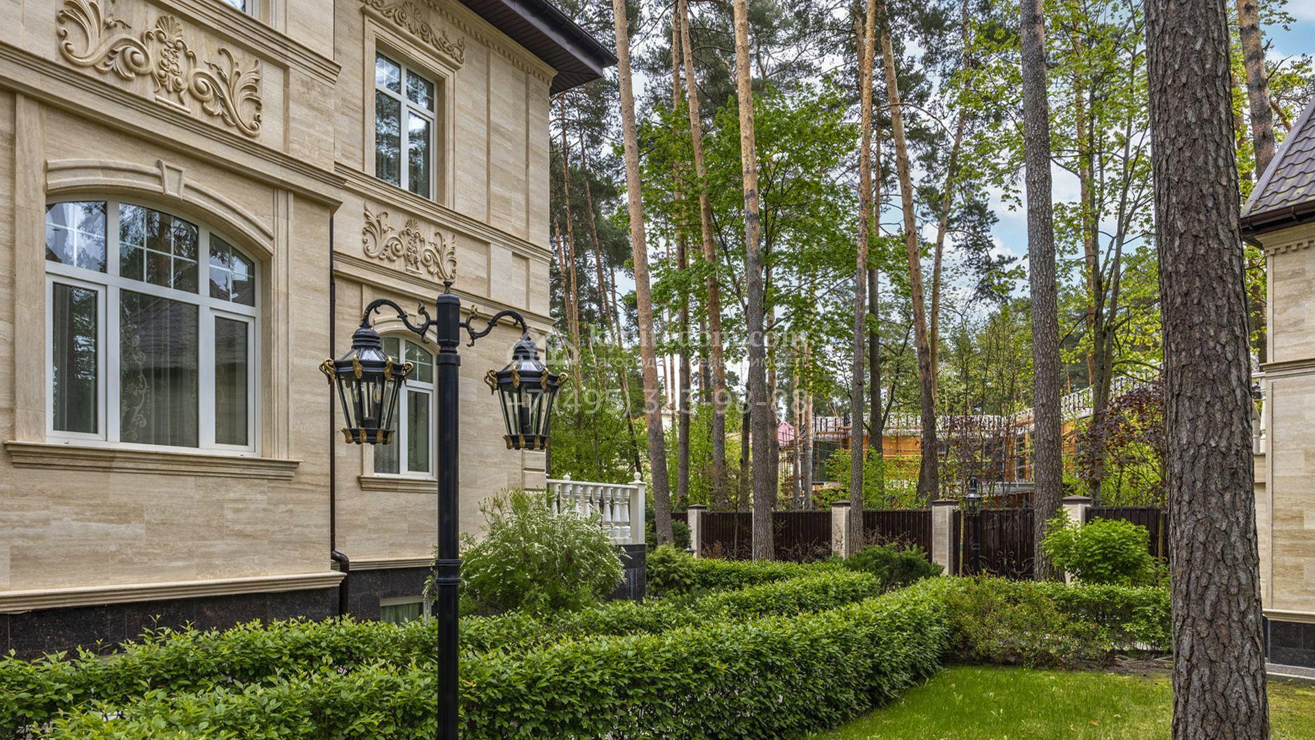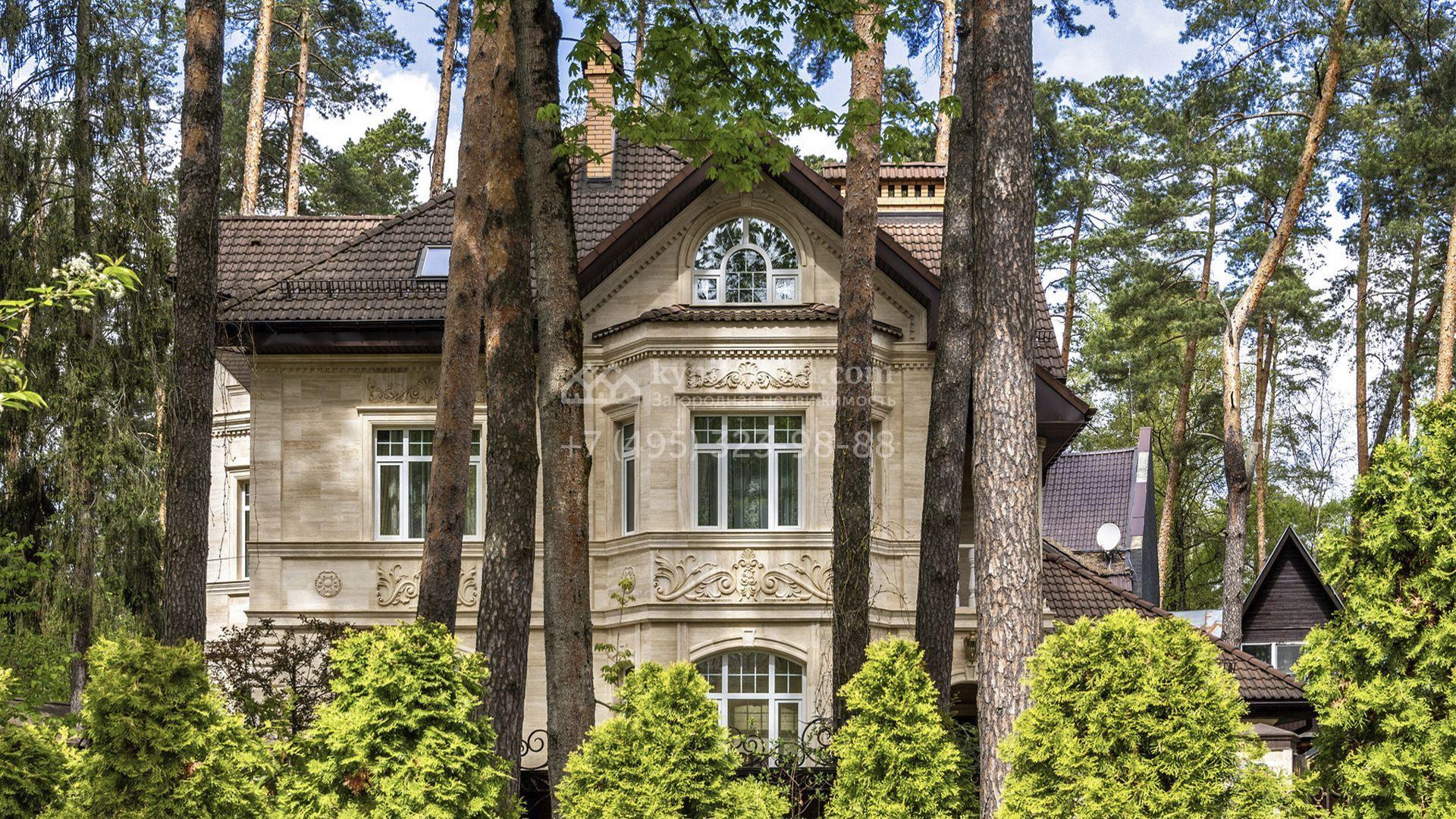 Загородный коттедж площадью 400 м² расположен на живописном лесном участке 12 соток. Фасад, выполненный в классическом стиле, облицован бежевой плиткой с фактурой камня и украшен рустовкой, элегантной лепниной и белоснежными балясинами. Подсветка подчёркивает изящную архитектуру с заходом солнца. Внутреннее убранство гармонично продолжает оформление экстерьера: просторные помещения декорированы пилястрами, молдингами, потолочными розетками и роскошными люстрами. Обстановка дополнена комфортабельной мебелью и встроенной бытовой техникой.