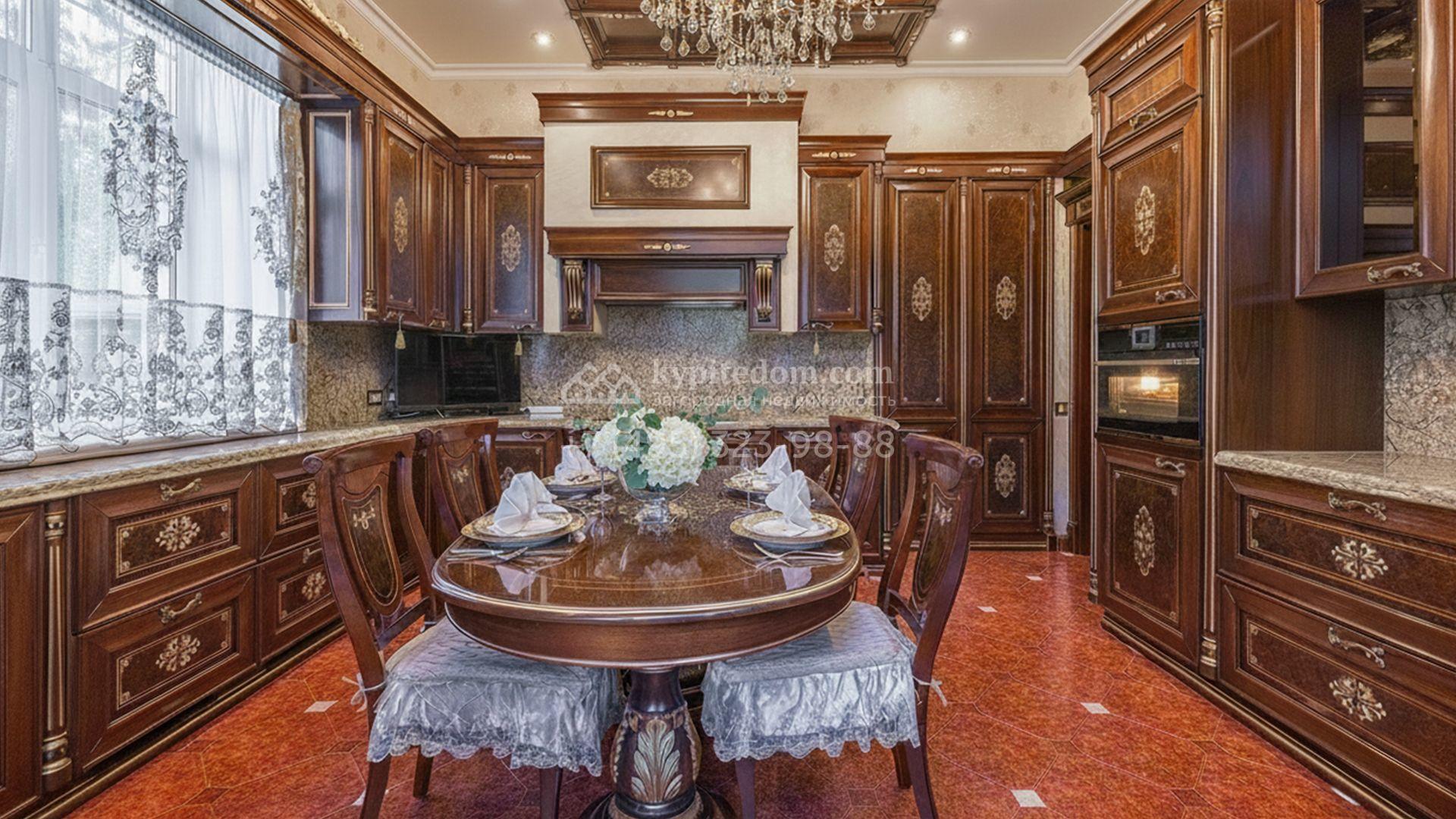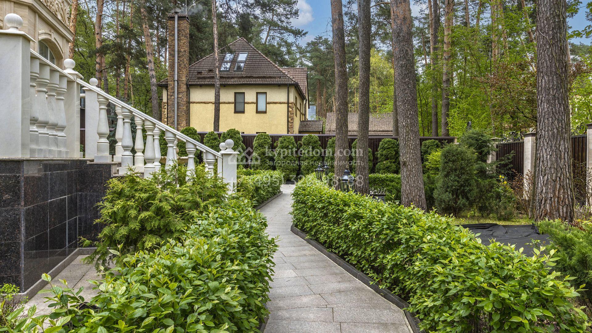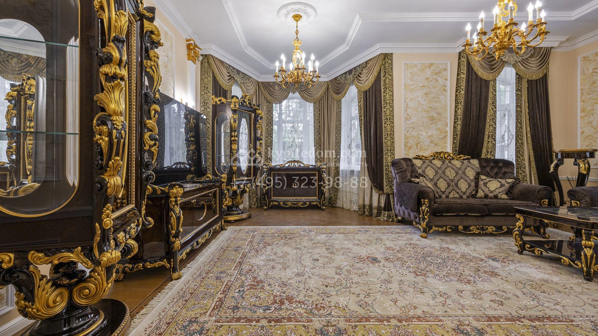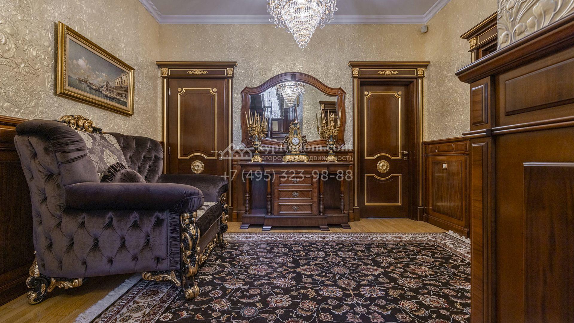 Загородный коттедж площадью 400 м² расположен на живописном лесном участке 12 соток. Фасад, выполненный в классическом стиле, облицован бежевой плиткой с фактурой камня и украшен рустовкой, элегантной лепниной и белоснежными балясинами. Подсветка подчёркивает изящную архитектуру с заходом солнца. Внутреннее убранство гармонично продолжает оформление экстерьера: просторные помещения декорированы пилястрами, молдингами, потолочными розетками и роскошными люстрами. Обстановка дополнена комфортабельной мебелью и встроенной бытовой техникой.