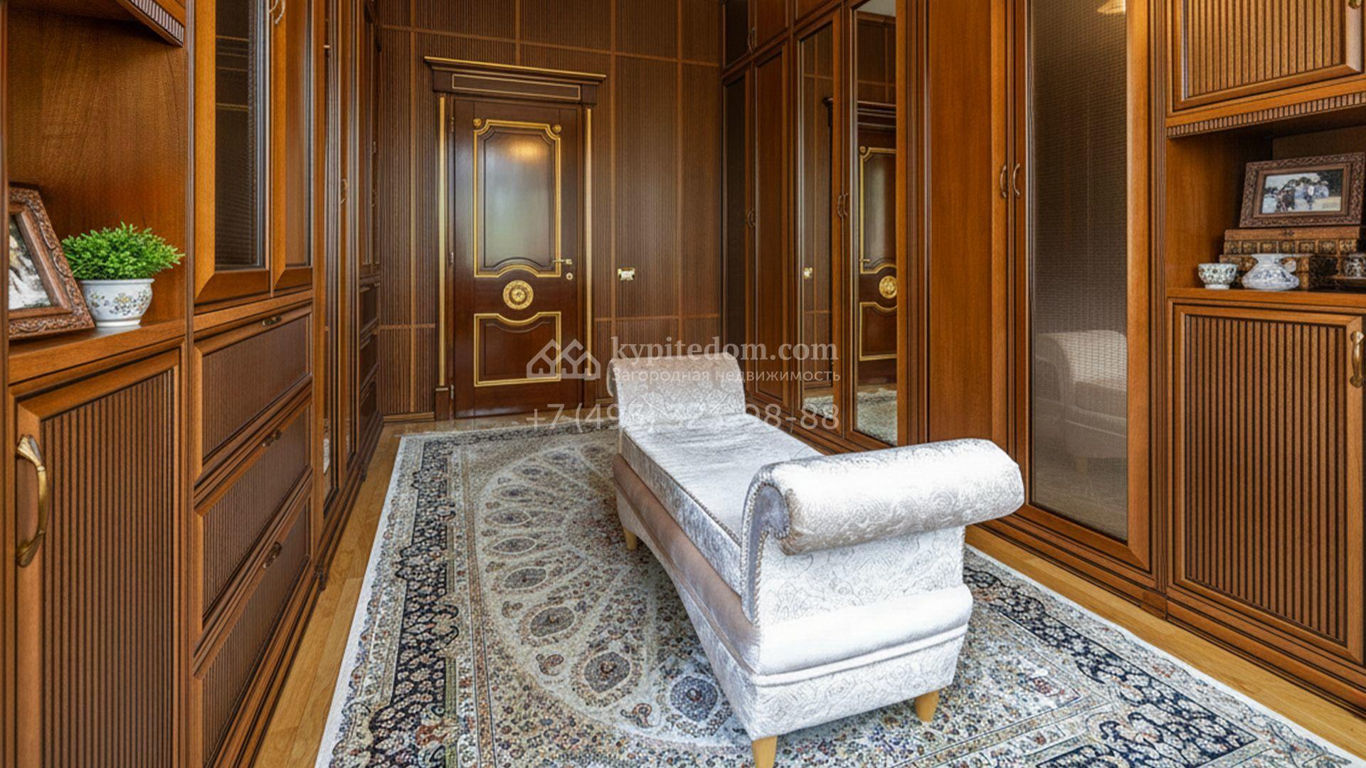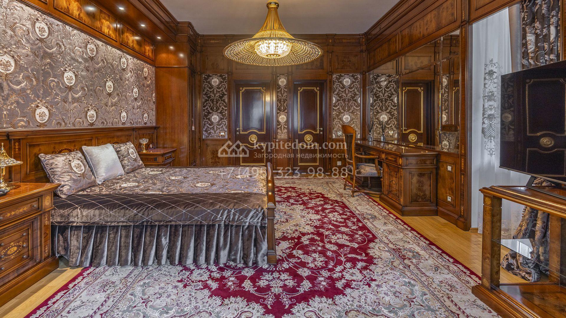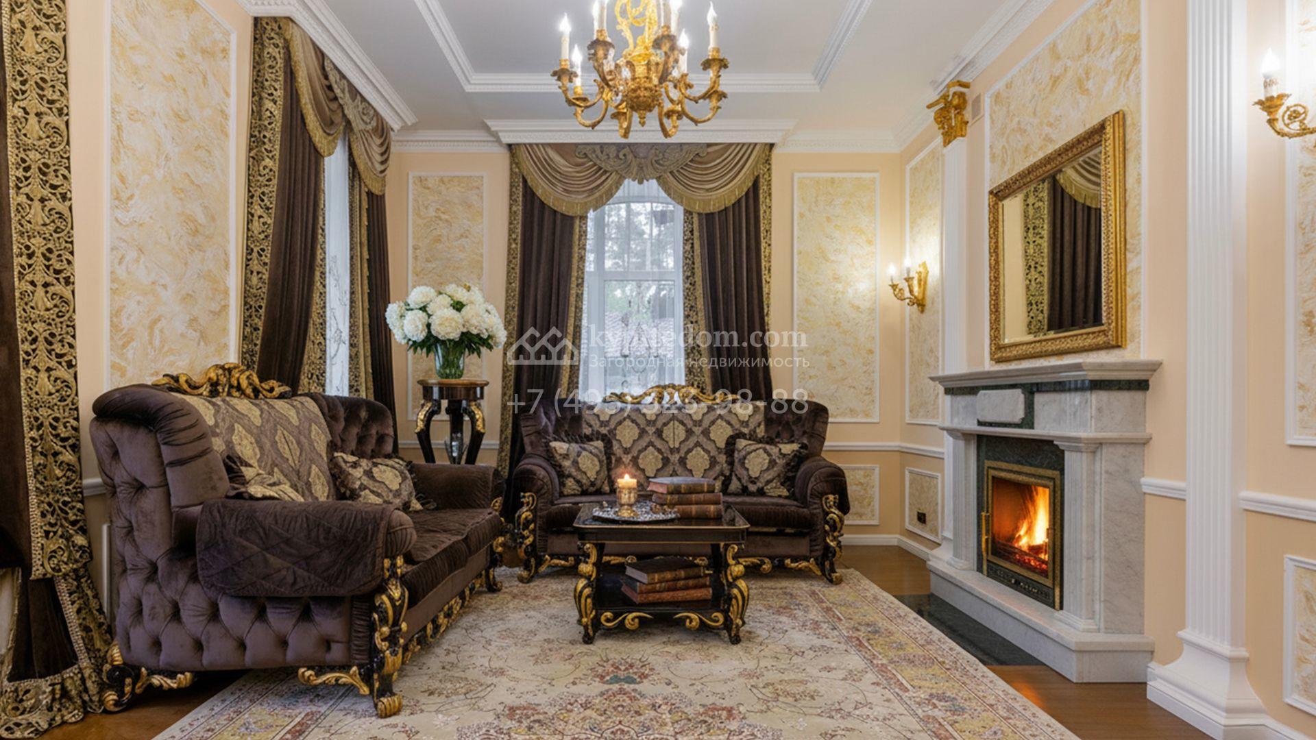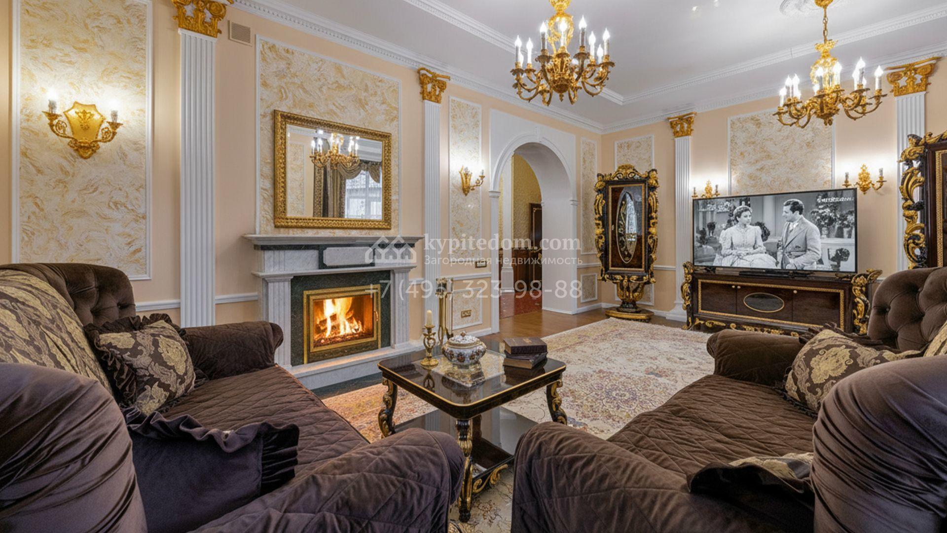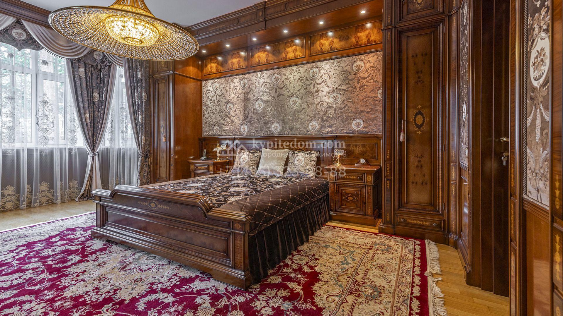 Загородный коттедж площадью 400 м² расположен на живописном лесном участке 12 соток. Фасад, выполненный в классическом стиле, облицован бежевой плиткой с фактурой камня и украшен рустовкой, элегантной лепниной и белоснежными балясинами. Подсветка подчёркивает изящную архитектуру с заходом солнца. Внутреннее убранство гармонично продолжает оформление экстерьера: просторные помещения декорированы пилястрами, молдингами, потолочными розетками и роскошными люстрами. Обстановка дополнена комфортабельной мебелью и встроенной бытовой техникой.
