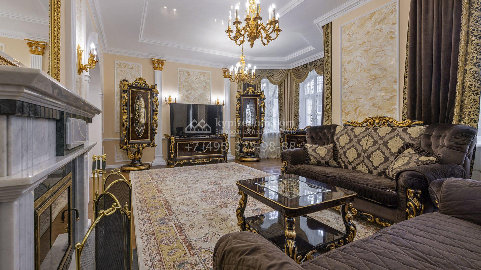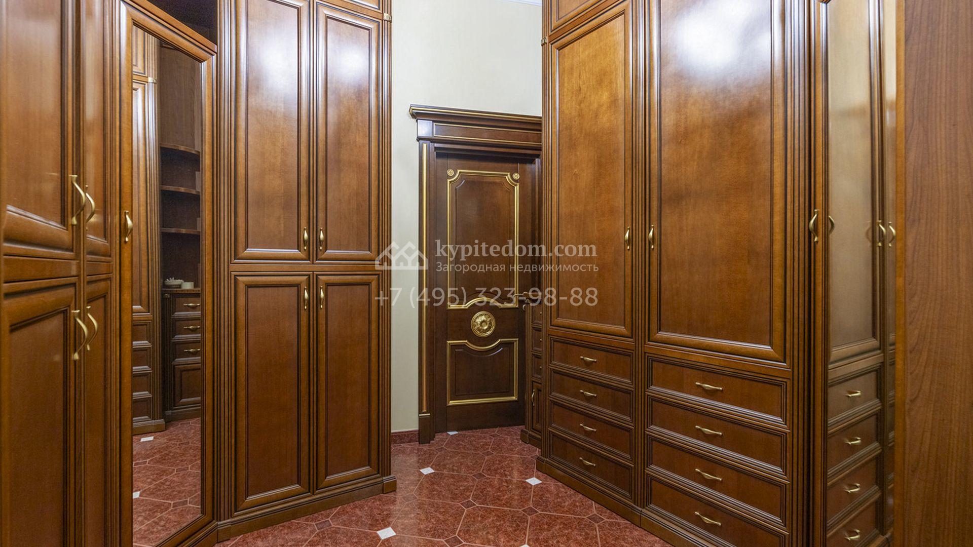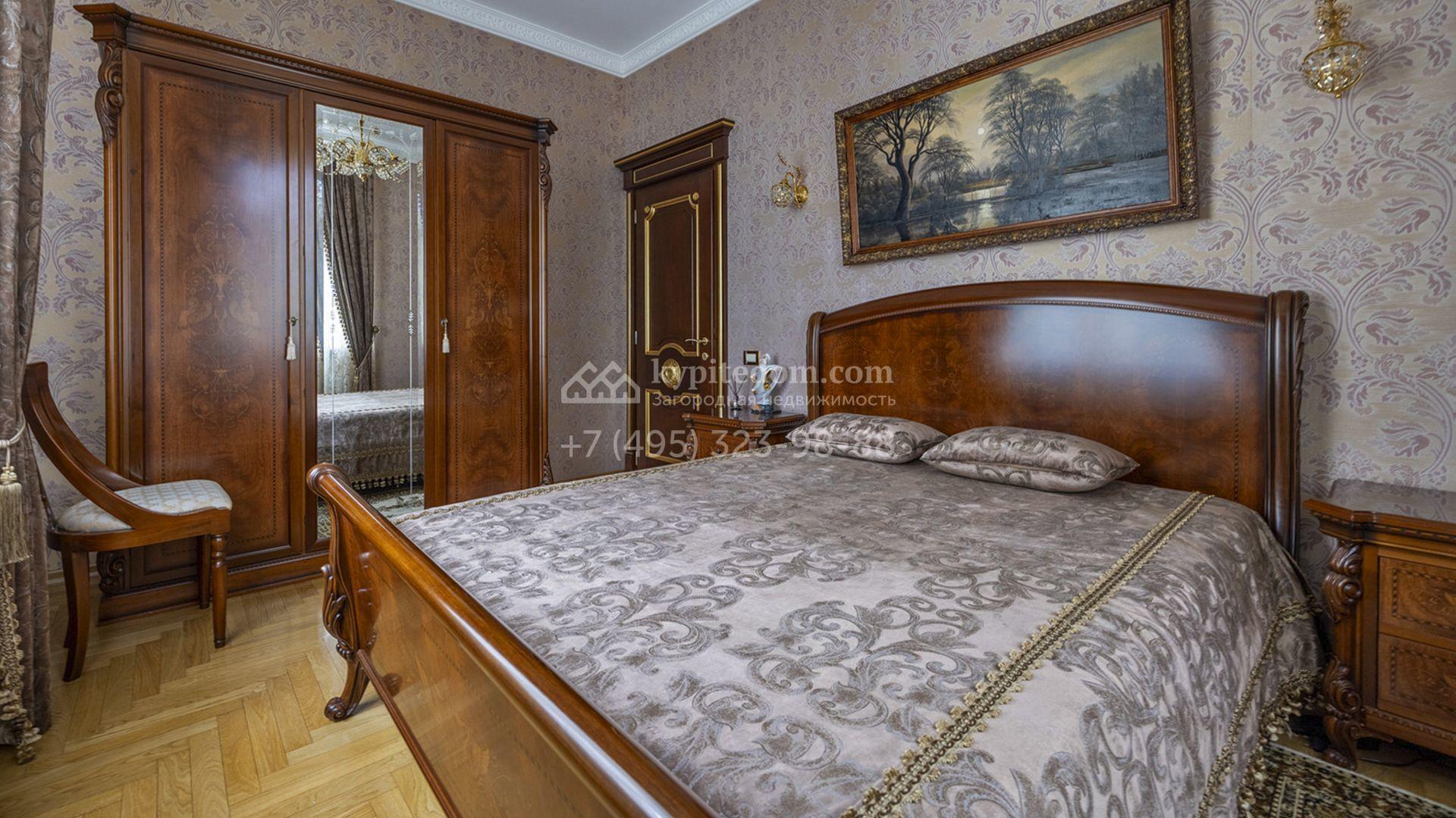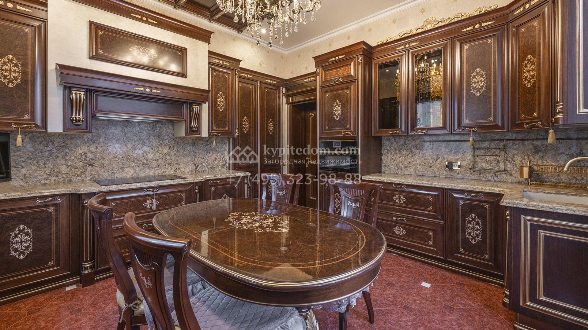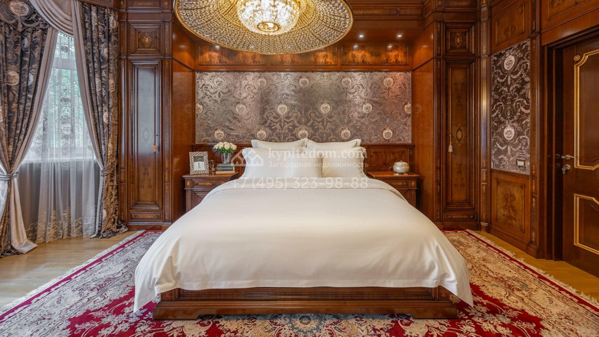 Загородный коттедж площадью 400 м² расположен на живописном лесном участке 12 соток. Фасад, выполненный в классическом стиле, облицован бежевой плиткой с фактурой камня и украшен рустовкой, элегантной лепниной и белоснежными балясинами. Подсветка подчёркивает изящную архитектуру с заходом солнца. Внутреннее убранство гармонично продолжает оформление экстерьера: просторные помещения декорированы пилястрами, молдингами, потолочными розетками и роскошными люстрами. Обстановка дополнена комфортабельной мебелью и встроенной бытовой техникой.