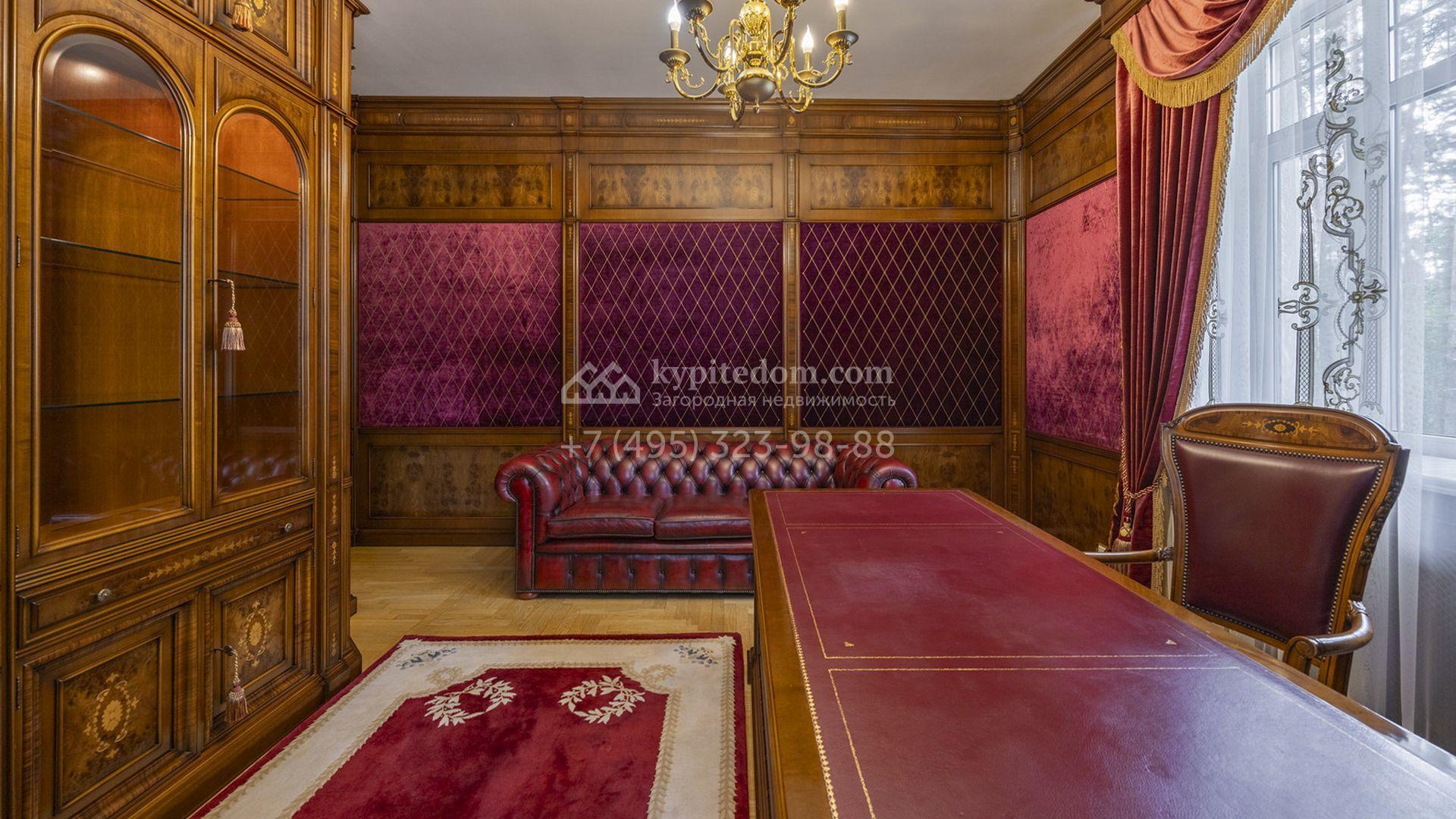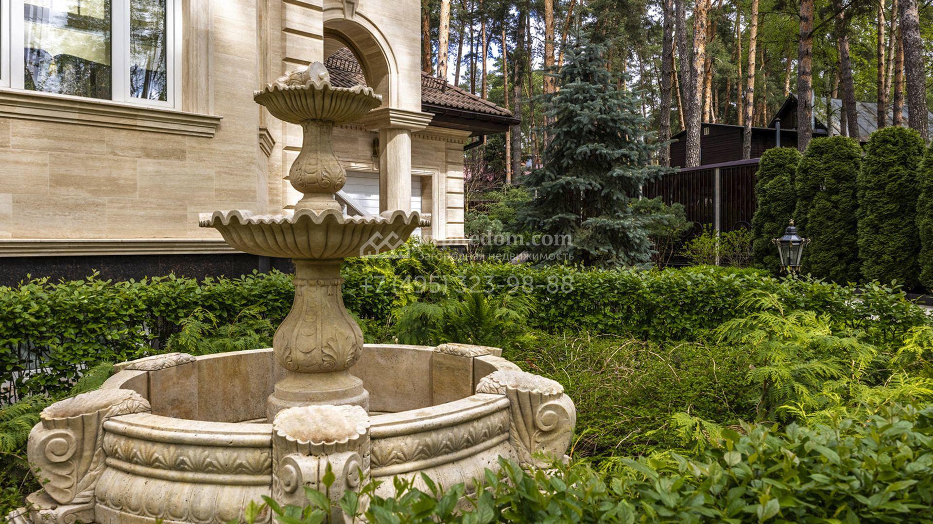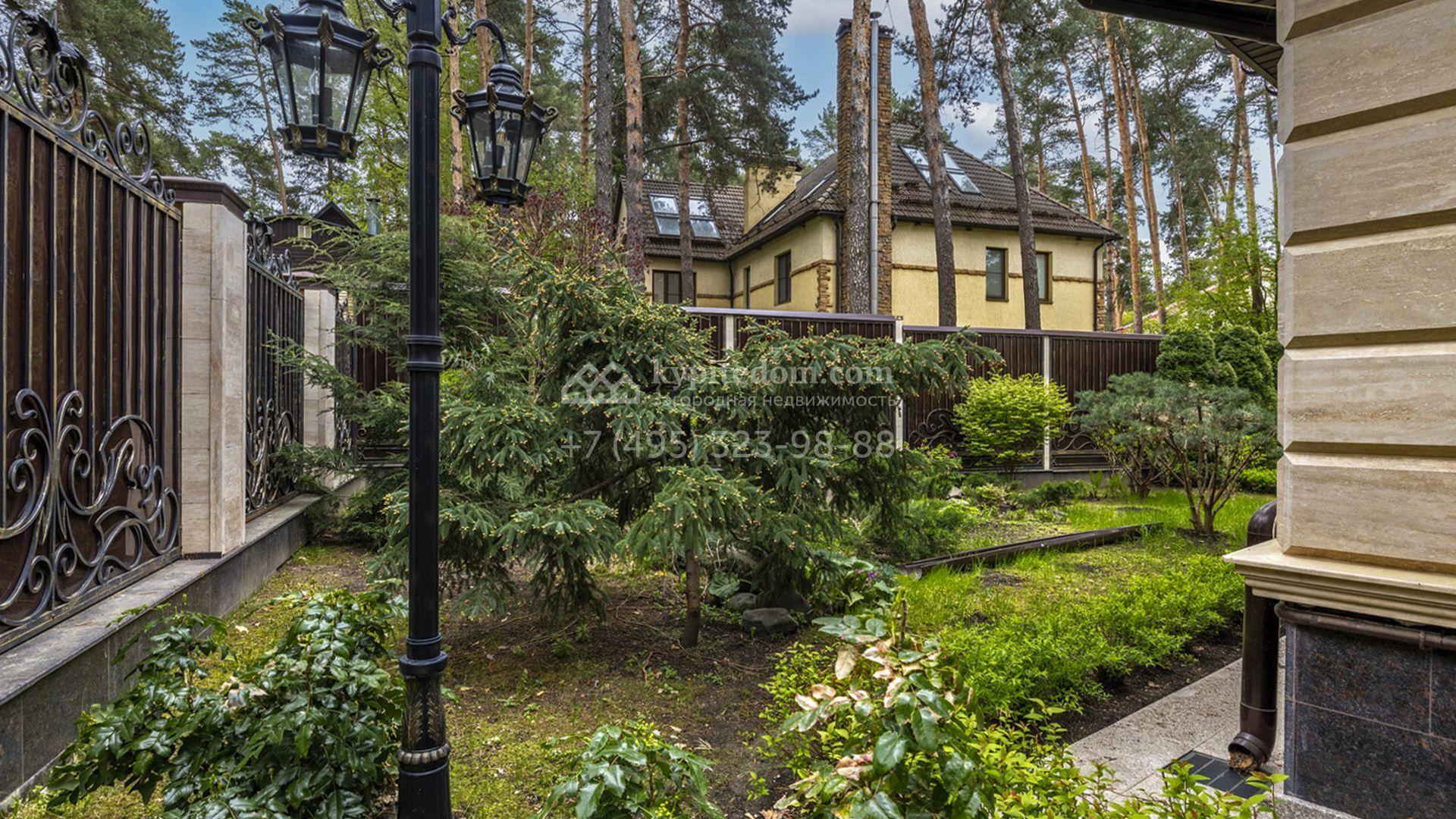 Планировка включает уютную гостиную с камином, кухню, три спальни, кабинет и бильярдную. На цокольном уровне разместили сауну, комнату отдыха и тренажёрный зал. Разместить машины можно во встроенном одноместном гараже, или же в отдельностоящем гараже на две машины с квартирой для персонала. Кроме того, на территории построены дом для персонала площадью 75 м² и беседка для барбекю, где будет приятно провести время в кругу близких. Прогуливаясь по освещённым дорожкам в тени высоких деревьев, можно насладиться ароматом свежескошенной травы, а также видом на фонтан и декоративные кустарники у дома.