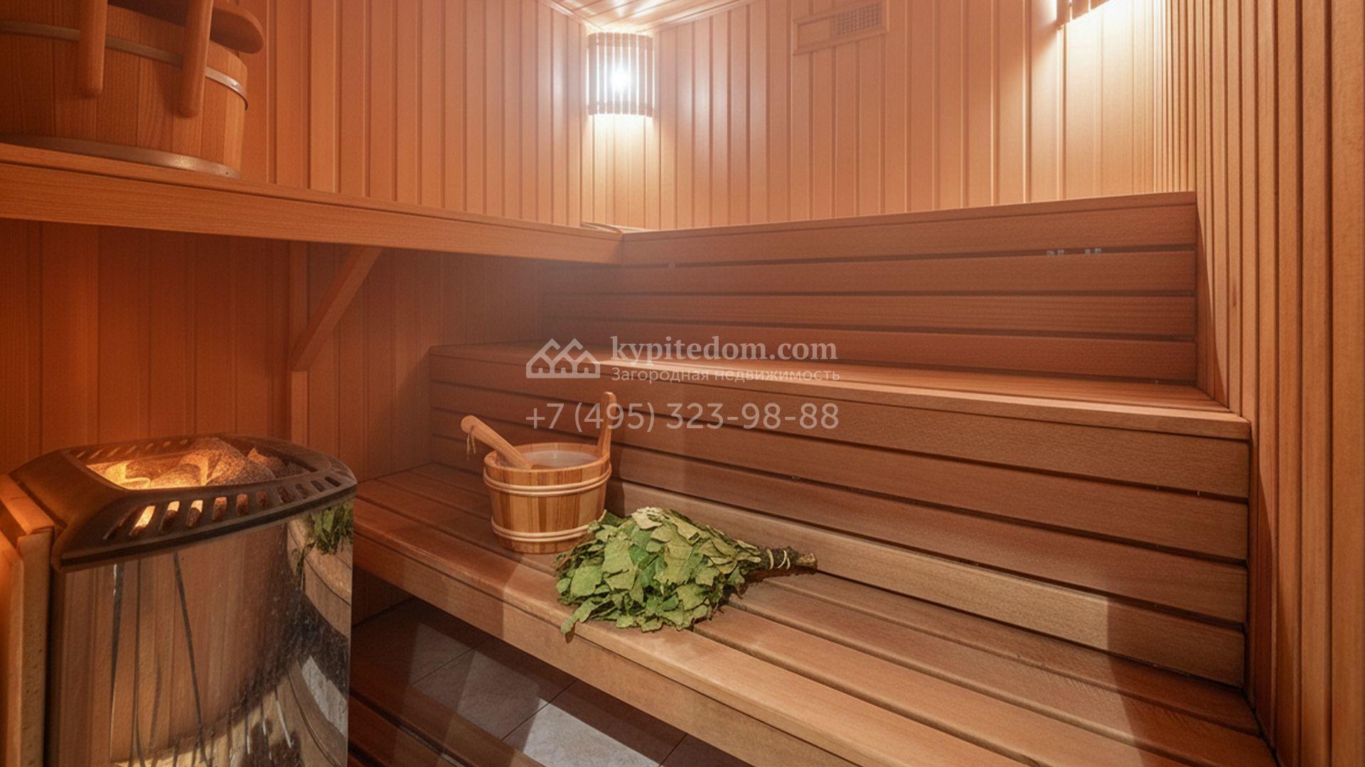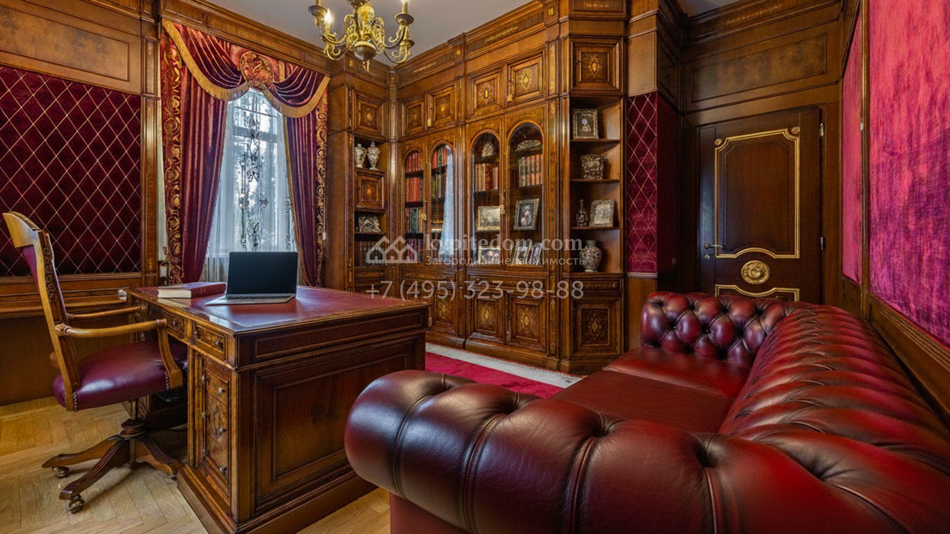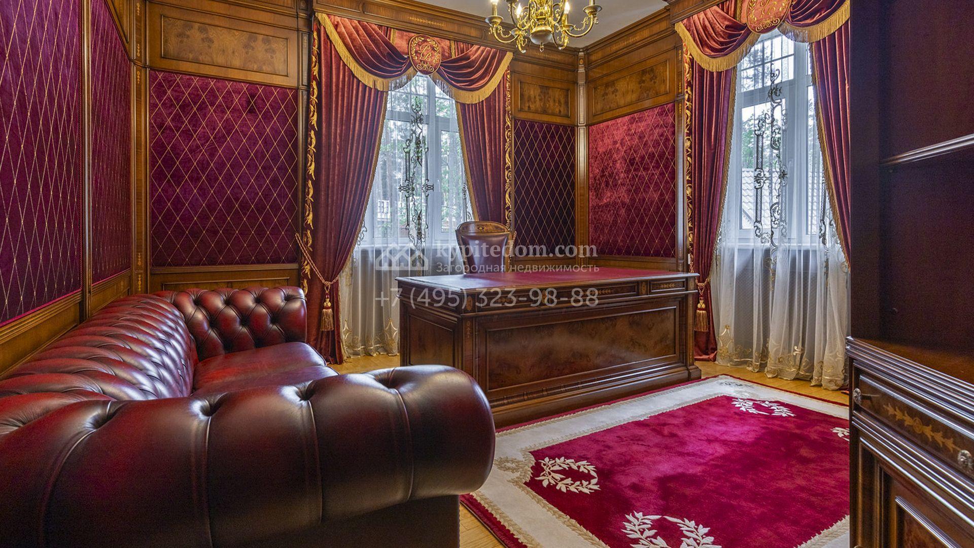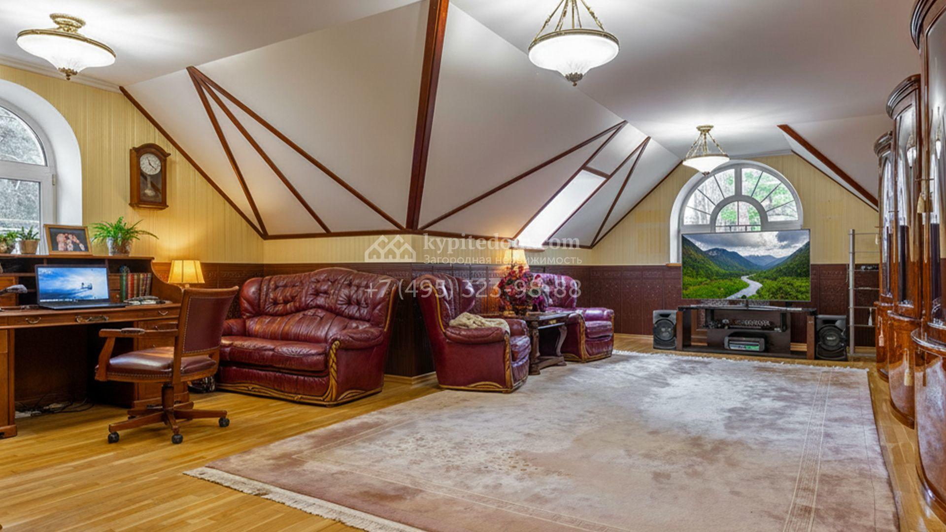 Планировка включает уютную гостиную с камином, кухню, три спальни, кабинет и бильярдную. На цокольном уровне разместили сауну, комнату отдыха и тренажёрный зал. Разместить машины можно во встроенном одноместном гараже, или же в отдельностоящем гараже на две машины с квартирой для персонала. Кроме того, на территории построены дом для персонала площадью 75 м² и беседка для барбекю, где будет приятно провести время в кругу близких. Прогуливаясь по освещённым дорожкам в тени высоких деревьев, можно насладиться ароматом свежескошенной травы, а также видом на фонтан и декоративные кустарники у дома.