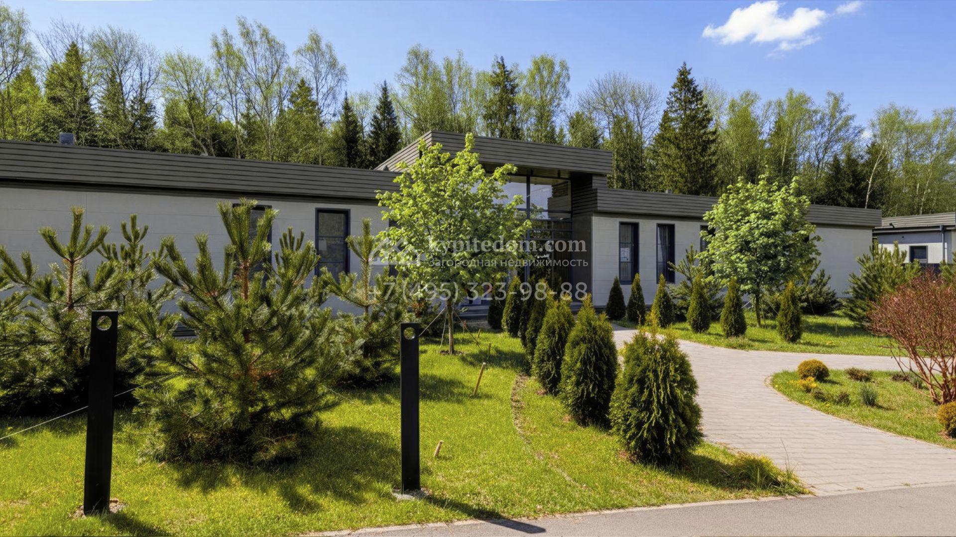 Коттедж площадью 420 м² расположен на участке 25 соток с прямым выходом в лес. Архитектура выдержана в современном стиле: фасад облицован белыми японскими вентилируемыми плитами, придающими дому лёгкость и архитектурную чистоту. Крупные панорамные окна и потолки высотой от 3,5 до 4,5 метра открывают виды на сосны и наполняют интерьеры естественным светом.