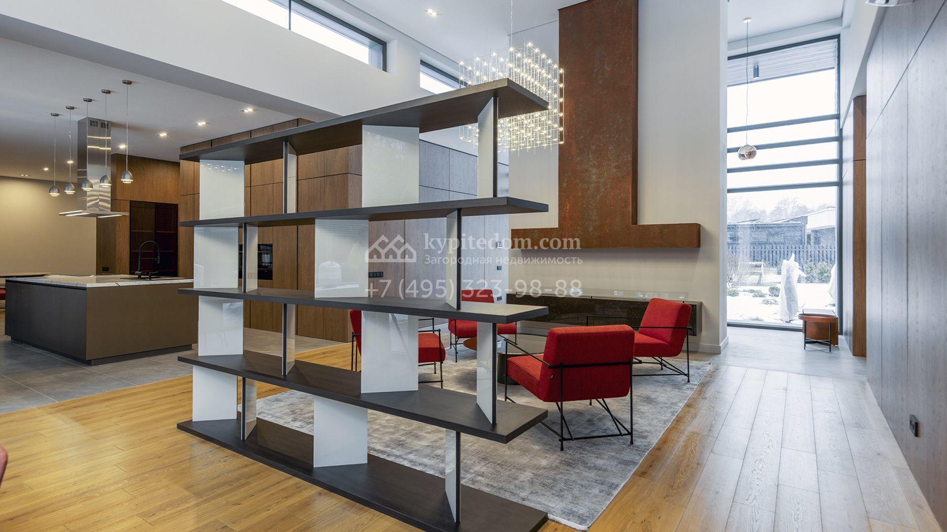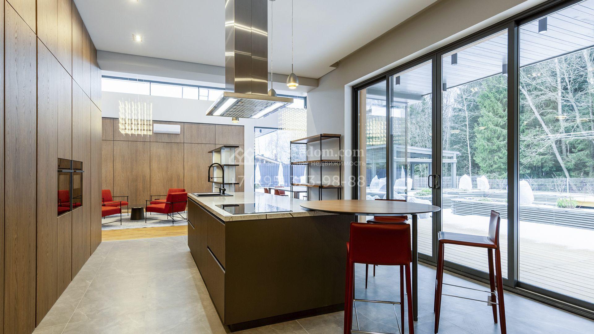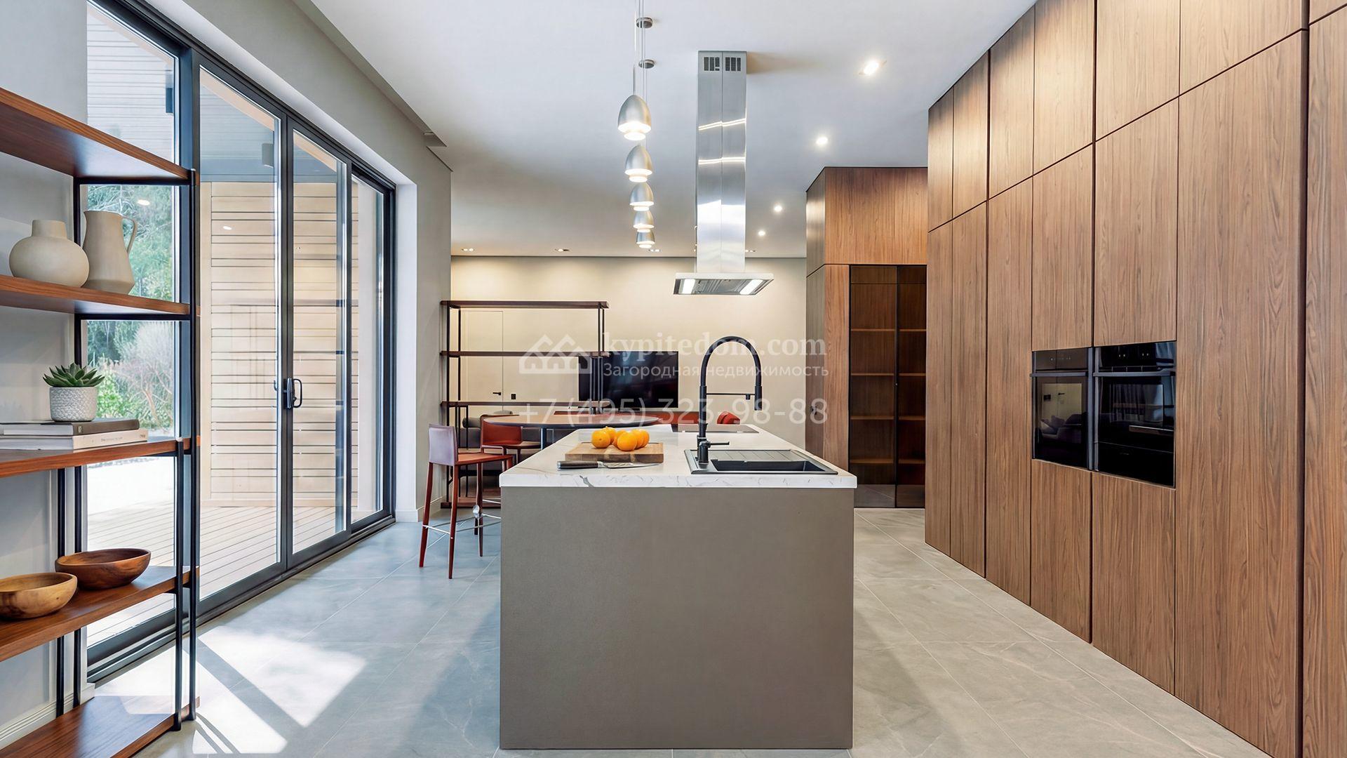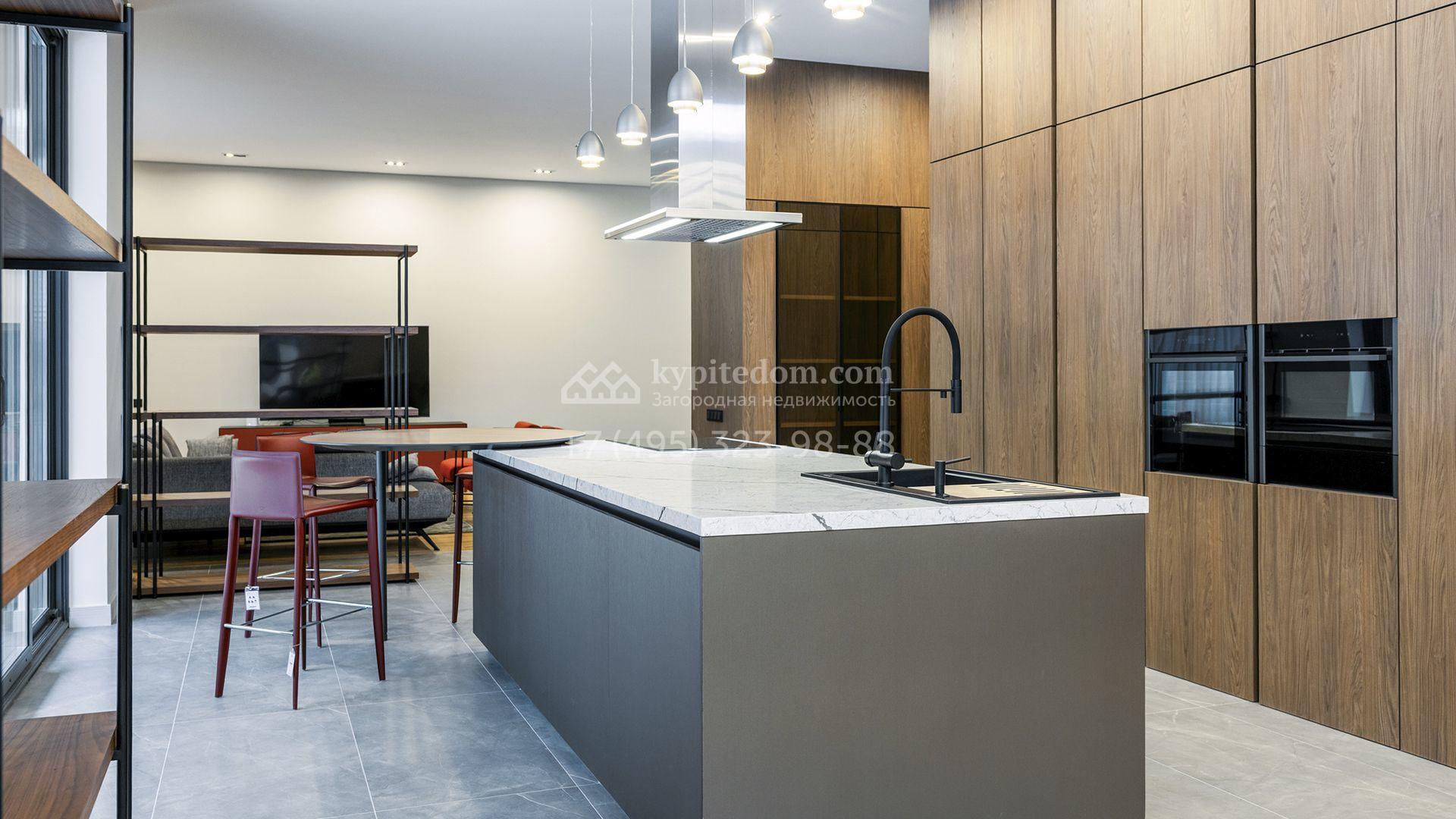 Внутрение пространства оформлены в минималистичной эстетике. В отделке использованы импортные материалы — дерево, камень и благородные текстуры, объединённые нейтральной серой палитрой. Дом укомплектован мебелью Ditre, Pianca, Bontempi, ALF, Calligaris и оборудован техникой премиальных брендов Liebherr, Nef, Falmec и Asko.