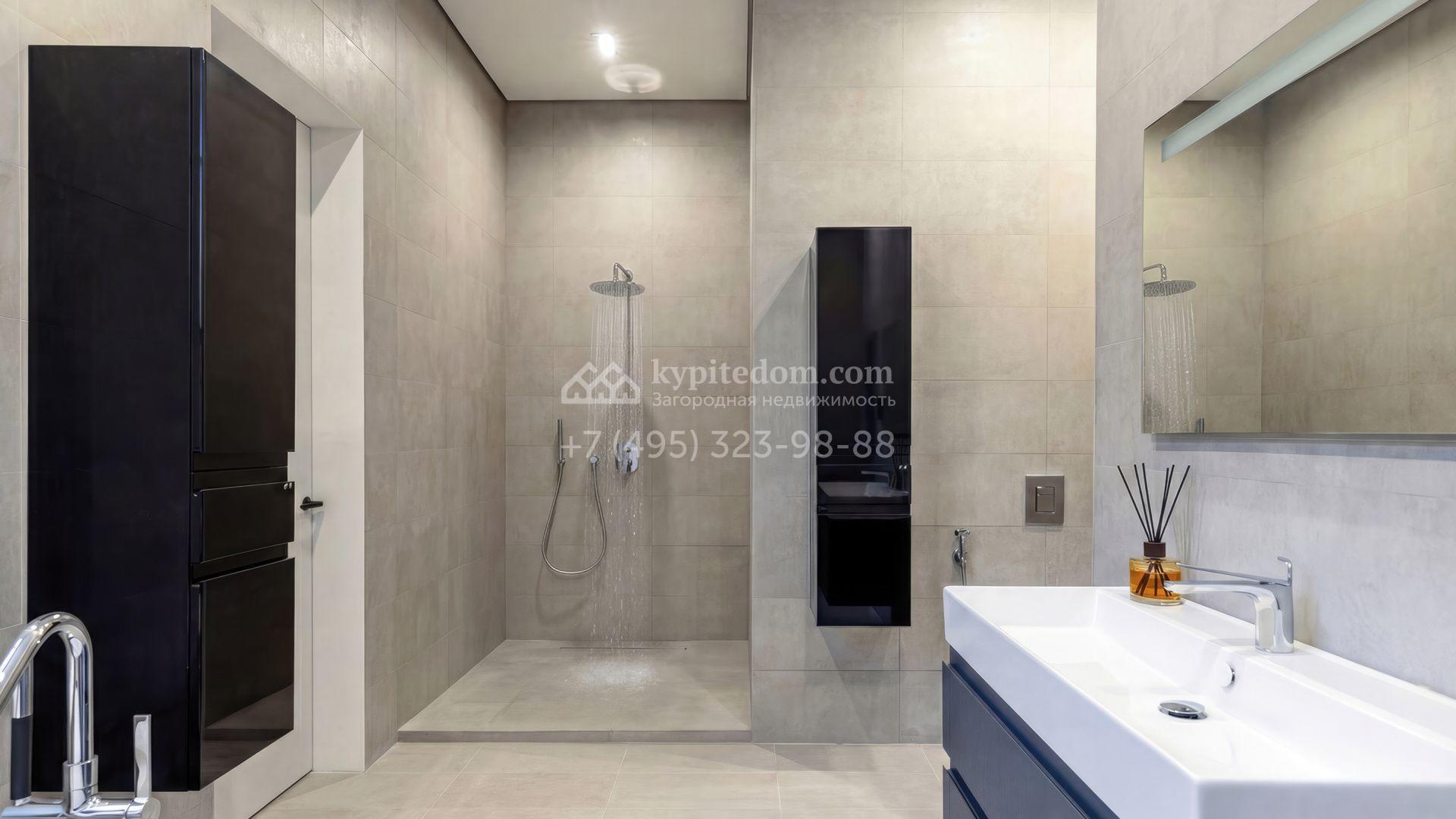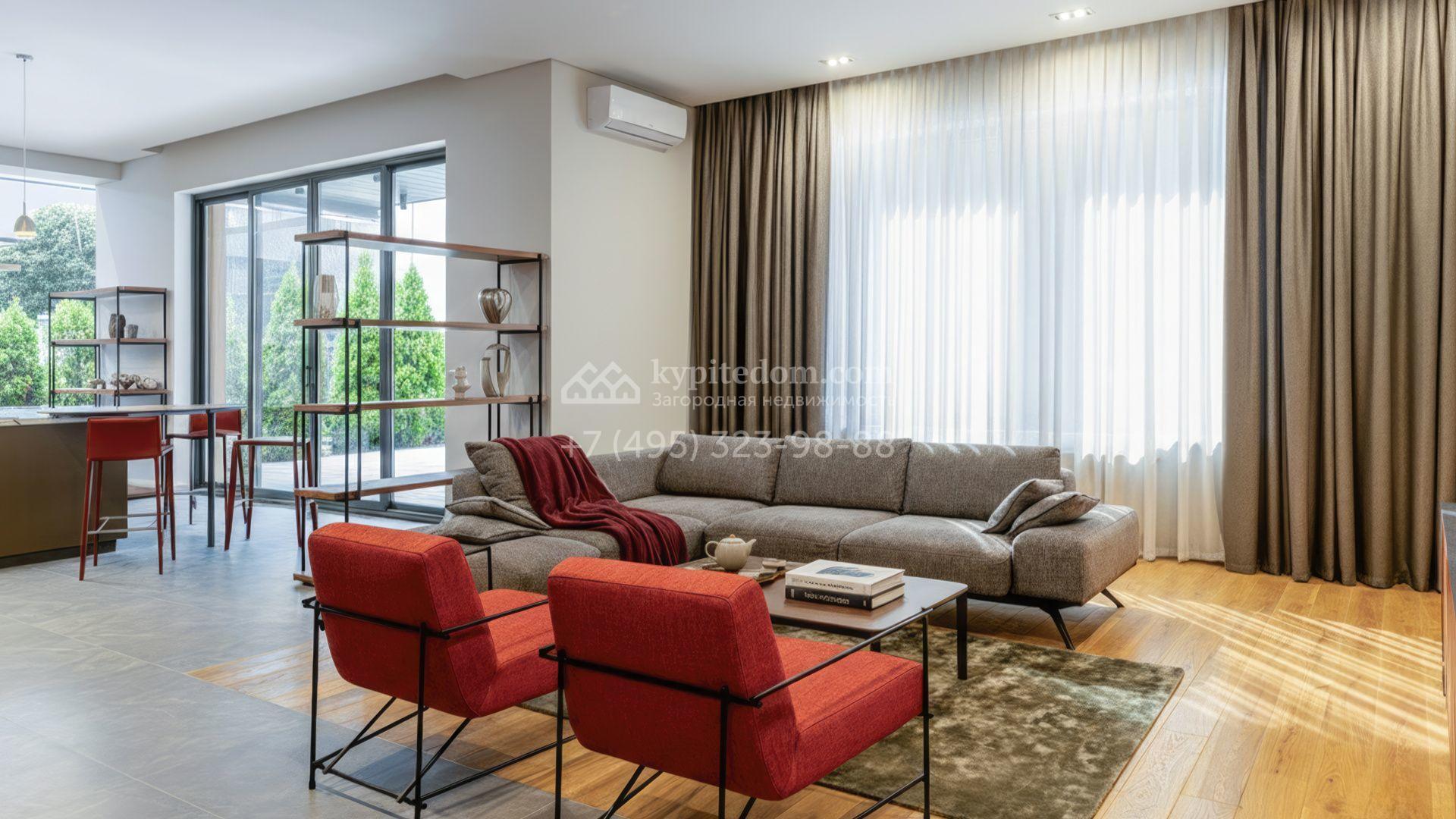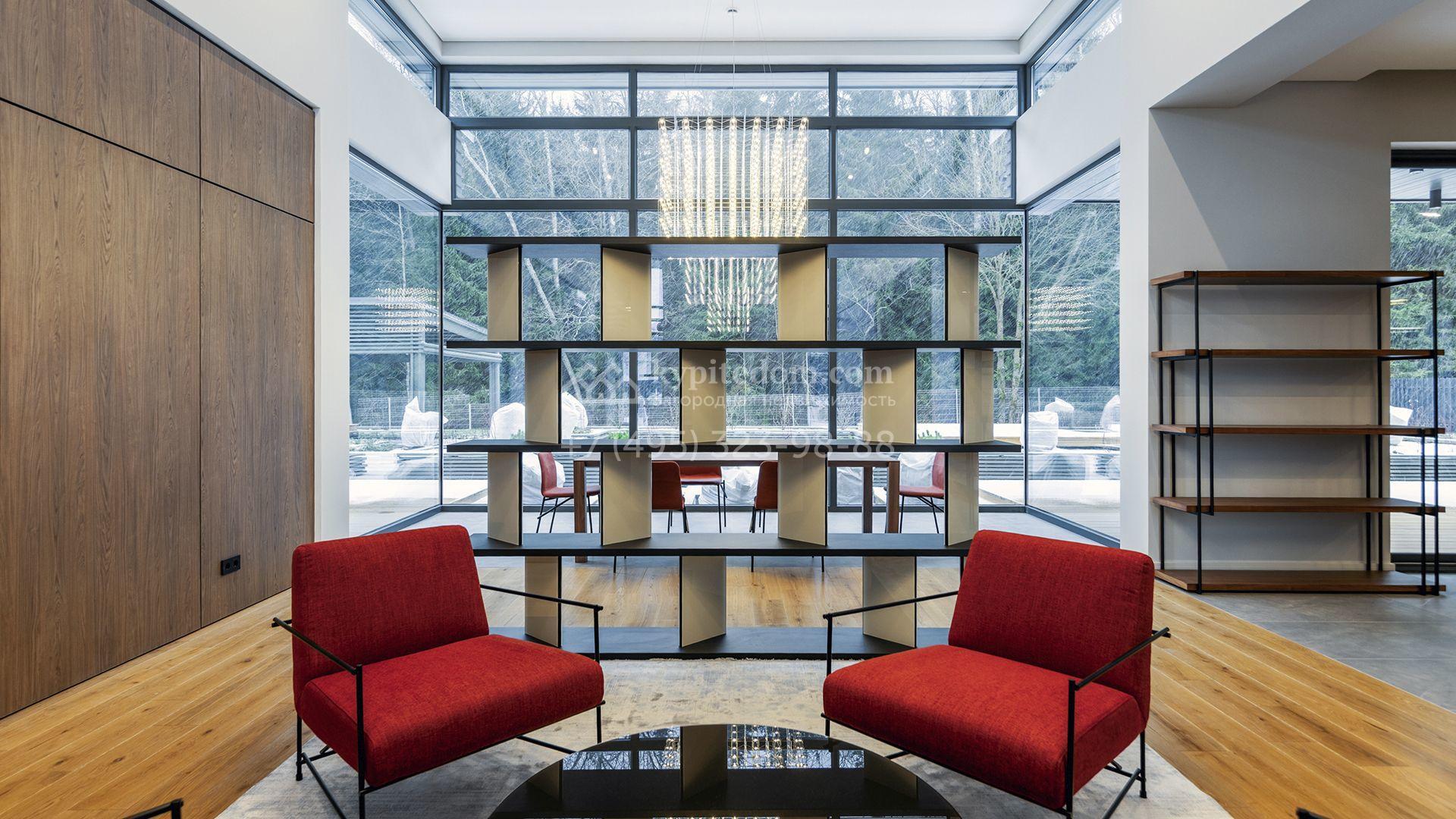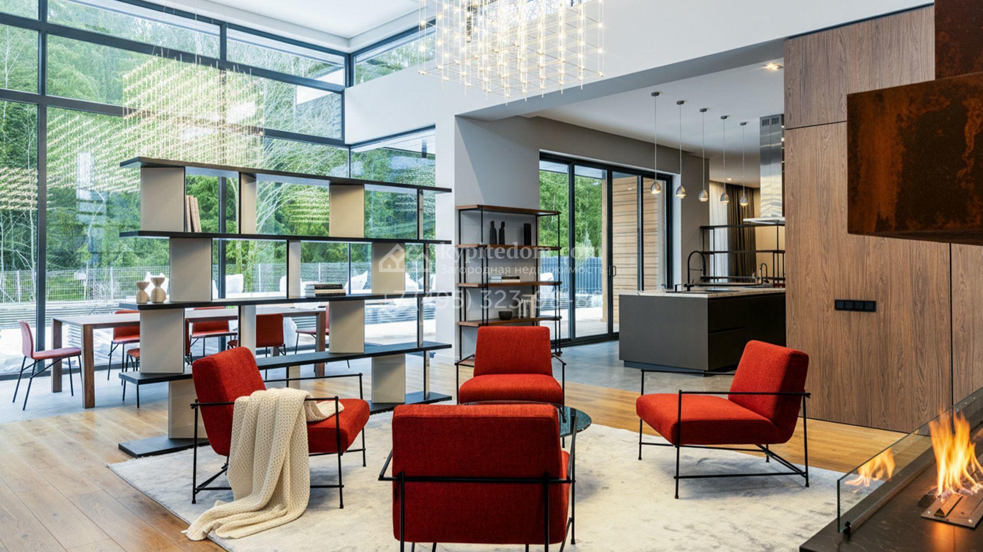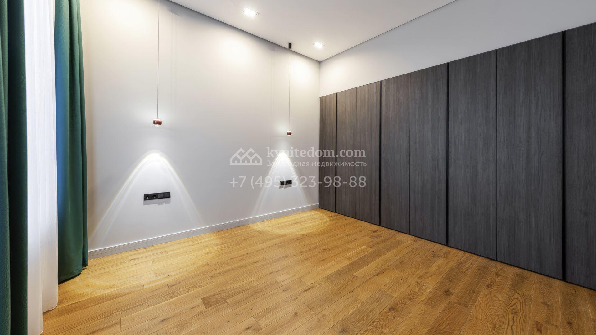 Внутрение пространства оформлены в минималистичной эстетике. В отделке использованы импортные материалы — дерево, камень и благородные текстуры, объединённые нейтральной серой палитрой. Дом укомплектован мебелью Ditre, Pianca, Bontempi, ALF, Calligaris и оборудован техникой премиальных брендов Liebherr, Nef, Falmec и Asko.