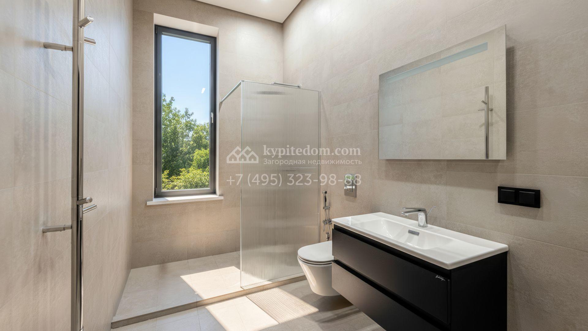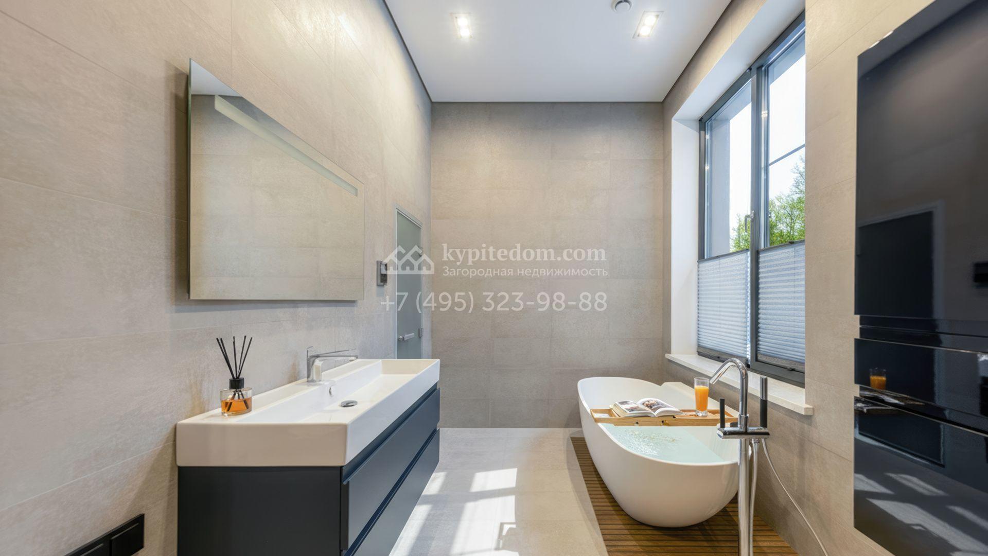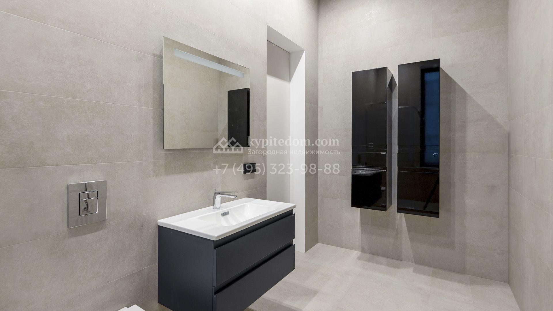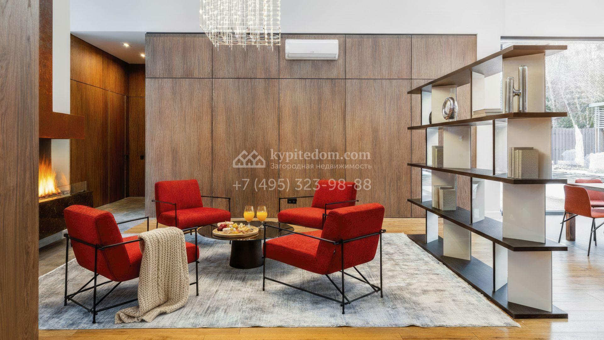 Внутрение пространства оформлены в минималистичной эстетике. В отделке использованы импортные материалы — дерево, камень и благородные текстуры, объединённые нейтральной серой палитрой. Дом укомплектован мебелью Ditre, Pianca, Bontempi, ALF, Calligaris и оборудован техникой премиальных брендов Liebherr, Nef, Falmec и Asko.