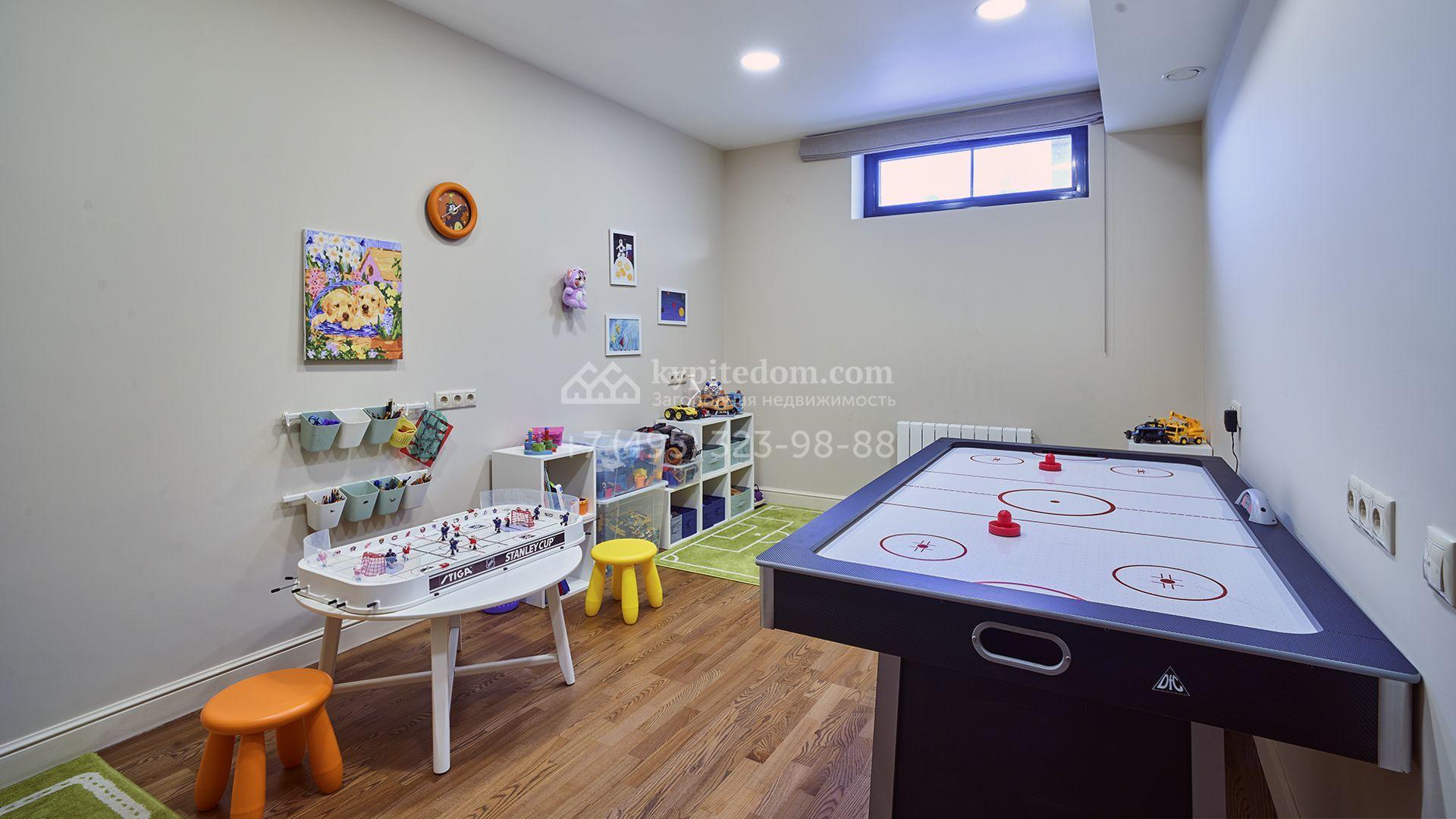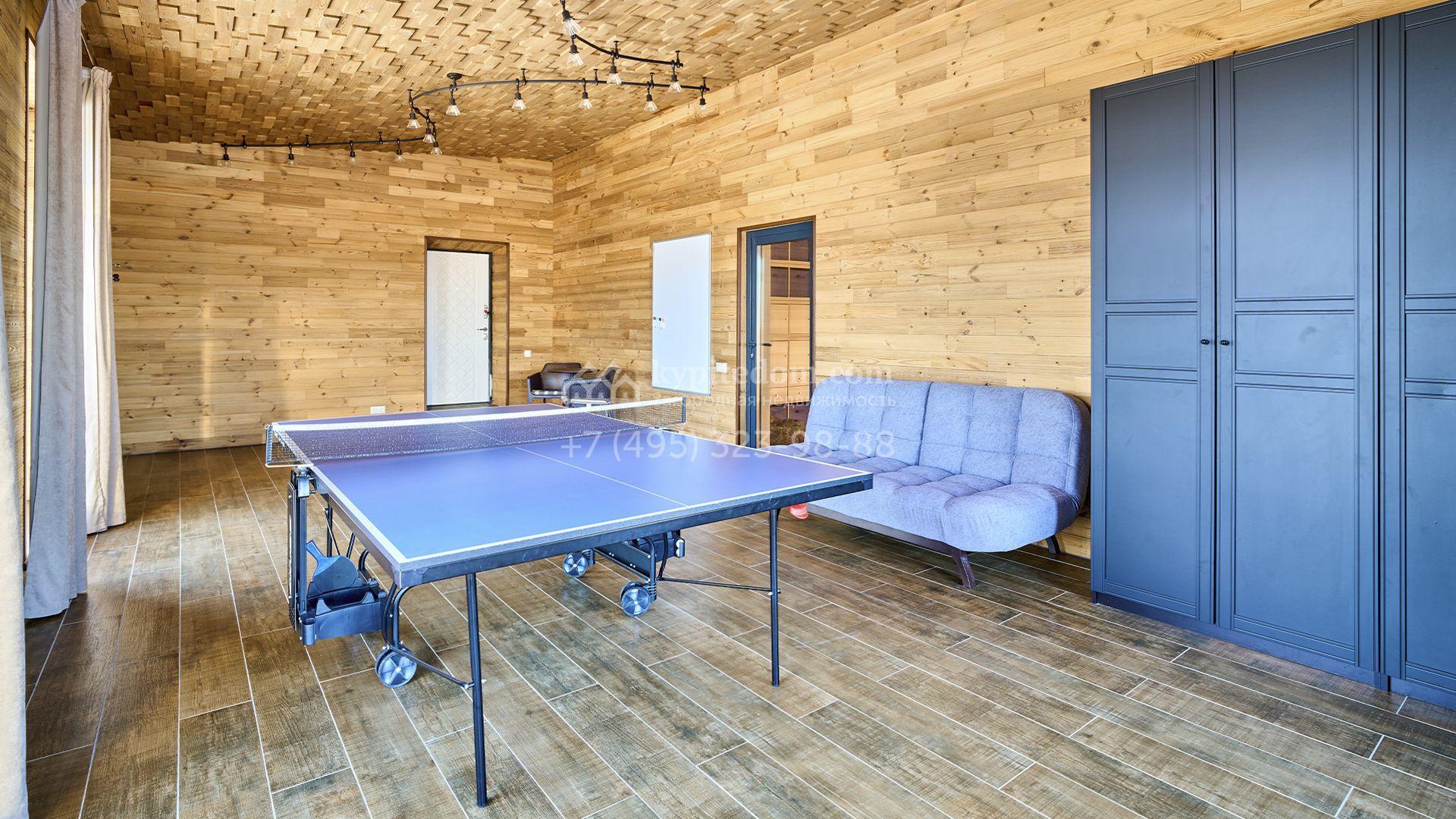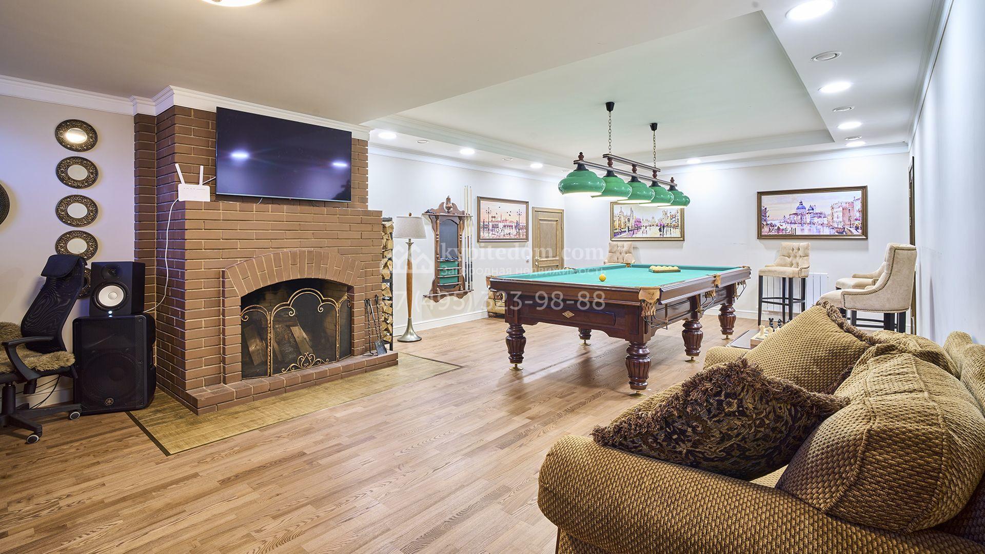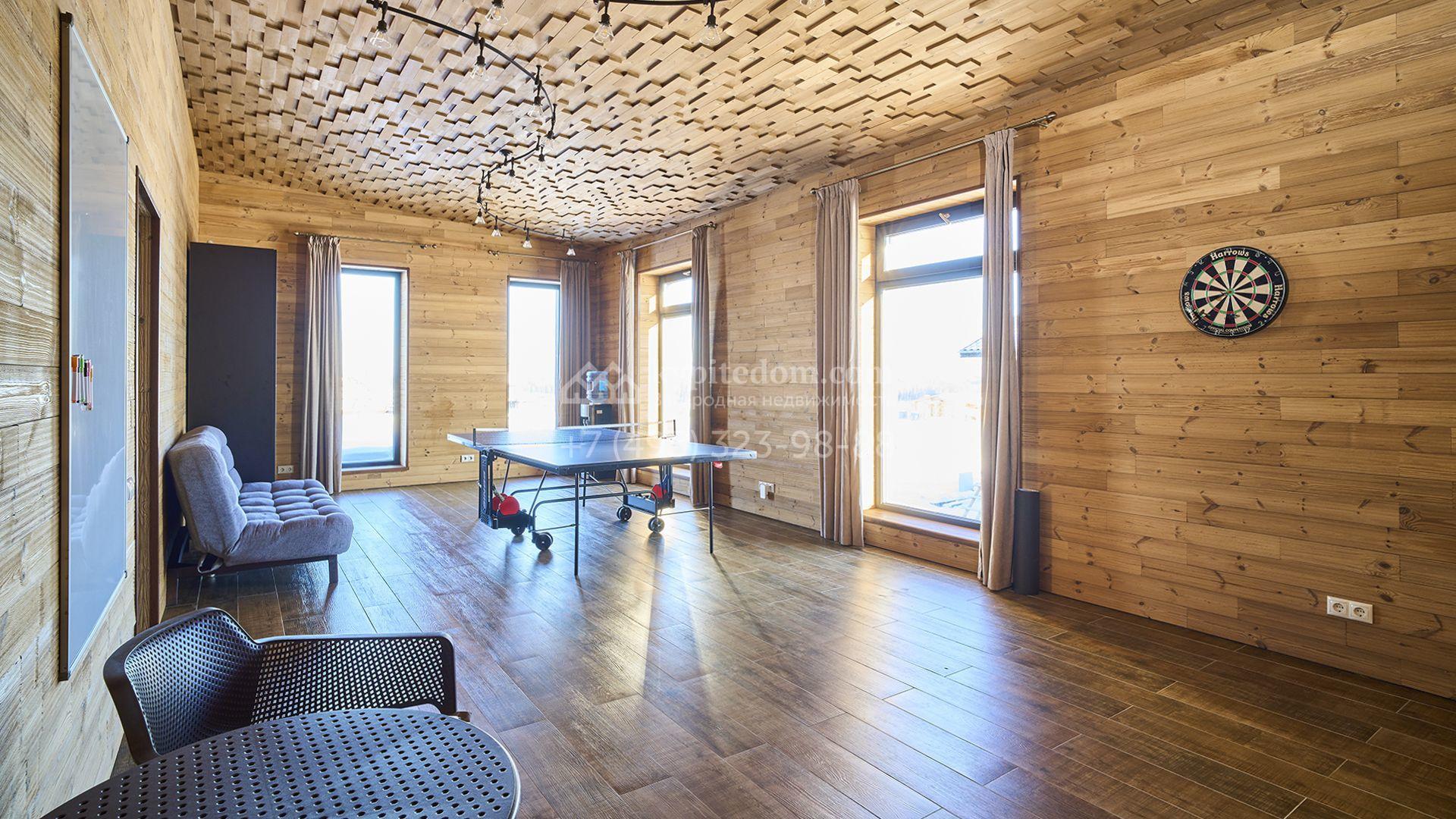 Планировка включает просторную гостиную-кухню-столовую для семейных обедов и приема гостей, удобный для работы кабинет, 3 спальни, спортивный зал с настольным теннисом, каминный зал с бильярдом, караоке и профессиональной акустикой, а также детскую игровую с аэрохоккеем и игрушками. На эксплуатируемой крыше площадью 150 м² разместили комфортную зону отдыха с панорамным видом на природу. Кроме того, в контуре дома предусмотрен гараж на 2 машины.