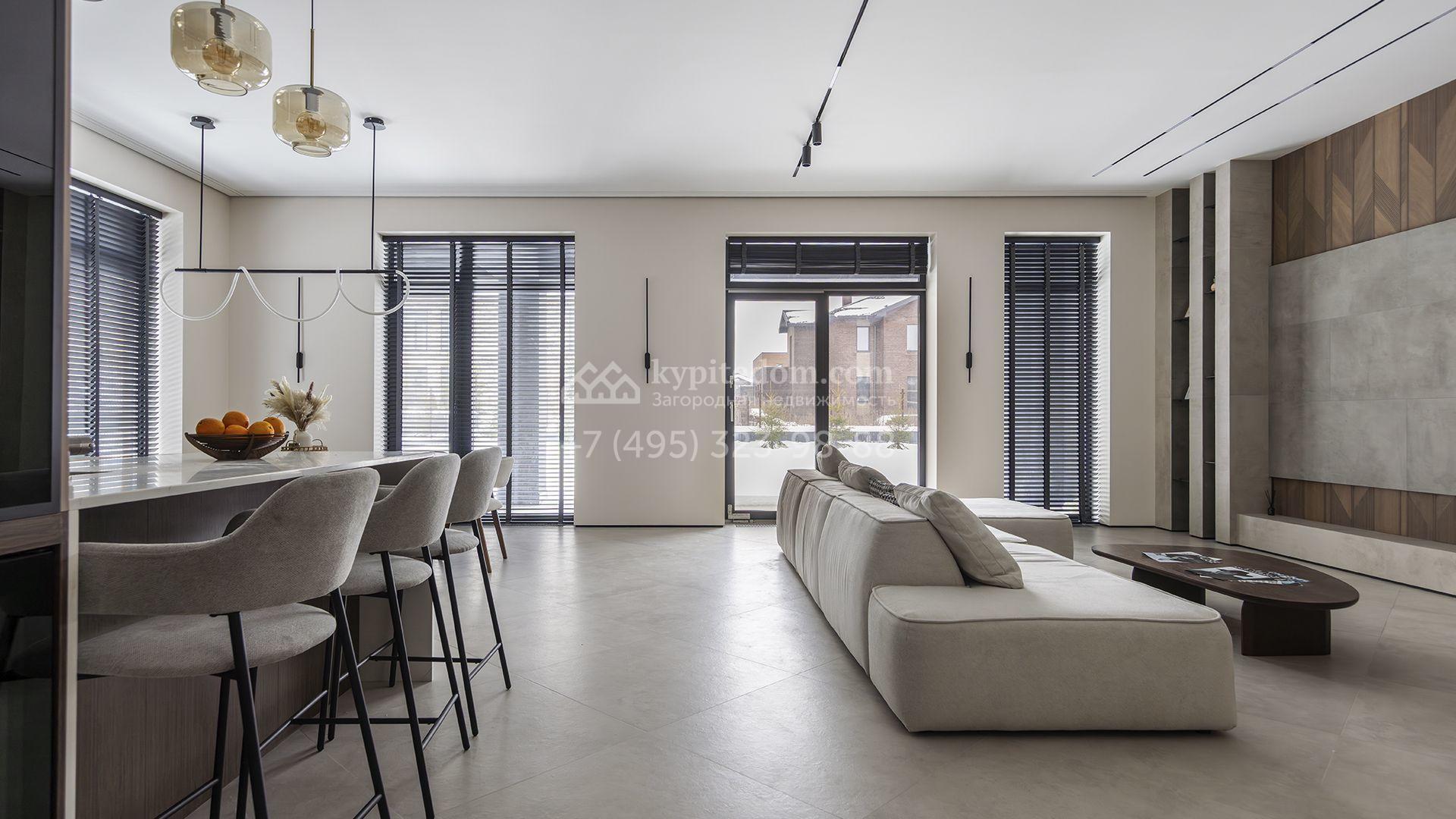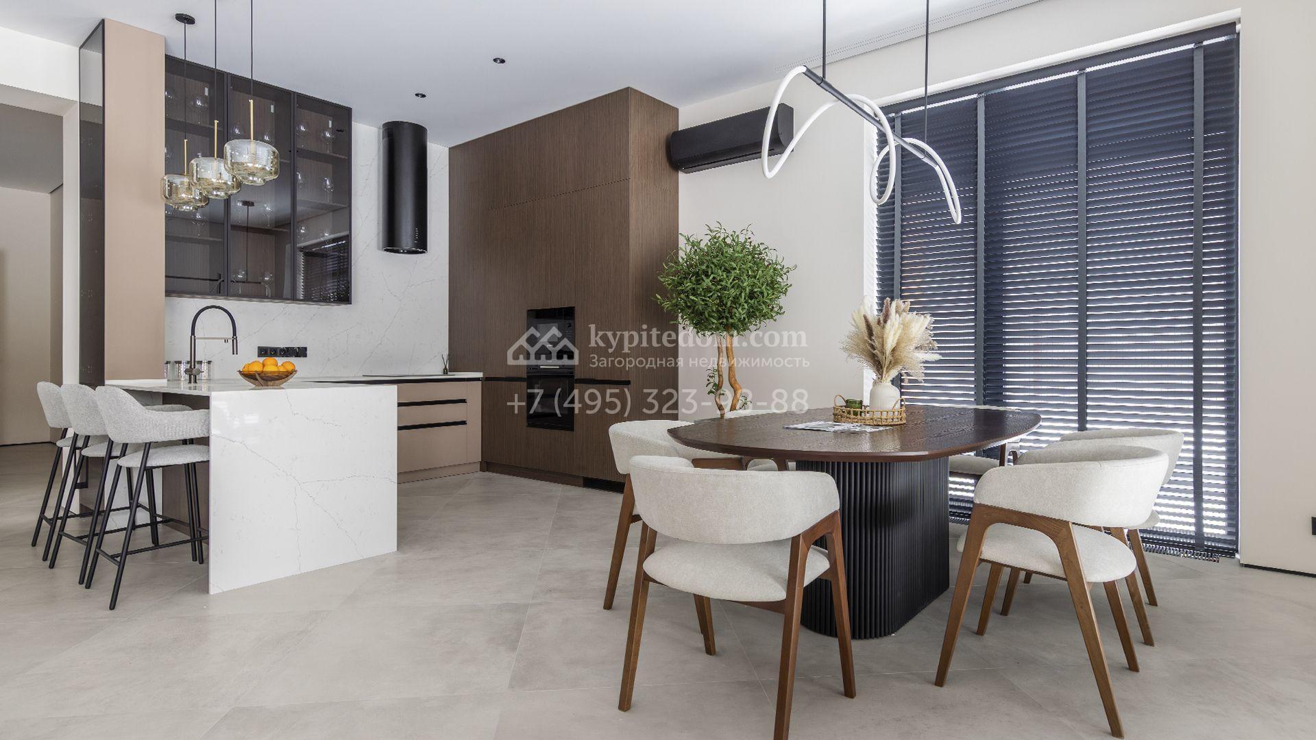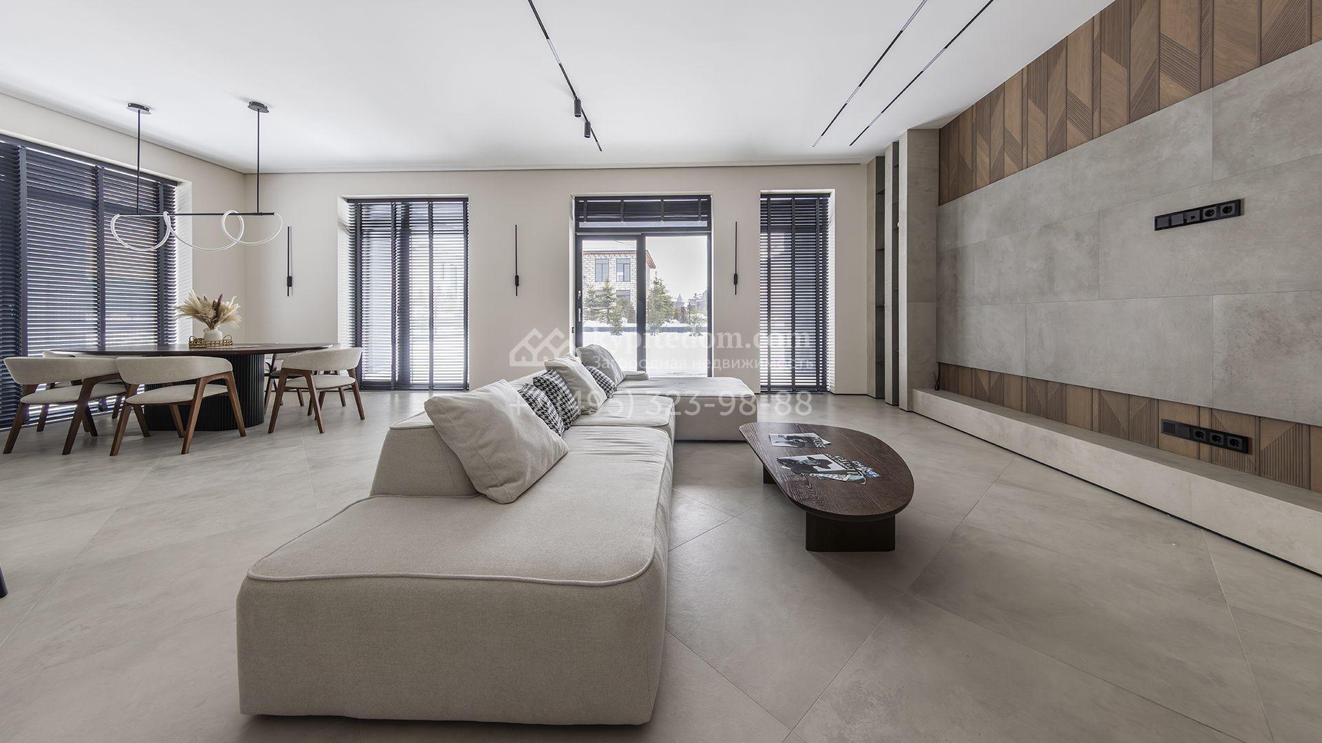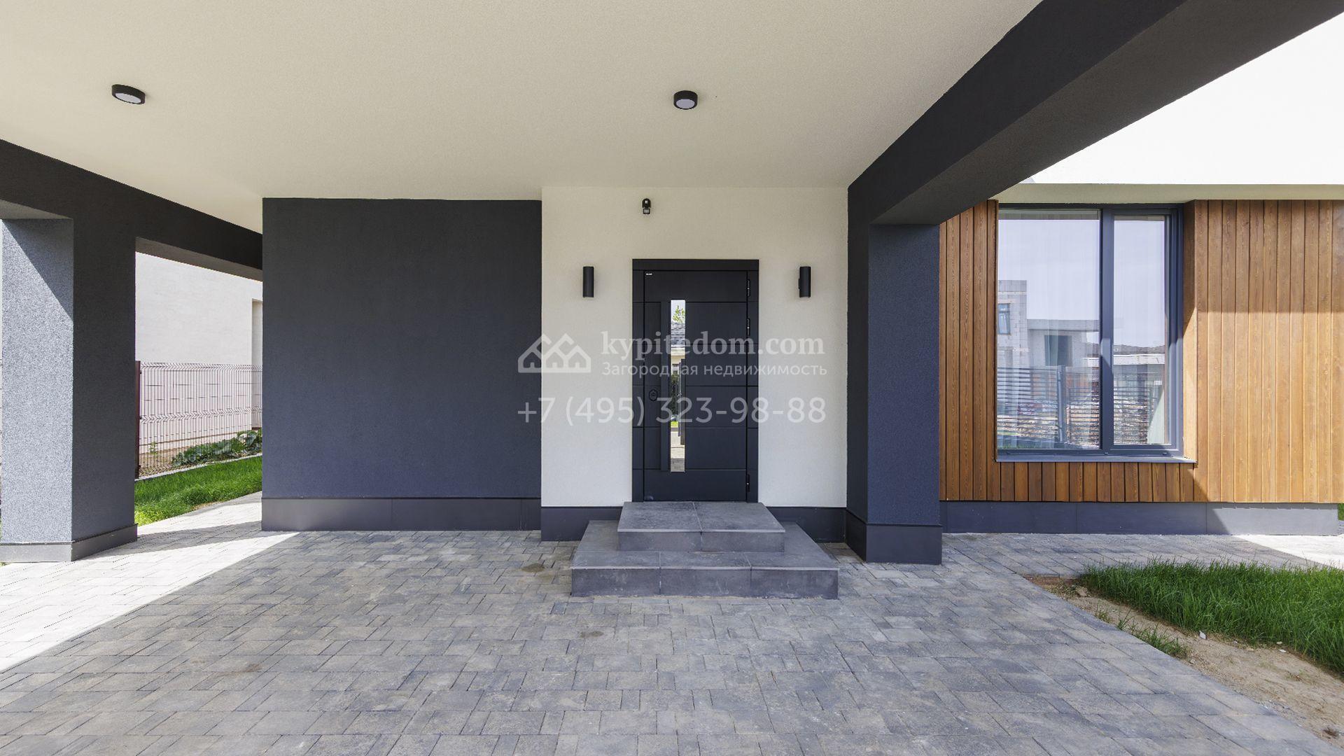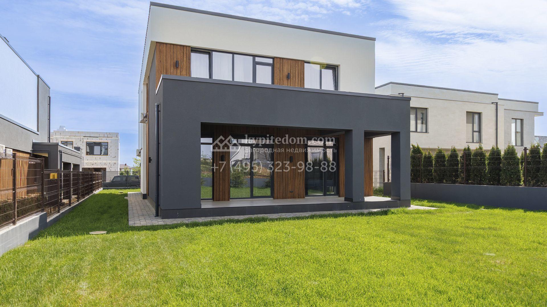 Двухэтажный коттедж площадью 300 м² расположен на полевом участке 7 соток. Фасад здания отличается строгостью форм и современным дизайном. Темные тона эффектно сочетаются с текстурой дерева, а панорамное остекление подчеркивает гармонию практичности и визуальной выразительности. Интерьеры выполнены в минималистичном стиле с использованием высококачественных материалов.