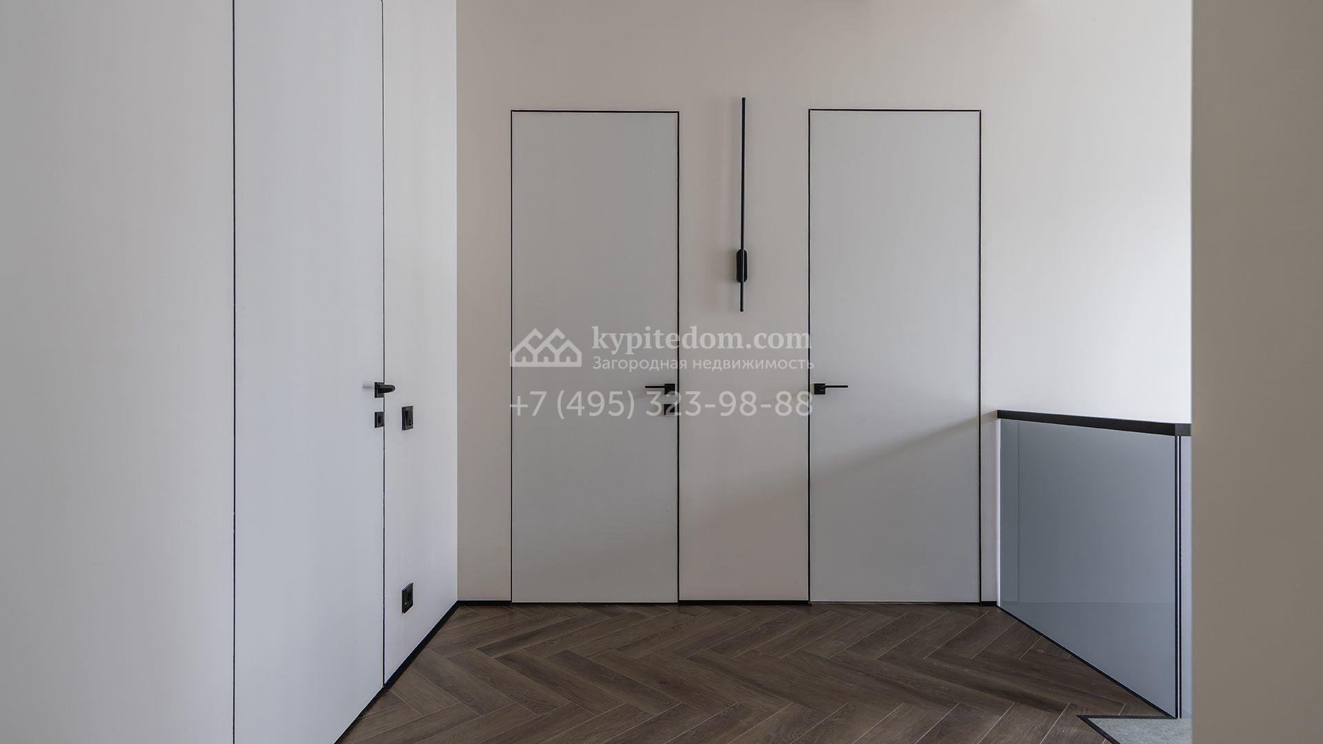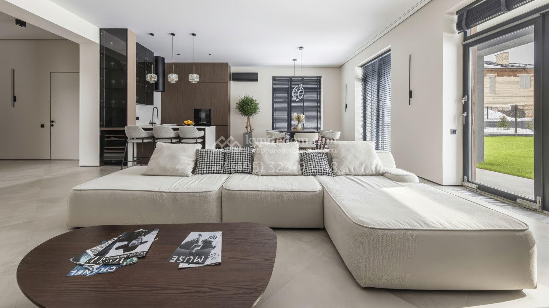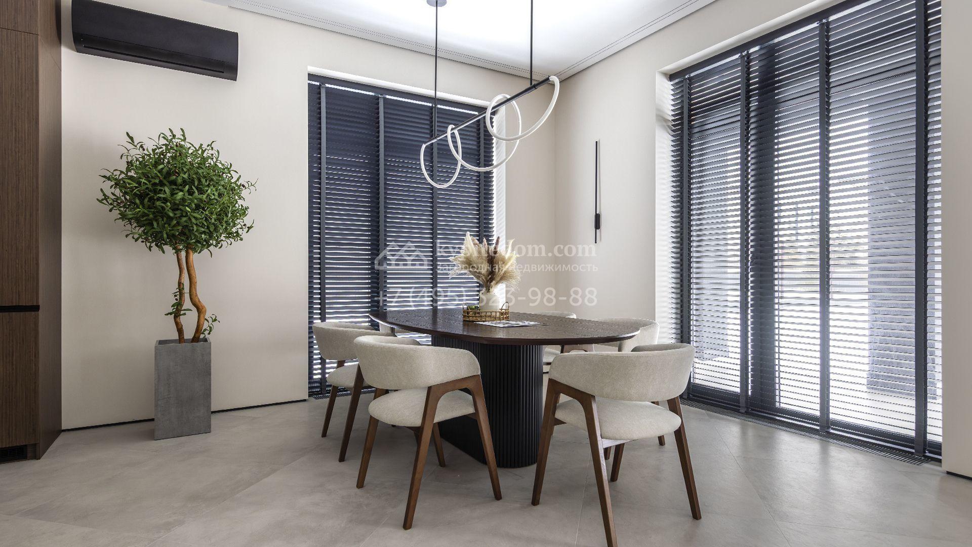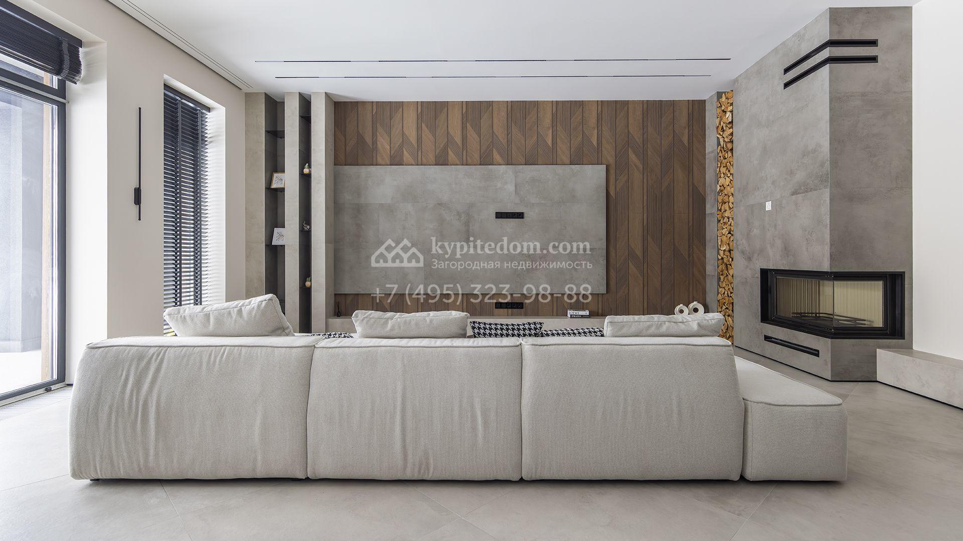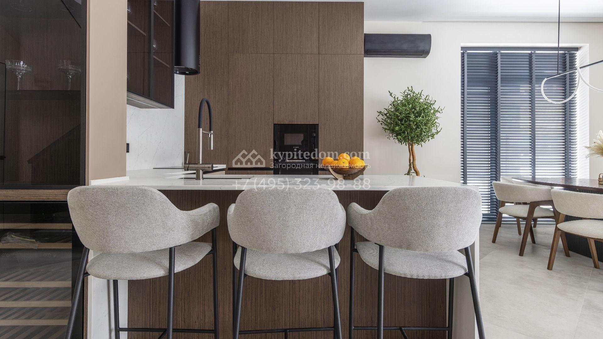 Двухэтажный коттедж площадью 300 м² расположен на полевом участке 7 соток. Фасад здания отличается строгостью форм и современным дизайном. Темные тона эффектно сочетаются с текстурой дерева, а панорамное остекление подчеркивает гармонию практичности и визуальной выразительности. Интерьеры выполнены в минималистичном стиле с использованием высококачественных материалов.