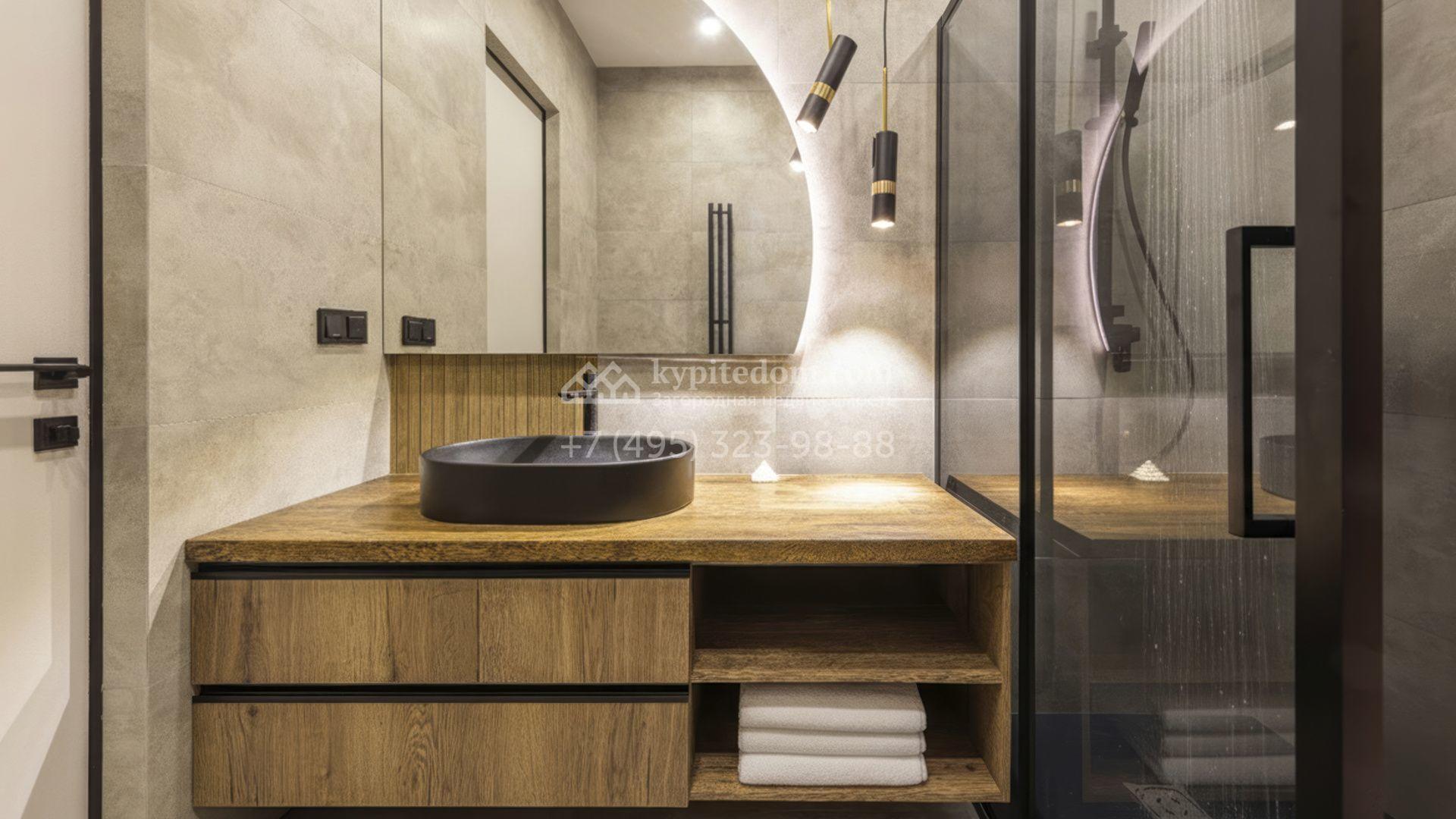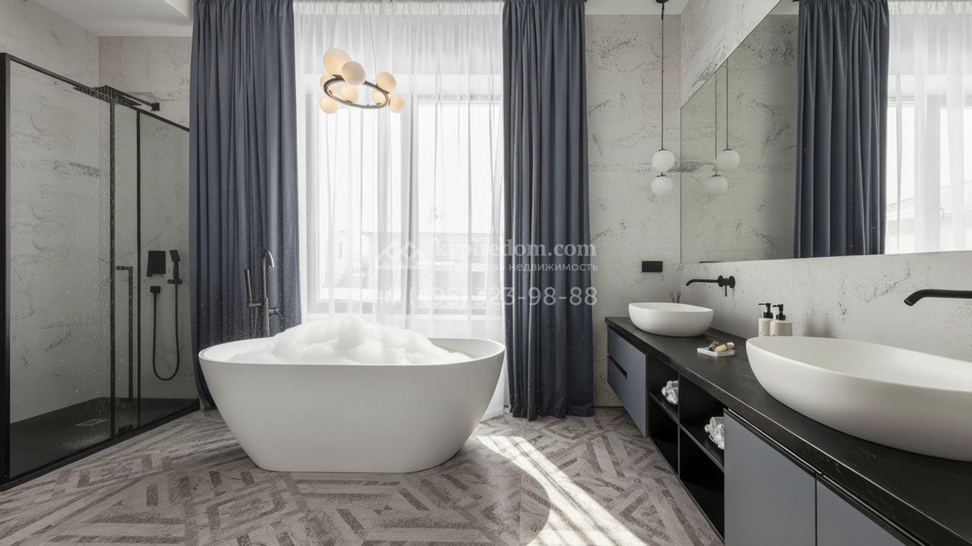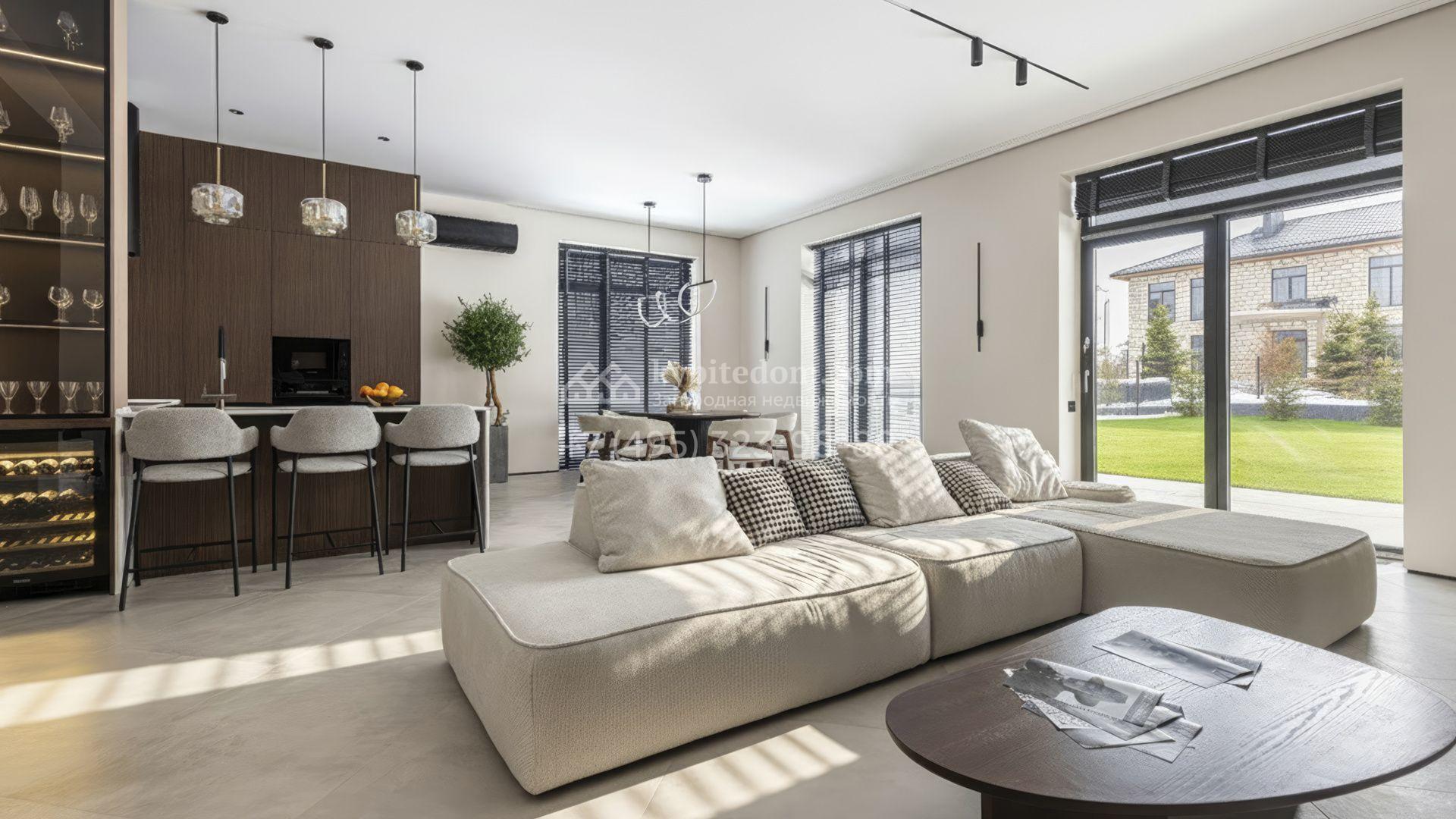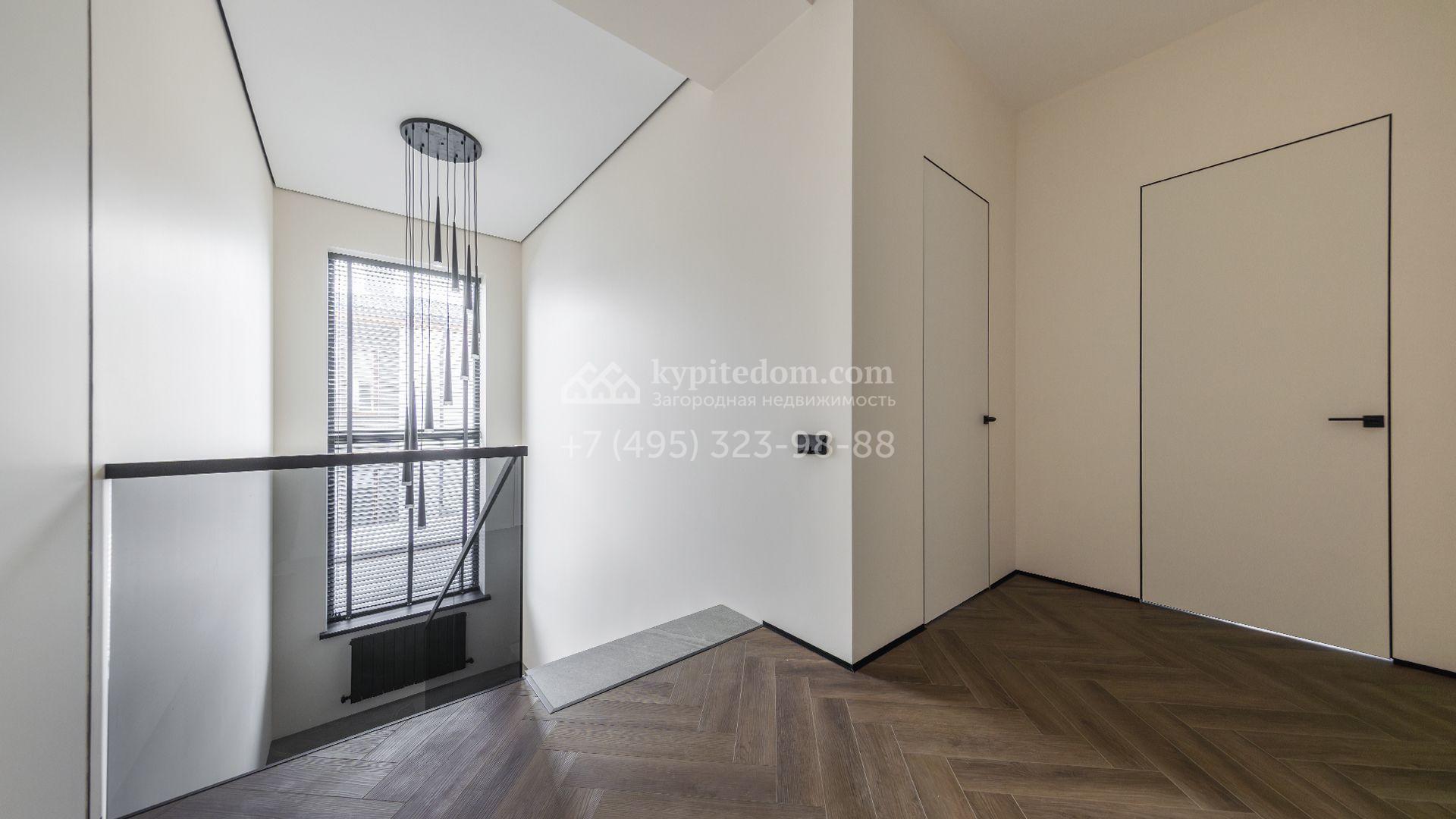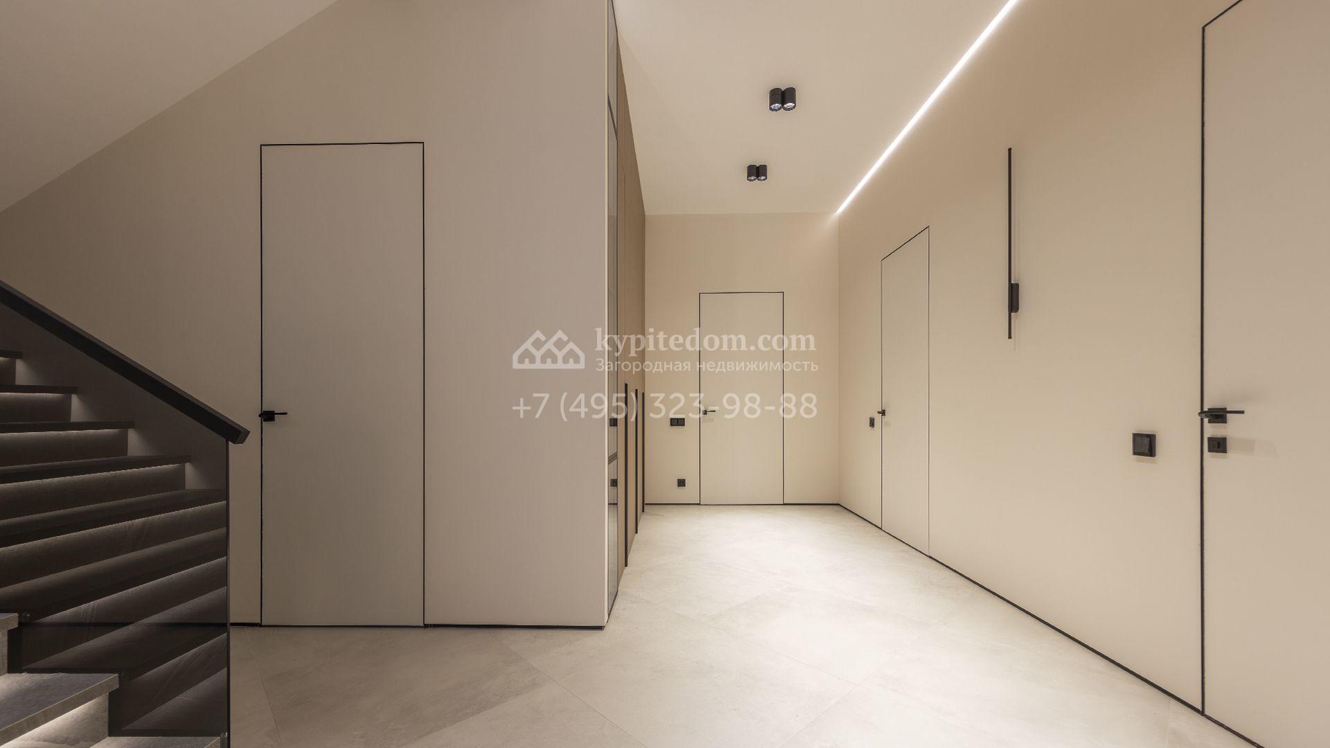 Двухэтажный коттедж площадью 300 м² расположен на полевом участке 7 соток. Фасад здания отличается строгостью форм и современным дизайном. Темные тона эффектно сочетаются с текстурой дерева, а панорамное остекление подчеркивает гармонию практичности и визуальной выразительности. Интерьеры выполнены в минималистичном стиле с использованием высококачественных материалов.