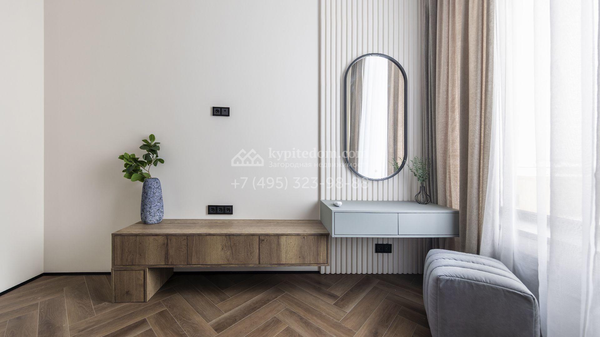Лаконичная отделка и продуманное освещение делают пространство светлым и воздушным. На полу уложены покрытия с ёлочным узором и керамогранит, а стены оформлены деревянными панелями и штукатуркой. Мебель от ведущих европейских фабрик в нейтральных оттенках дополняет концепцию стиля, обеспечивая комфорт и функциональность. Дополнительно при реализации проекта предусмотрено большое количество мест для хранения вещей.