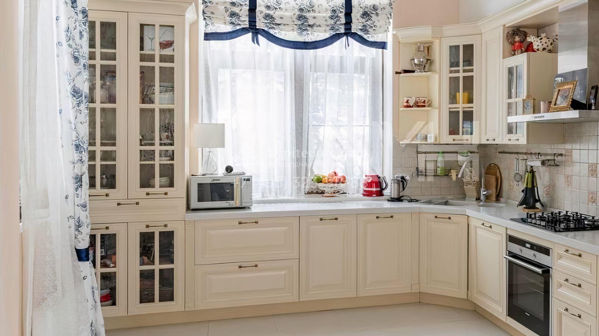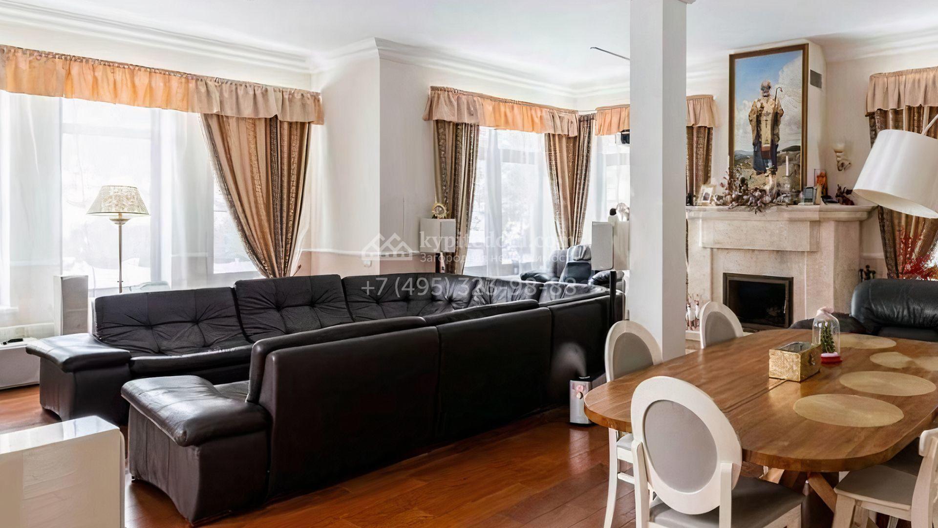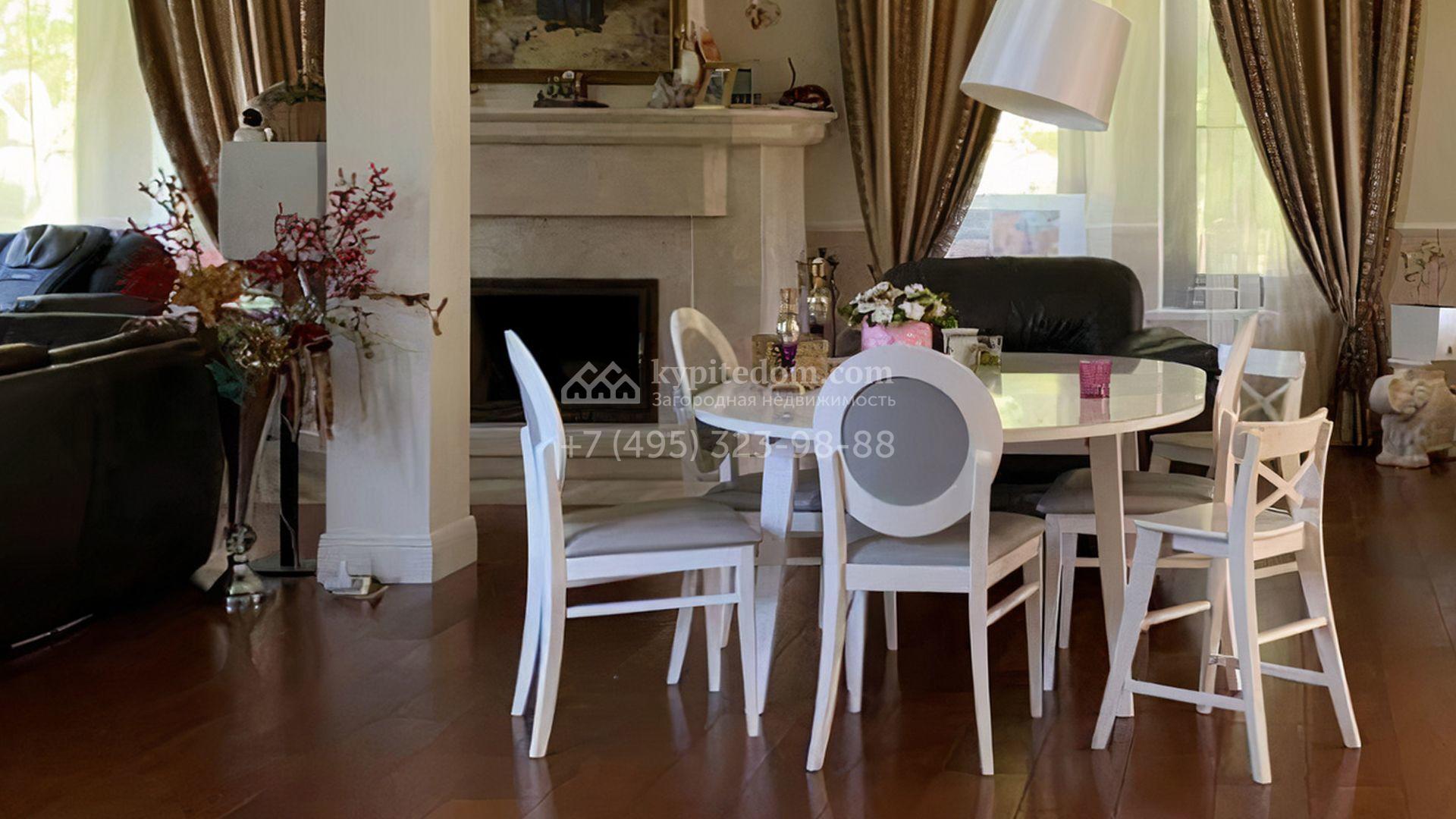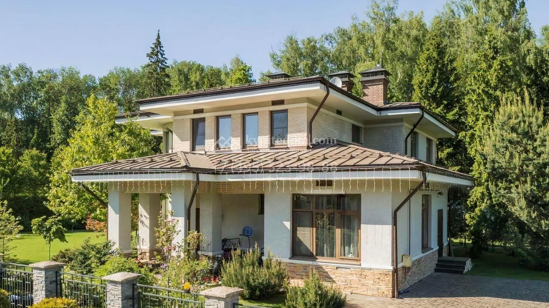 Загородный дом площадью 350 м² построен на просторном участке 23,1 сотки с выходом в лес. Фасад здания вдохновлен стилем архитектора Фрэнка Ллойда Райта и облицован бежевыми штукатуркой и плиткой. В отделке интерьера с элементами классики использованы светлые, теплые оттенки. В резиденции разместили 4 спальни, одна из которых со своим камином, кухню, обеденную зону и гостиную с камином. На участке выполнен ландшафтный дизайн, вымощены дорожки, высажены деревья и кустарники, засеян газон.