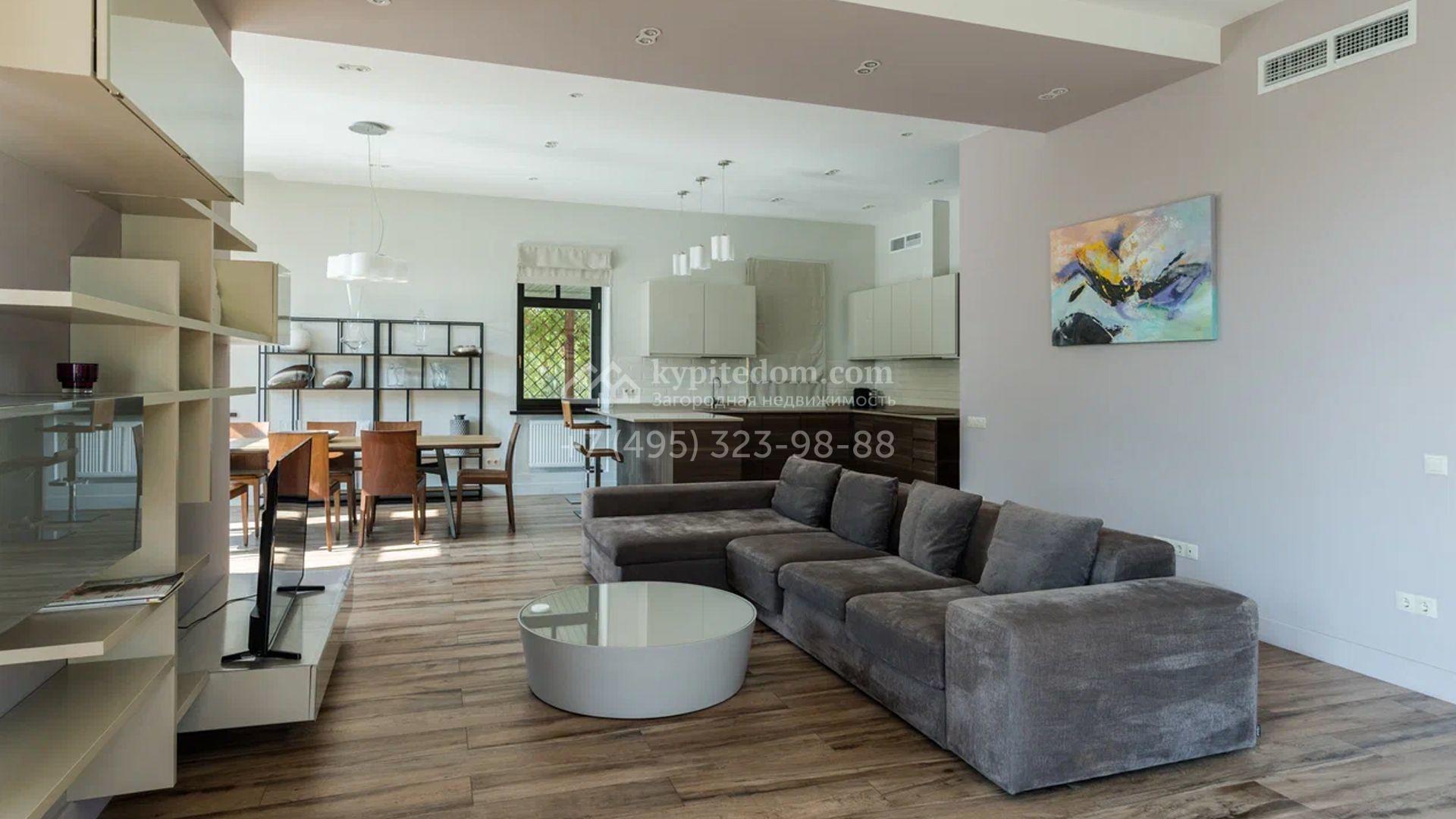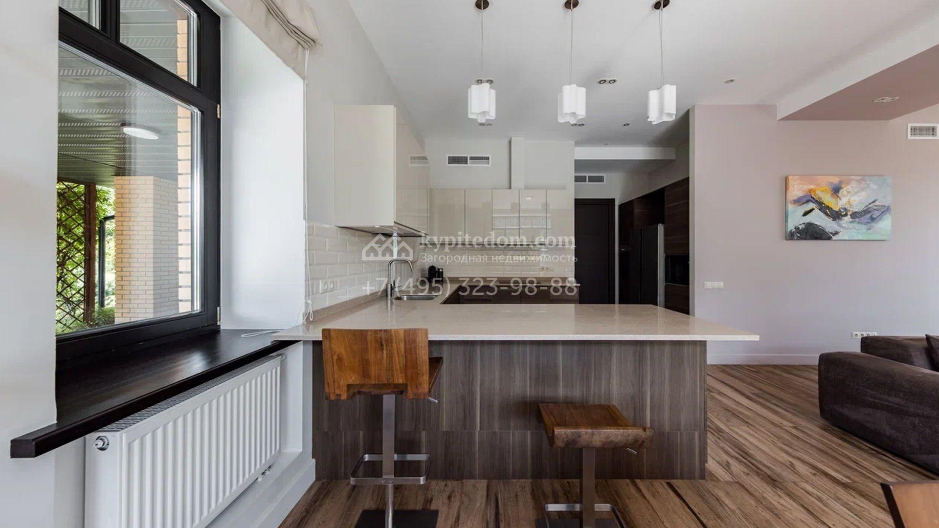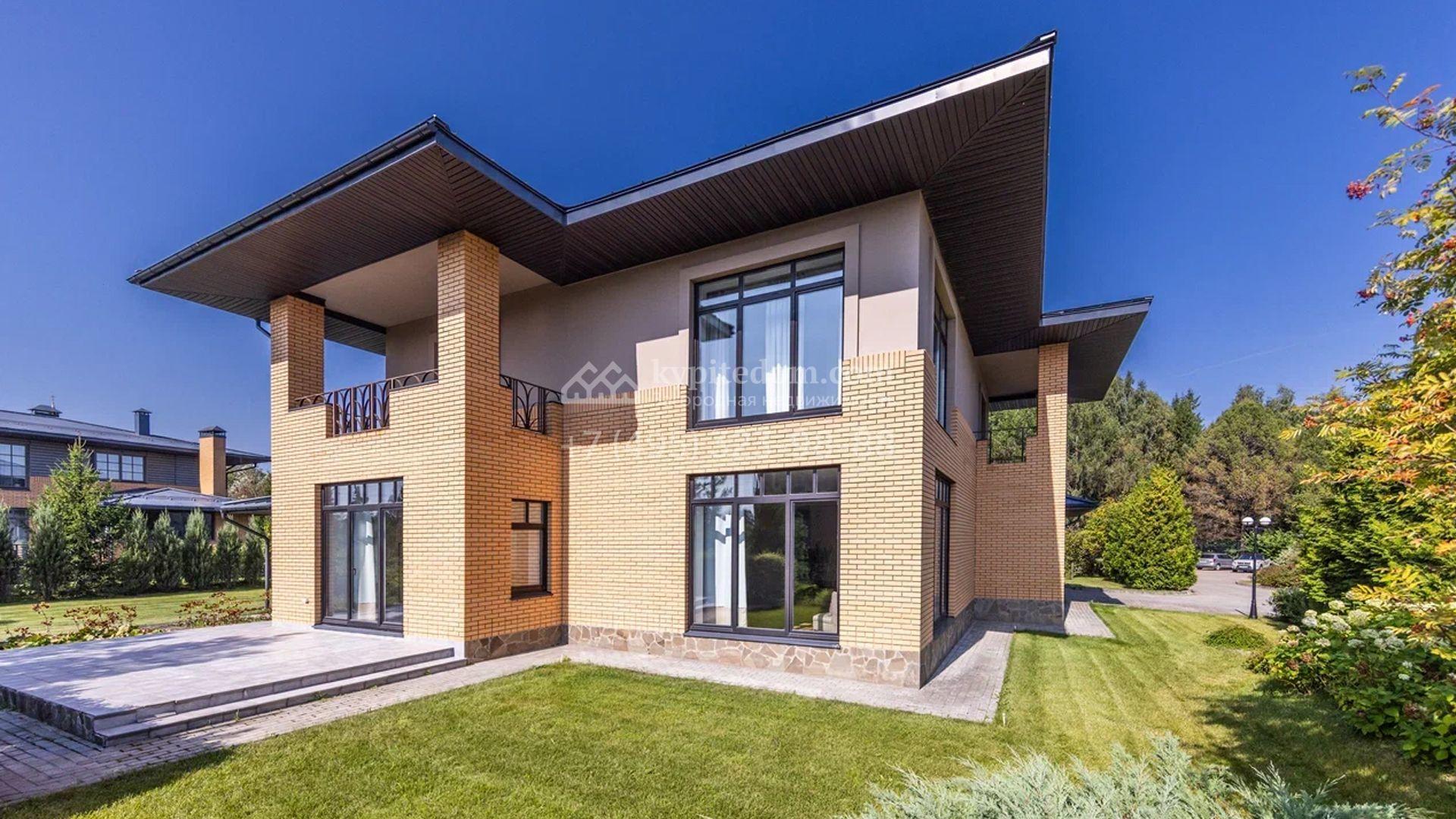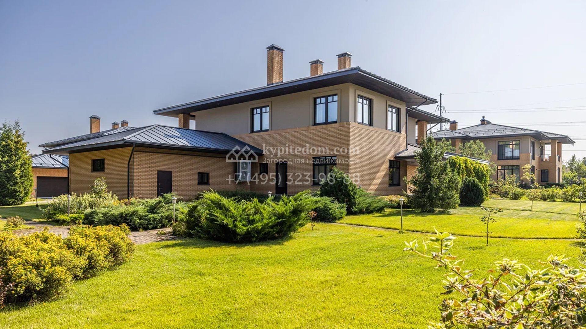 Двухэтажный загородный дом площадью 409 м² с отделкой «под ключ» расположен на участке 21 сотка неподалеку от живописной Рождественской церкви. Фасад дома в стиле американского архитектора Ллойда Райта выполнен в бежево-серой гамме. Сквозь большие панорамные окна в дом проникает максимум естественного света. Отделка в современном стиле в нейтральных тонах оставляет простор для яркого декора. В доме спланирована просторная столовая-кухня-гостиная, блок для персонала со спальней и техническими помещениями, и 4 спальни хозяев включая мастер-спальню с приватными санузлом и гардеробной. На участке выполнили ландшафтные работы, засеяли газон. Гараж для машины пристроен к дому.