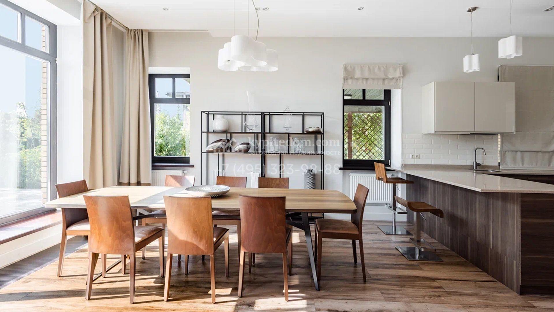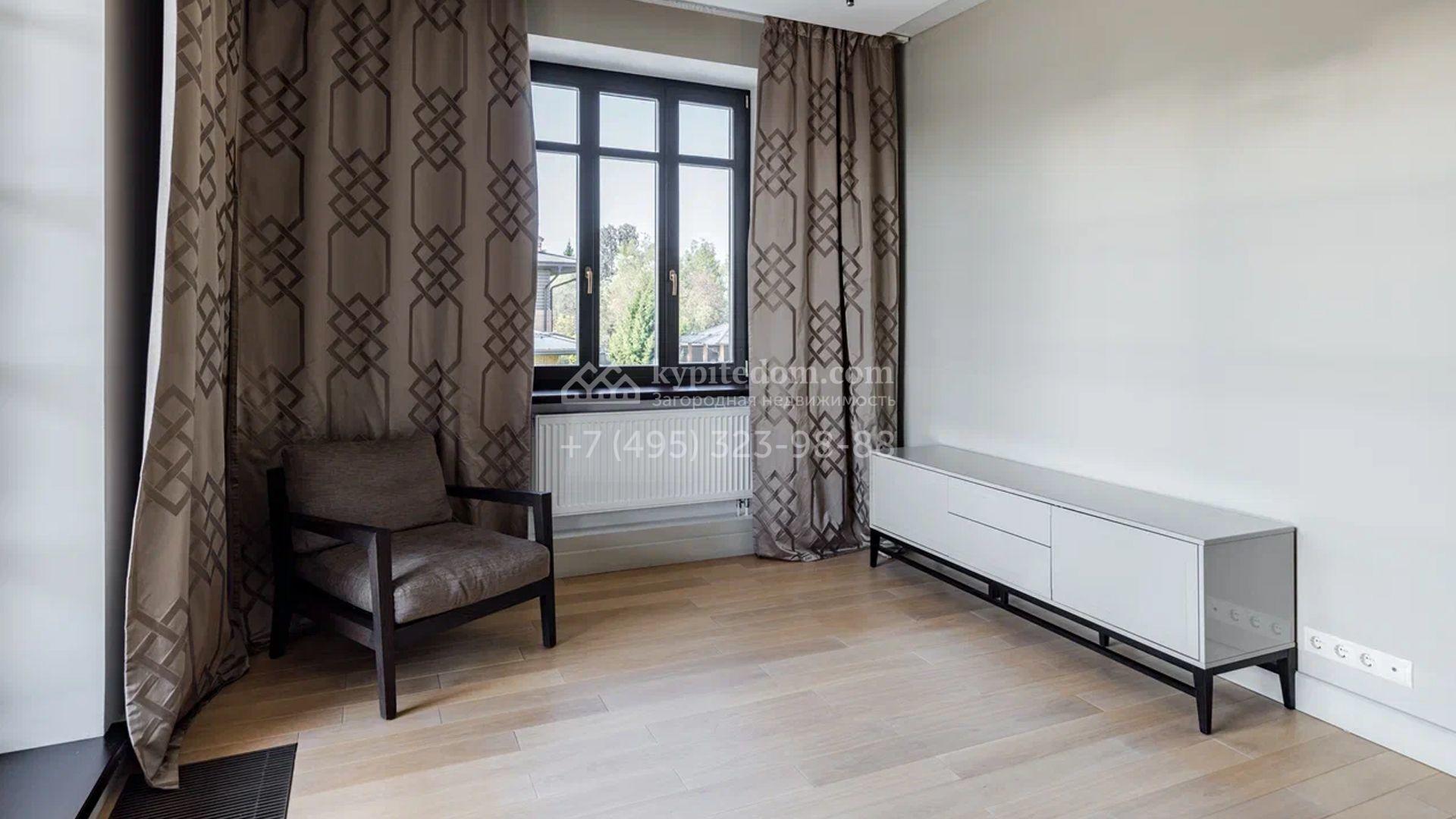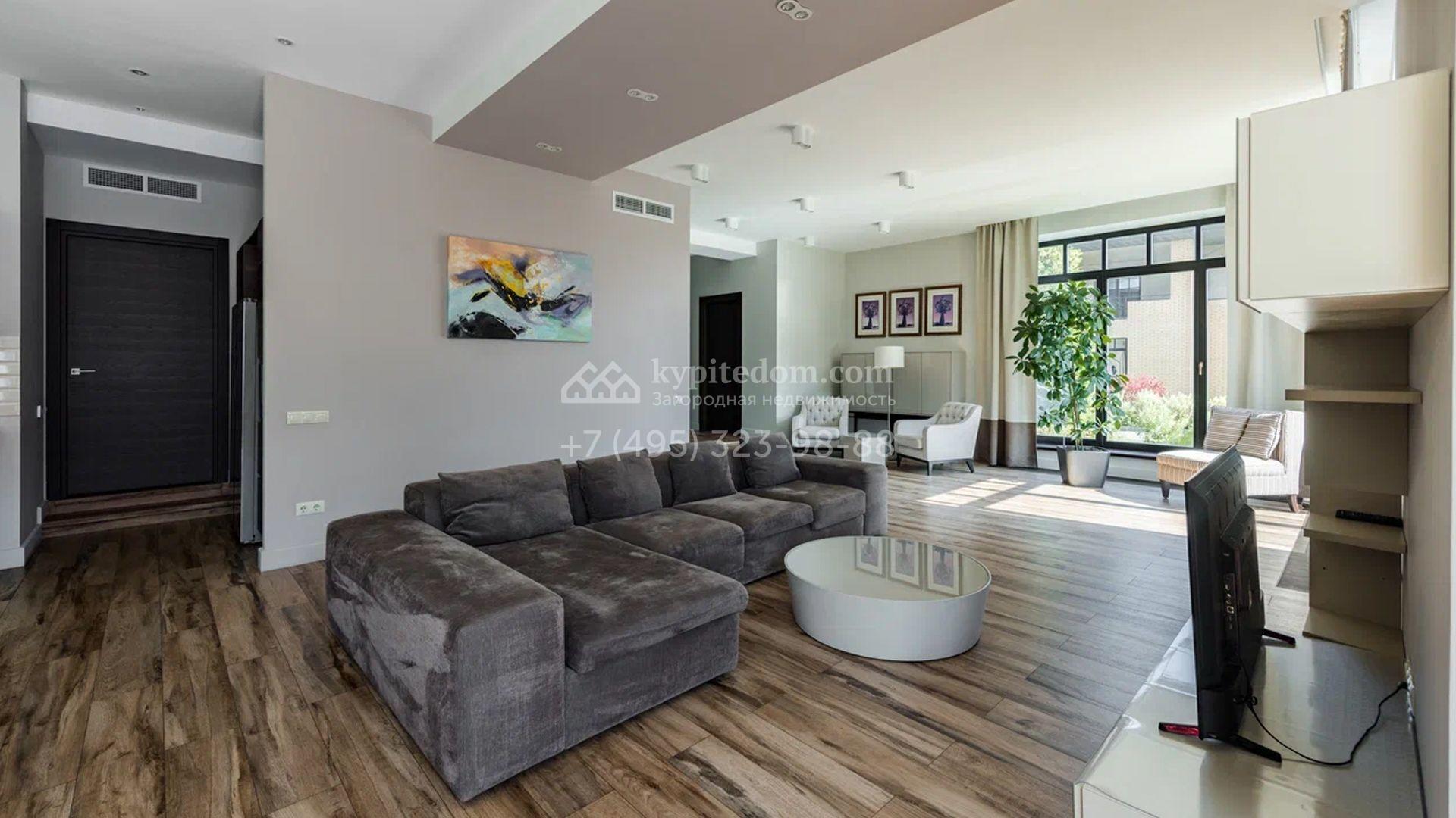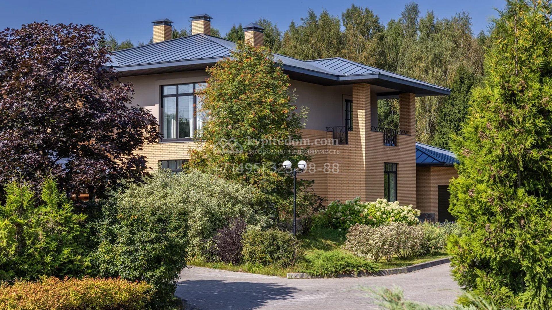 Двухэтажный загородный дом площадью 409 м² с отделкой «под ключ» расположен на участке 21 сотка неподалеку от живописной Рождественской церкви. Фасад дома в стиле американского архитектора Ллойда Райта выполнен в бежево-серой гамме. Сквозь большие панорамные окна в дом проникает максимум естественного света. Отделка в современном стиле в нейтральных тонах оставляет простор для яркого декора. В доме спланирована просторная столовая-кухня-гостиная, блок для персонала со спальней и техническими помещениями, и 4 спальни хозяев включая мастер-спальню с приватными санузлом и гардеробной. На участке выполнили ландшафтные работы, засеяли газон. Гараж для машины пристроен к дому.