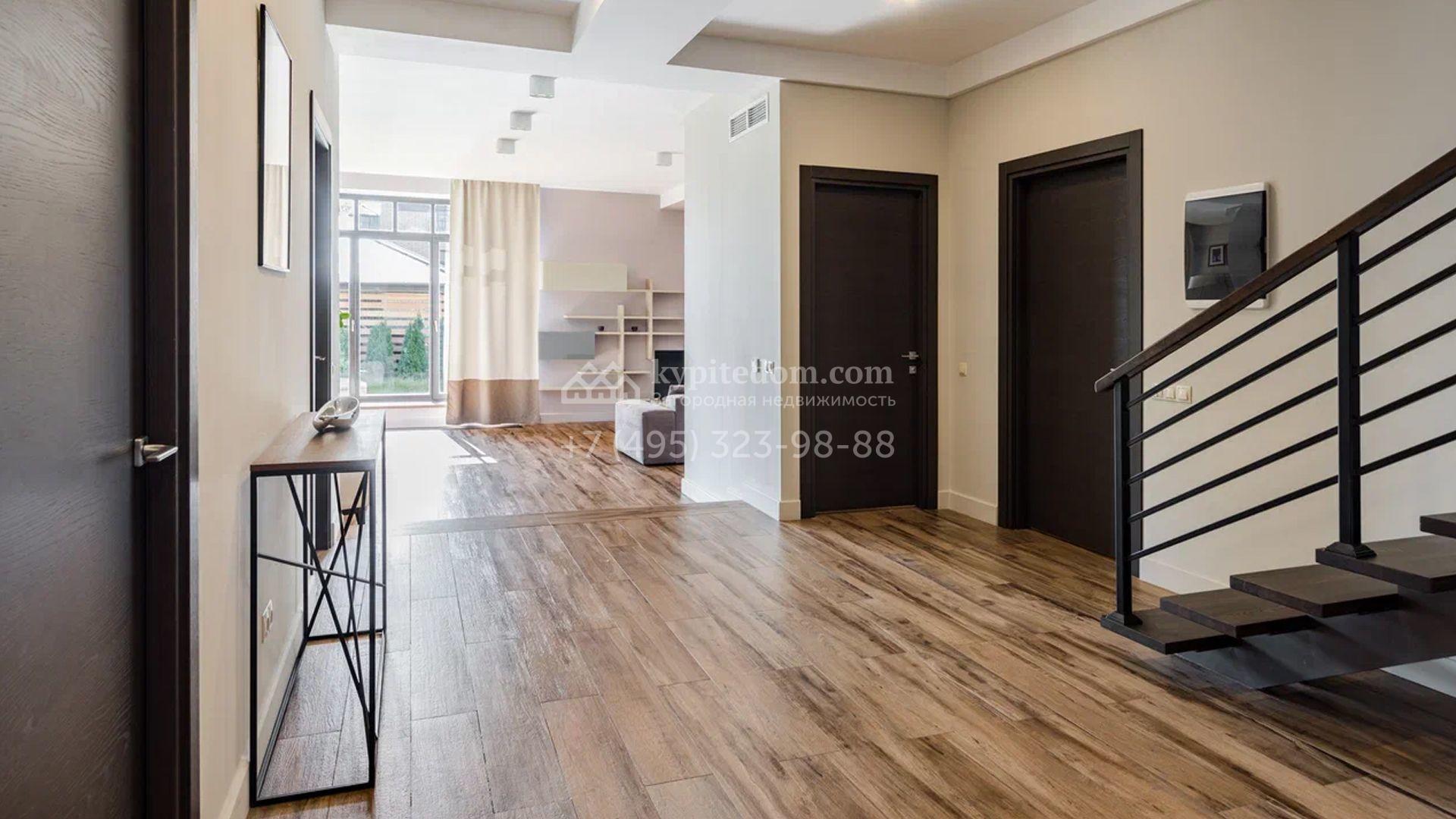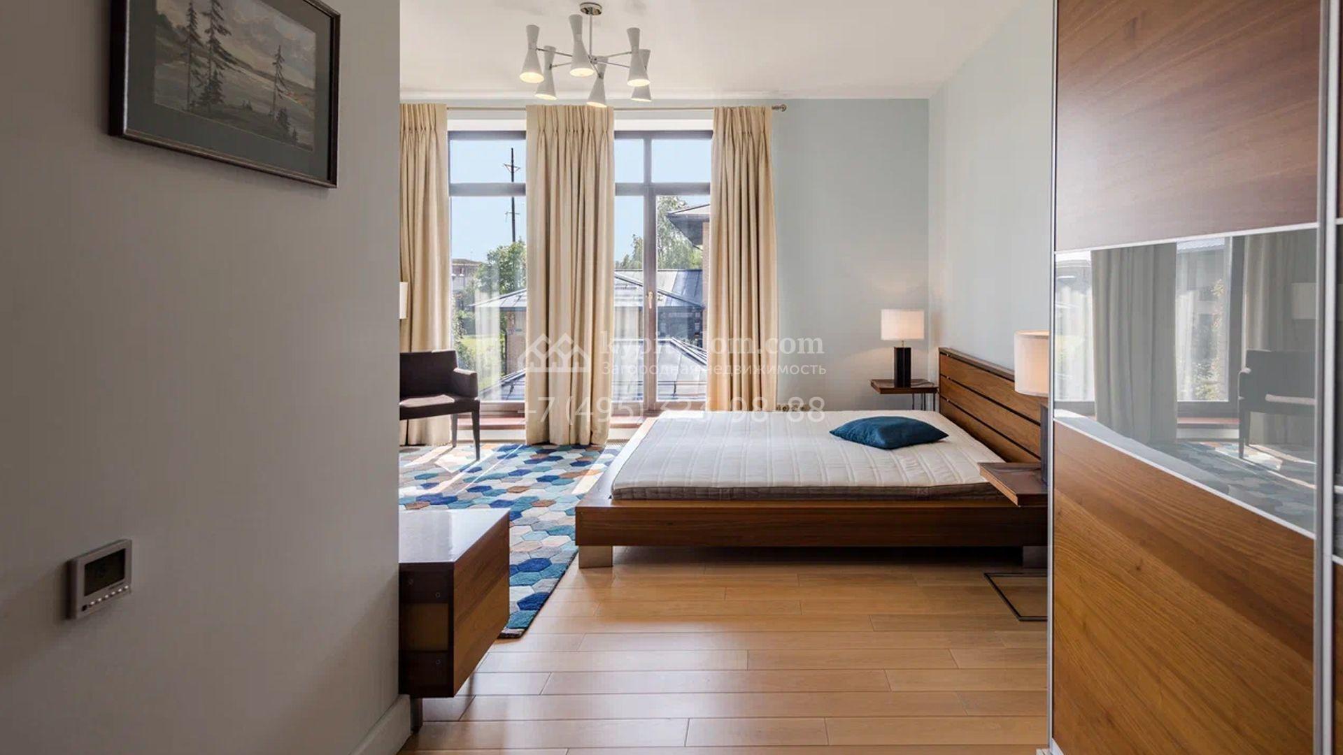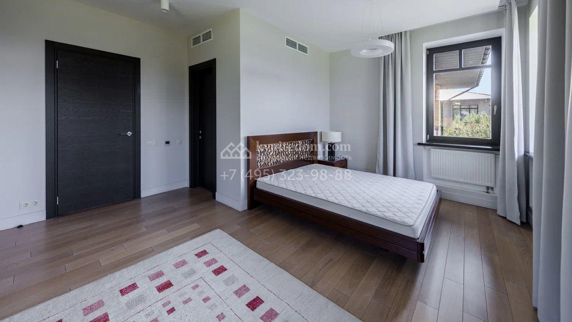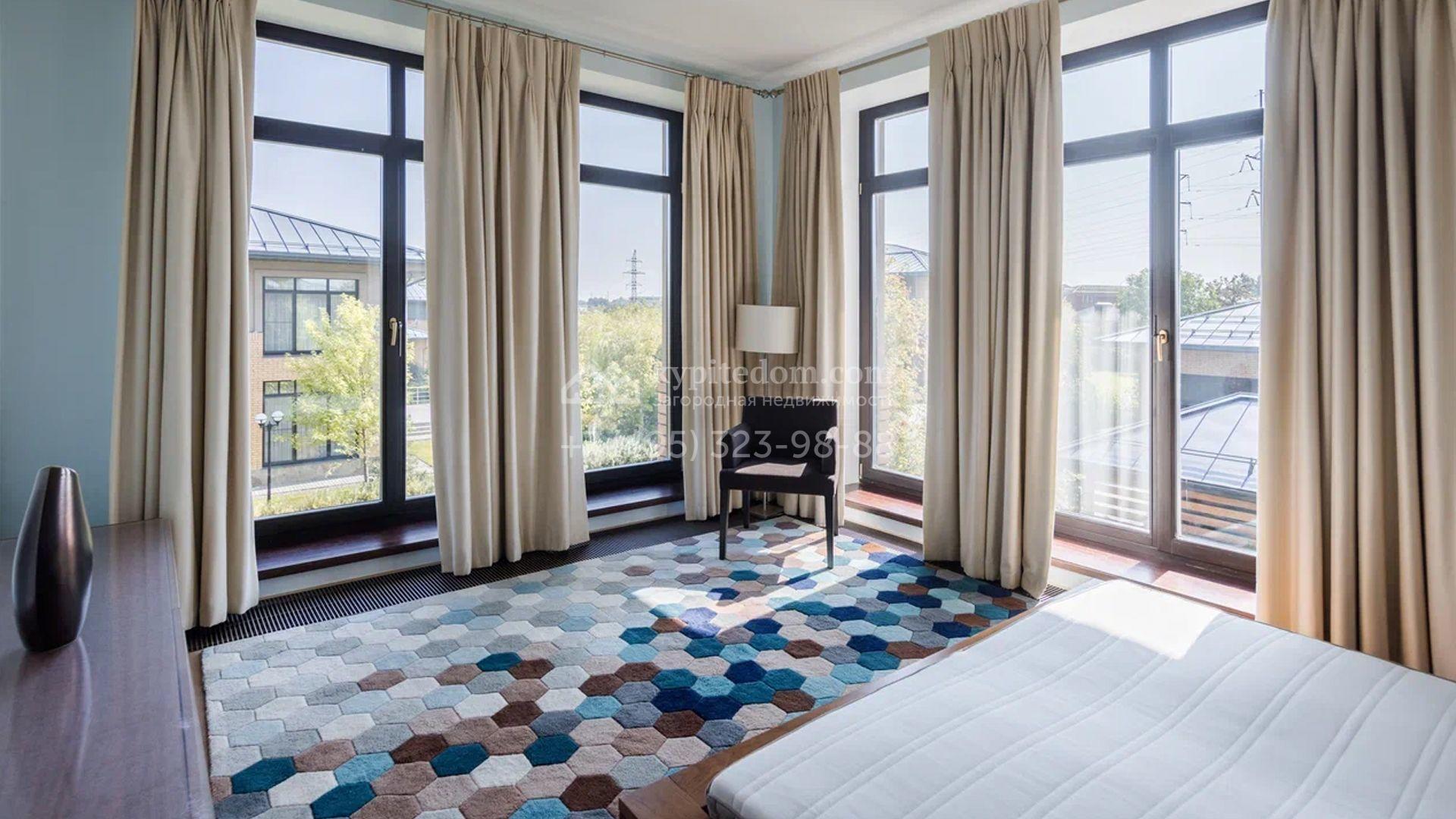 Двухэтажный загородный дом площадью 409 м² с отделкой «под ключ» расположен на участке 21 сотка неподалеку от живописной Рождественской церкви. Фасад дома в стиле американского архитектора Ллойда Райта выполнен в бежево-серой гамме. Сквозь большие панорамные окна в дом проникает максимум естественного света. Отделка в современном стиле в нейтральных тонах оставляет простор для яркого декора. В доме спланирована просторная столовая-кухня-гостиная, блок для персонала со спальней и техническими помещениями, и 4 спальни хозяев включая мастер-спальню с приватными санузлом и гардеробной. На участке выполнили ландшафтные работы, засеяли газон. Гараж для машины пристроен к дому.