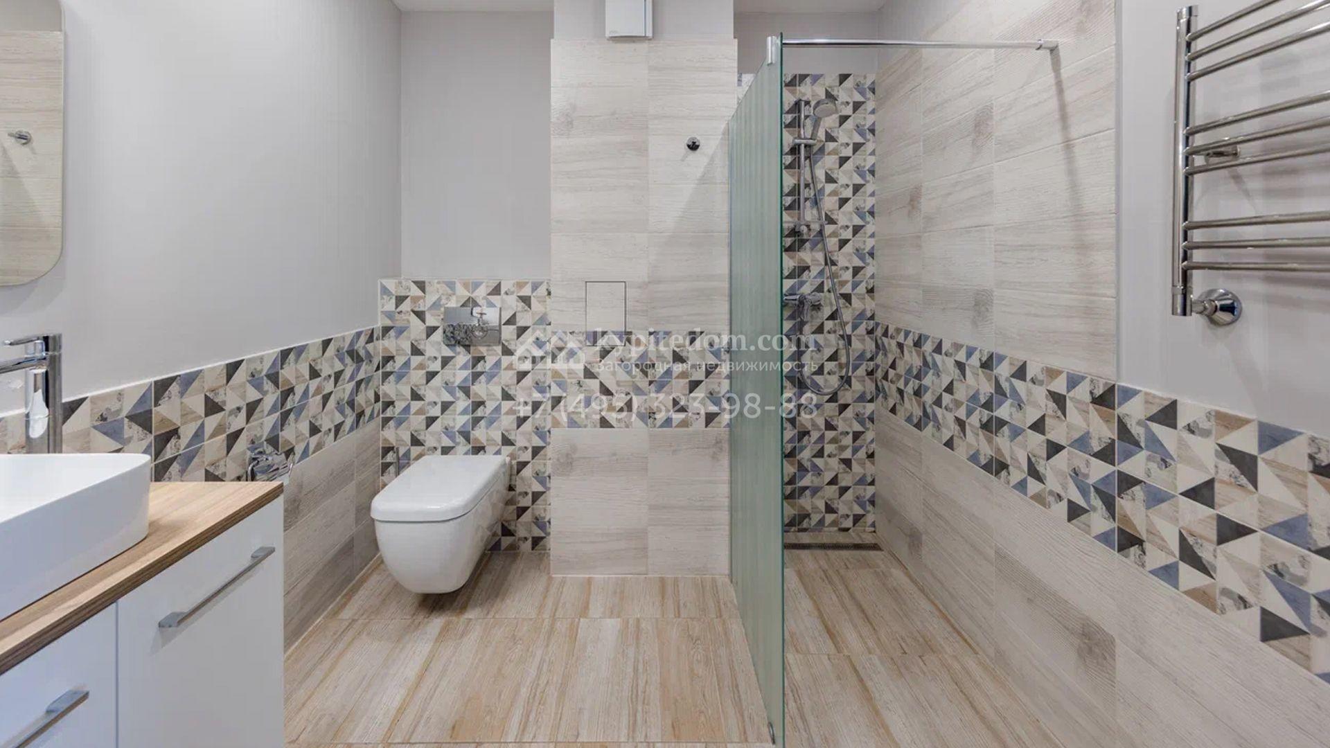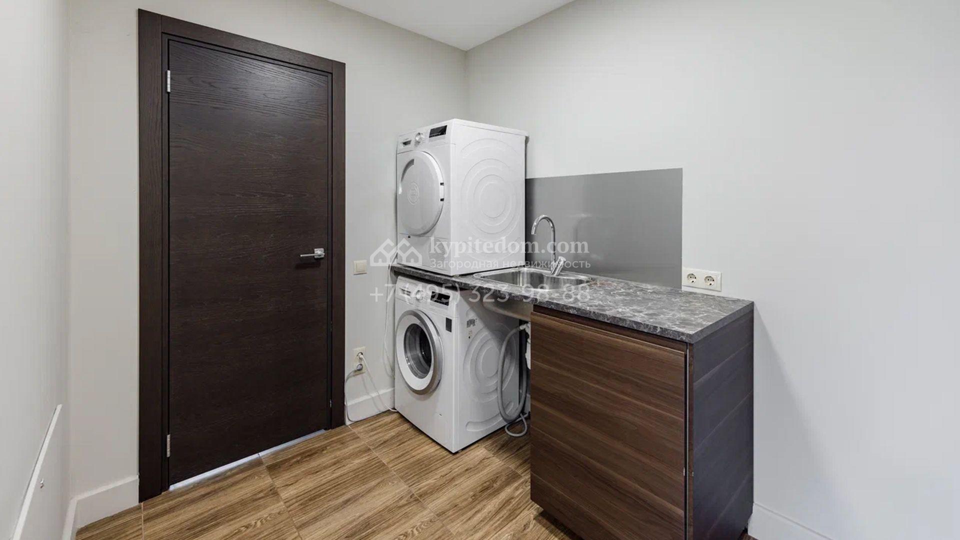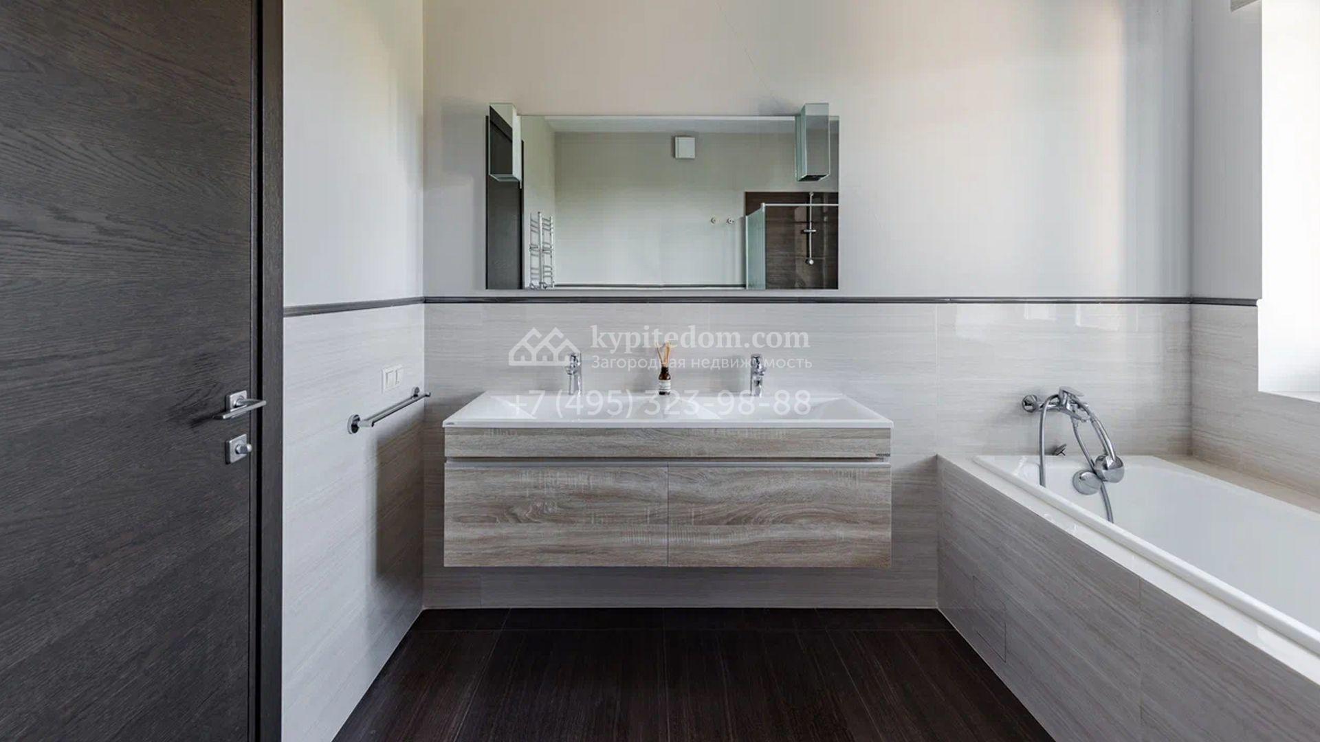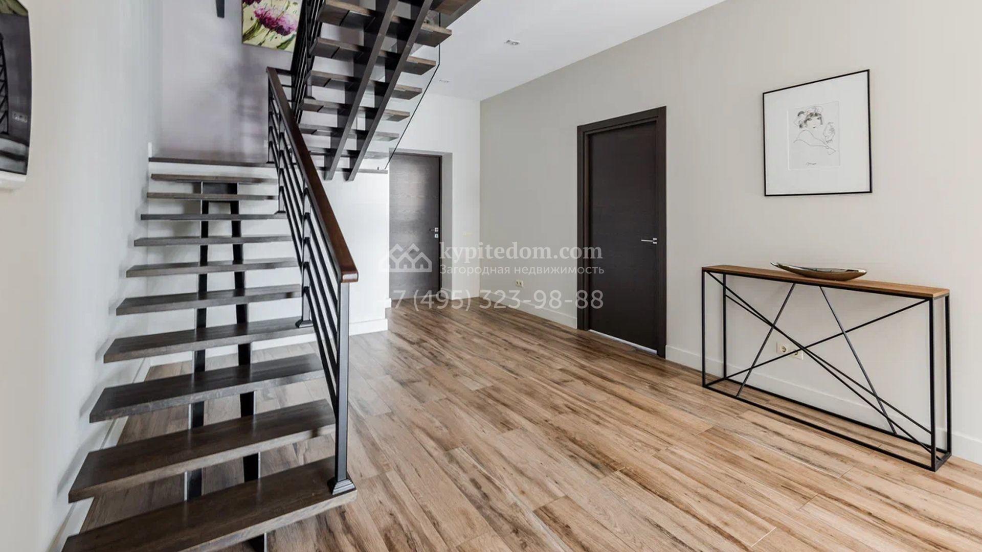 Двухэтажный загородный дом площадью 409 м² с отделкой «под ключ» расположен на участке 21 сотка неподалеку от живописной Рождественской церкви. Фасад дома в стиле американского архитектора Ллойда Райта выполнен в бежево-серой гамме. Сквозь большие панорамные окна в дом проникает максимум естественного света. Отделка в современном стиле в нейтральных тонах оставляет простор для яркого декора. В доме спланирована просторная столовая-кухня-гостиная, блок для персонала со спальней и техническими помещениями, и 4 спальни хозяев включая мастер-спальню с приватными санузлом и гардеробной. На участке выполнили ландшафтные работы, засеяли газон. Гараж для машины пристроен к дому.