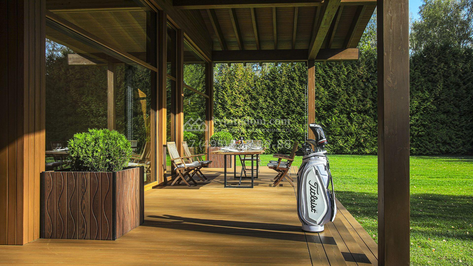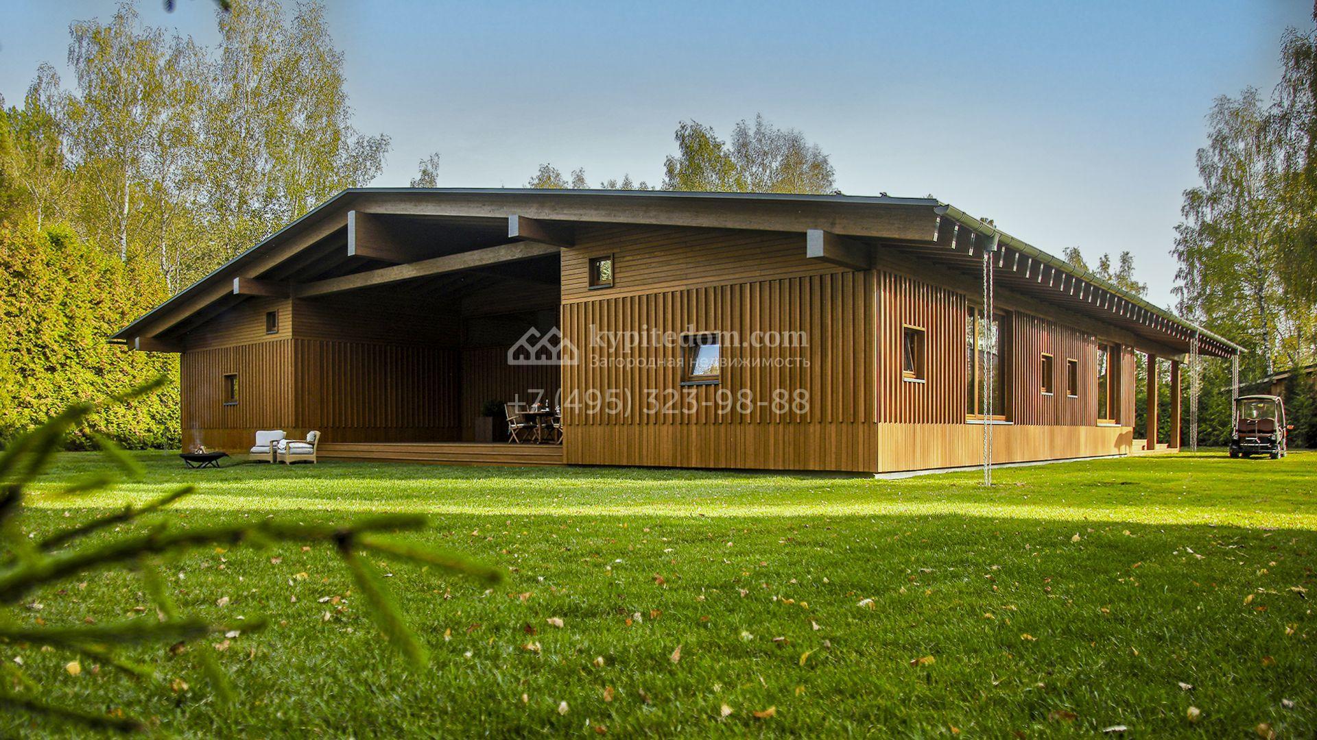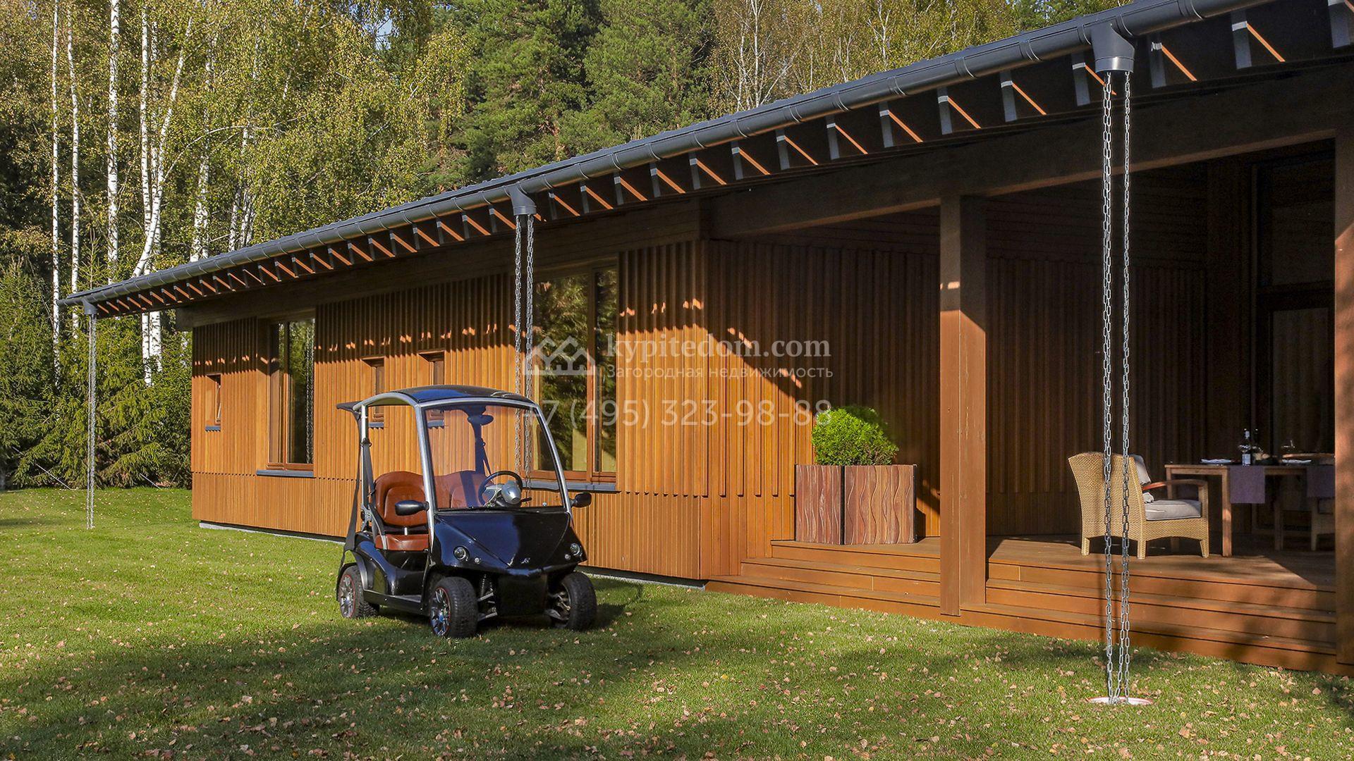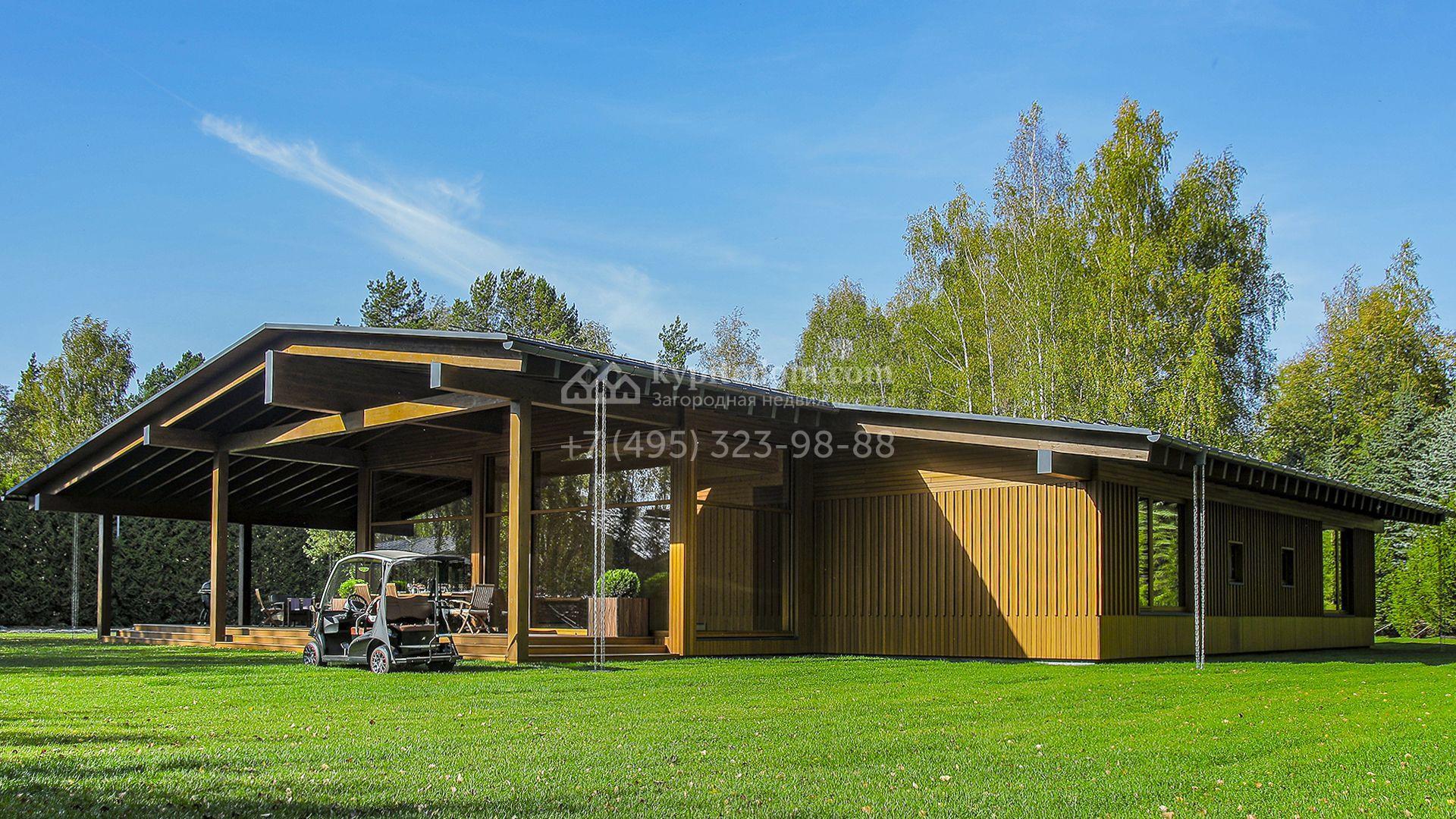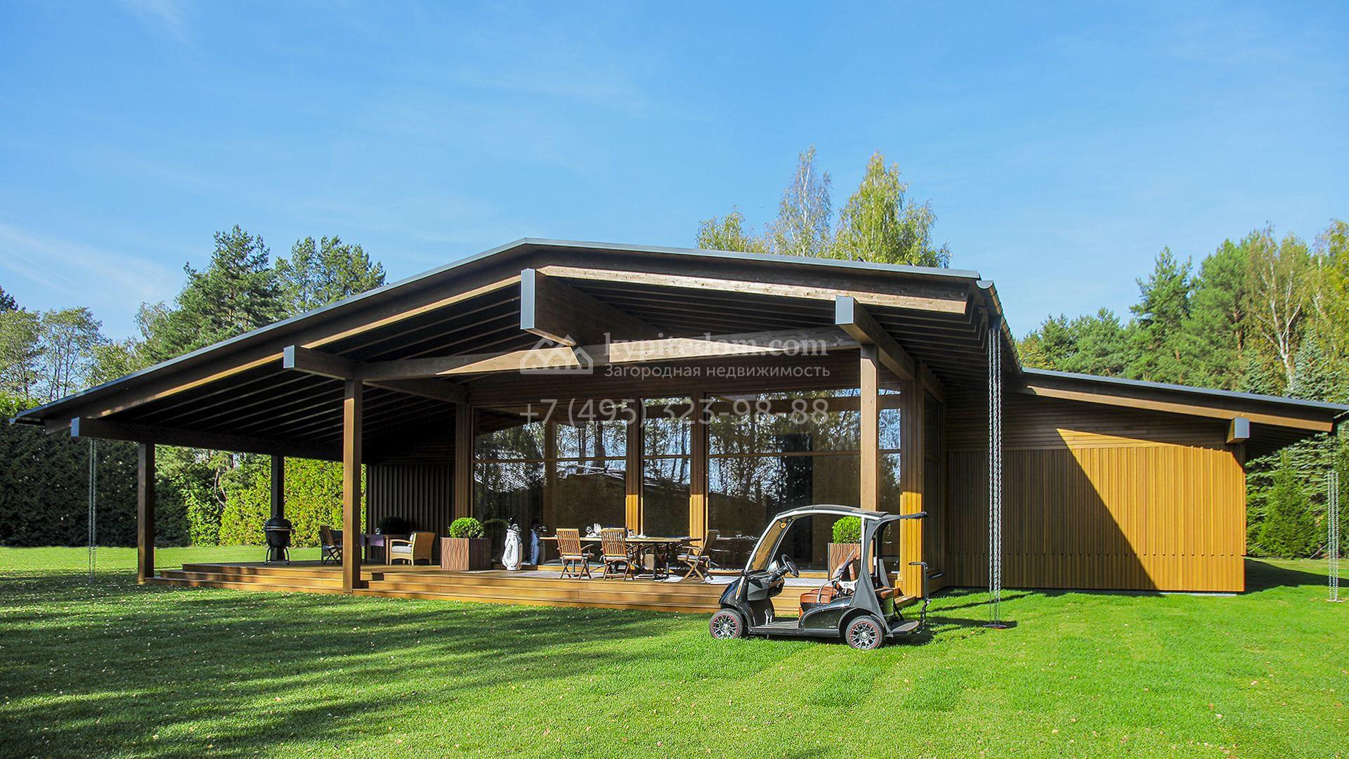 Загородный коттедж площадью 330 м² расположен на полевом участке 35 соток с живописным видом на гольф-поле. Деревянный фасад в стиле шале подчёркивают выразительные широкие свесы крыши и панорамное остекление. Отсутствие отделки позволяет будущим владельцам реализовать любой дизайн-проект.
