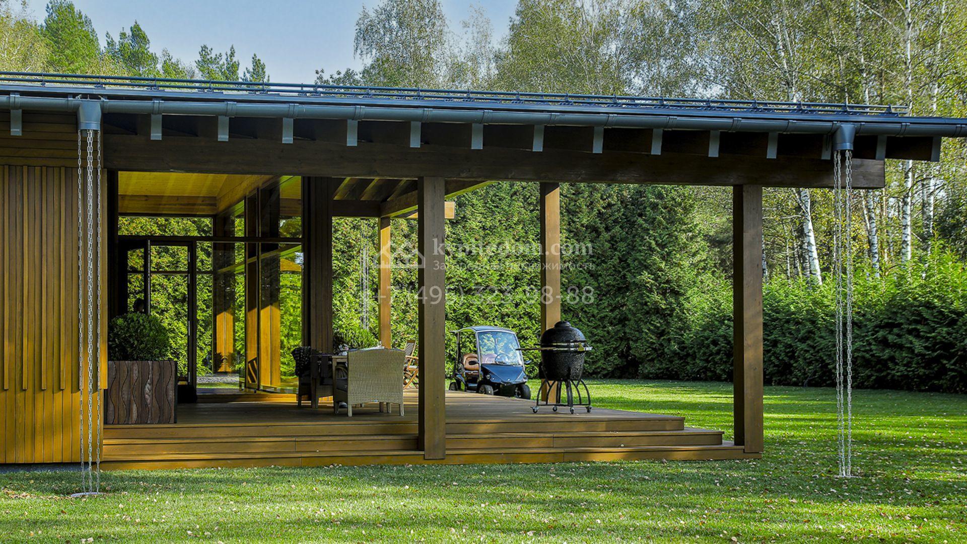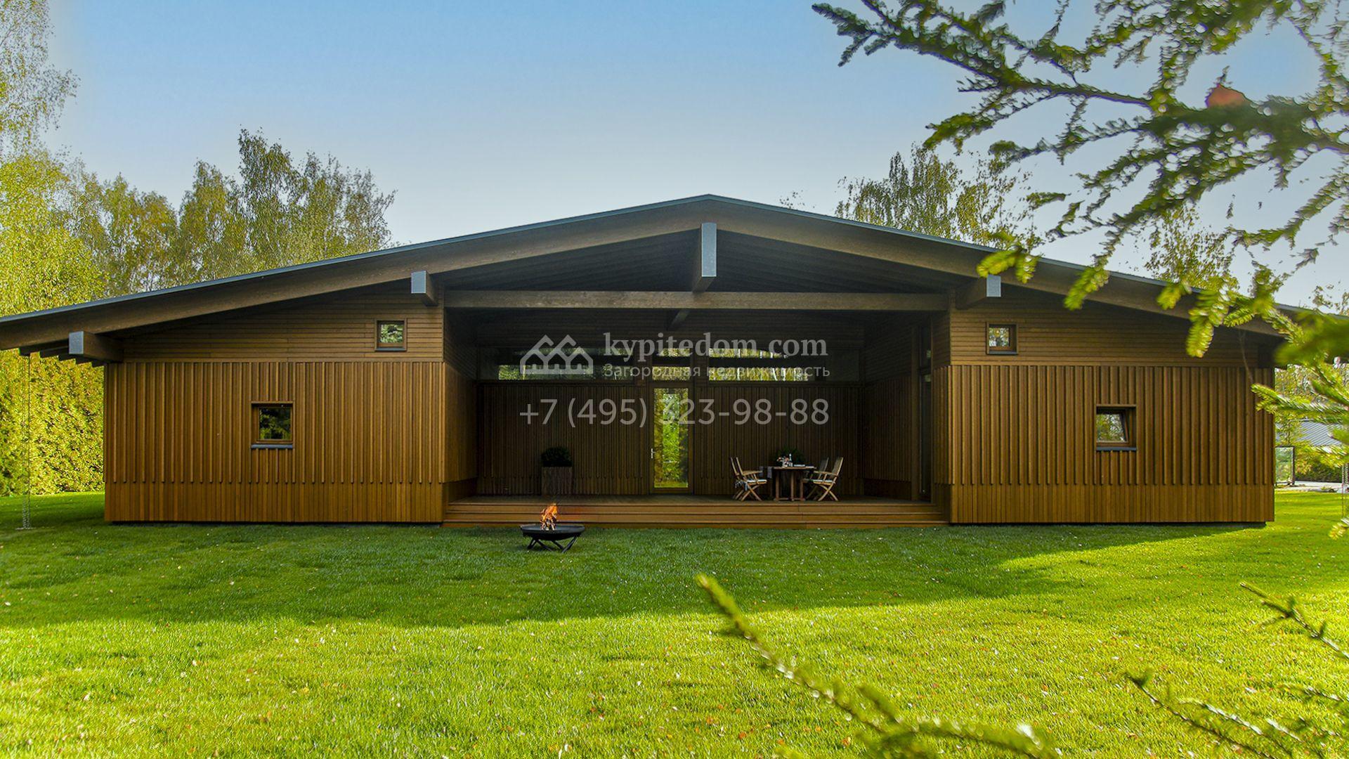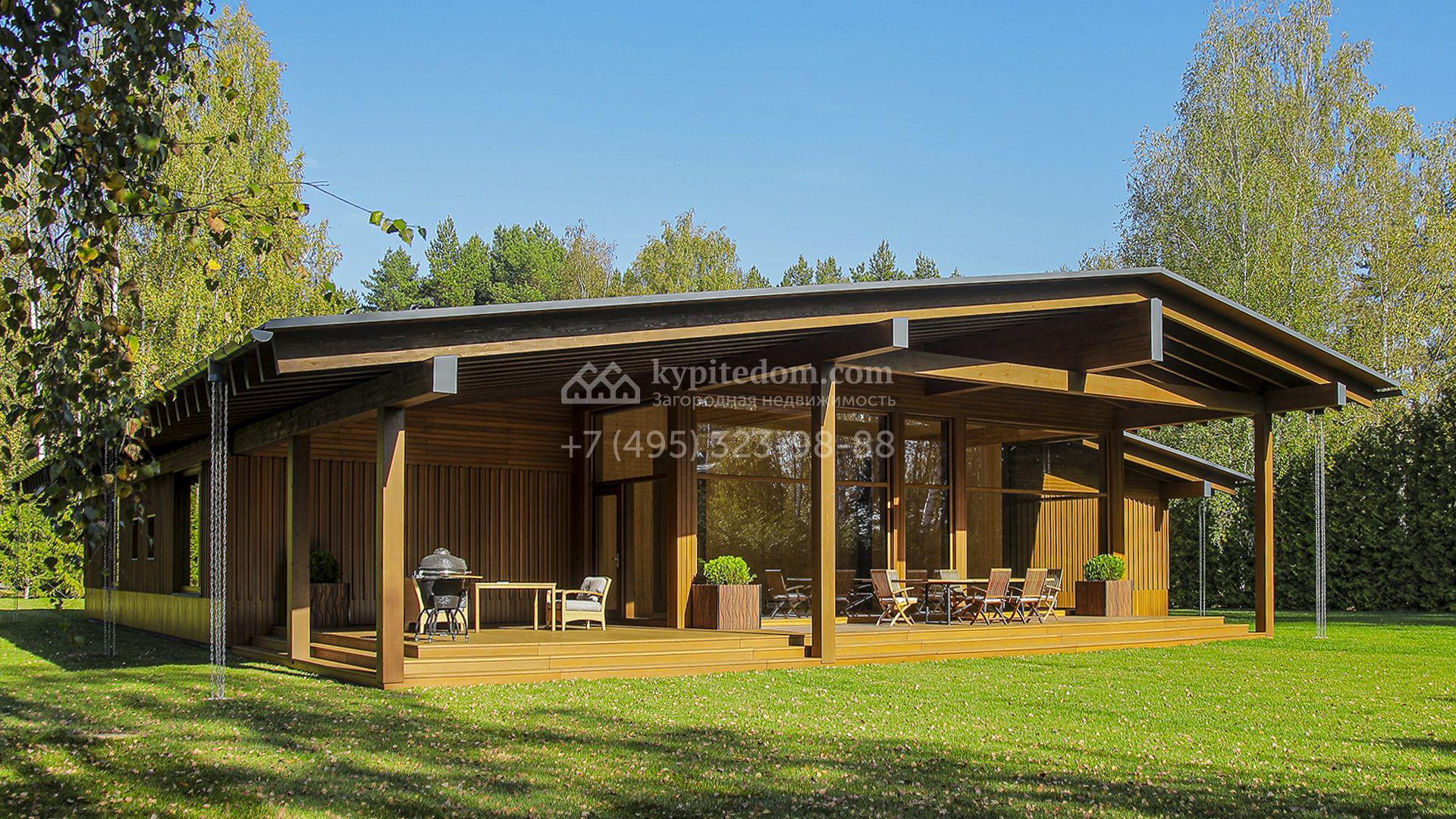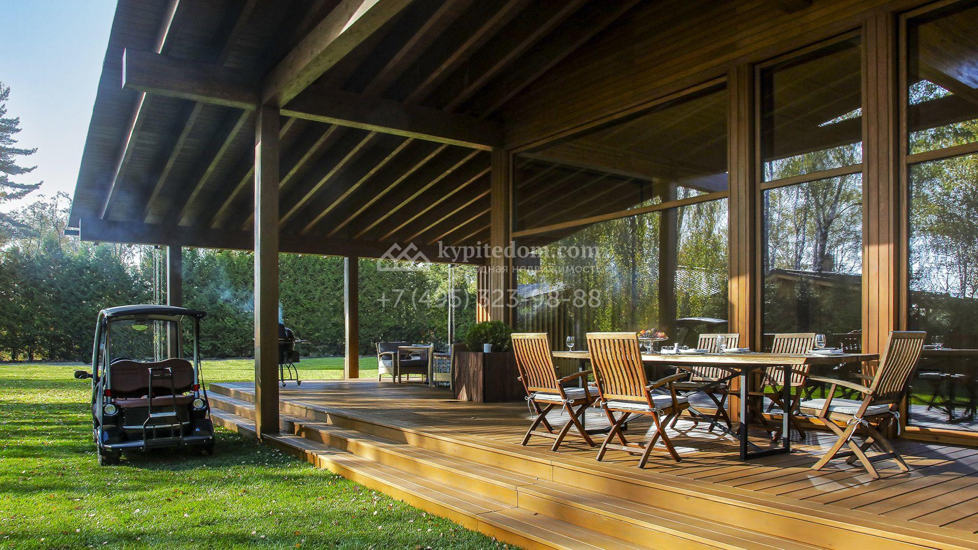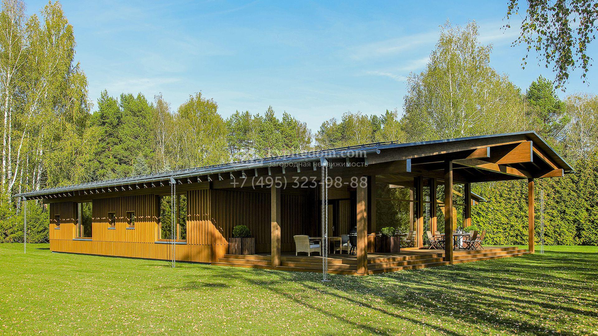 Загородный коттедж площадью 330 м² расположен на полевом участке 35 соток с живописным видом на гольф-поле. Деревянный фасад в стиле шале подчёркивают выразительные широкие свесы крыши и панорамное остекление. Отсутствие отделки позволяет будущим владельцам реализовать любой дизайн-проект.