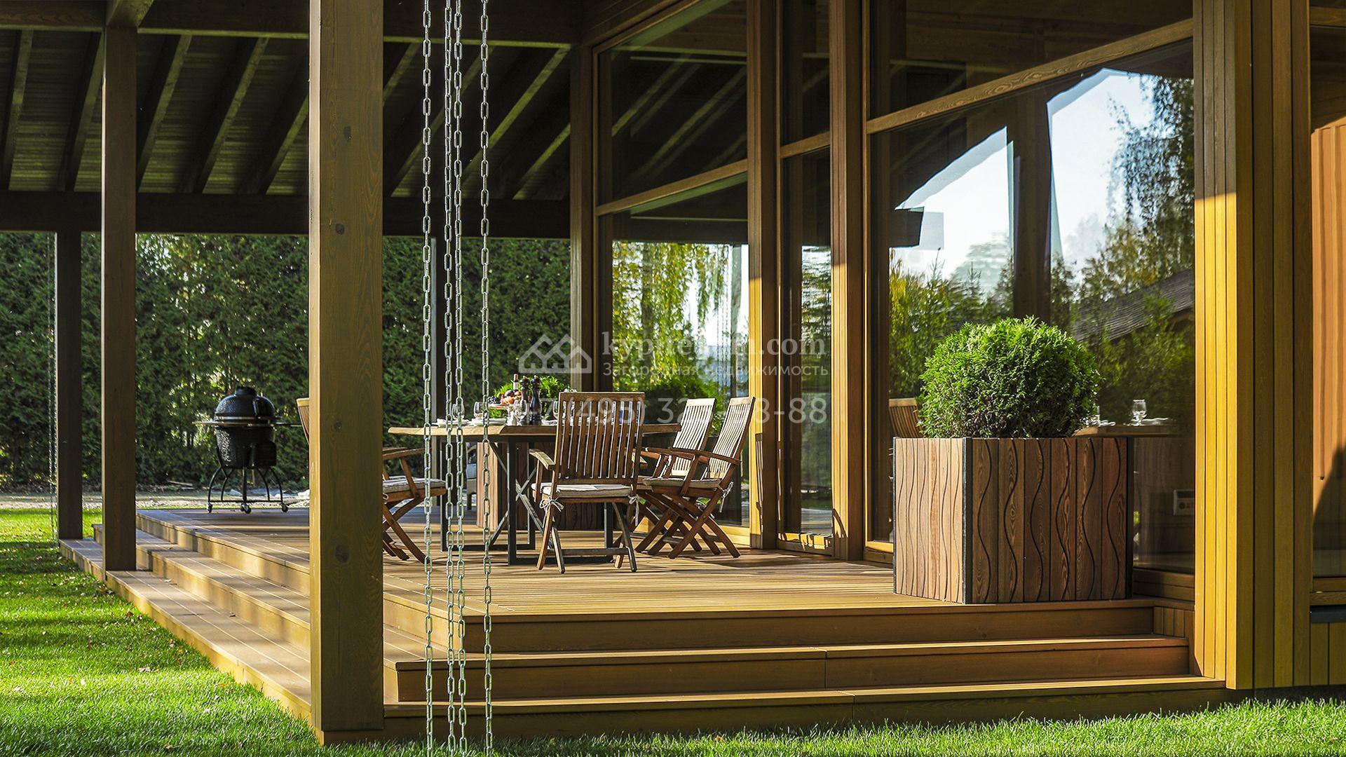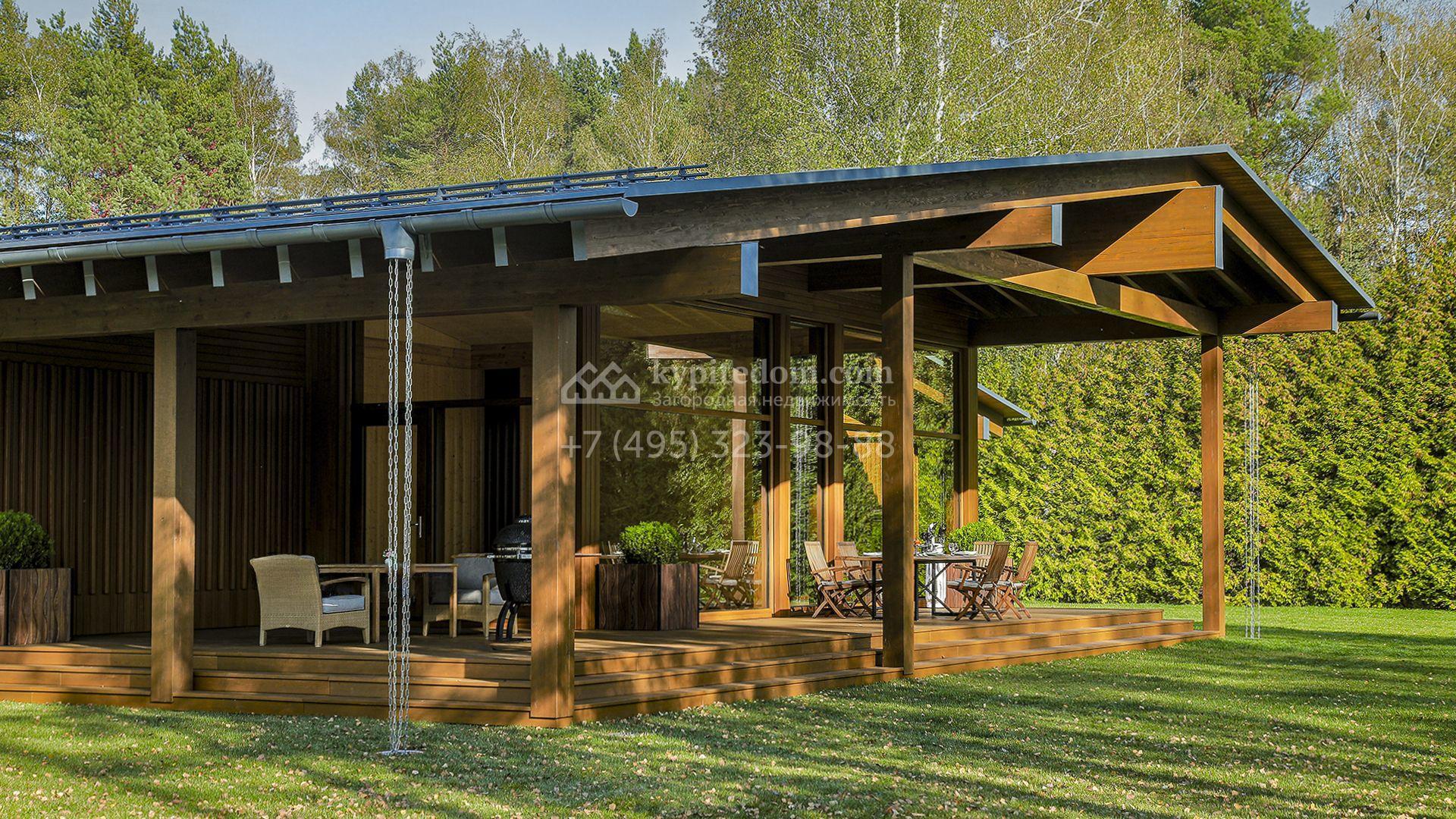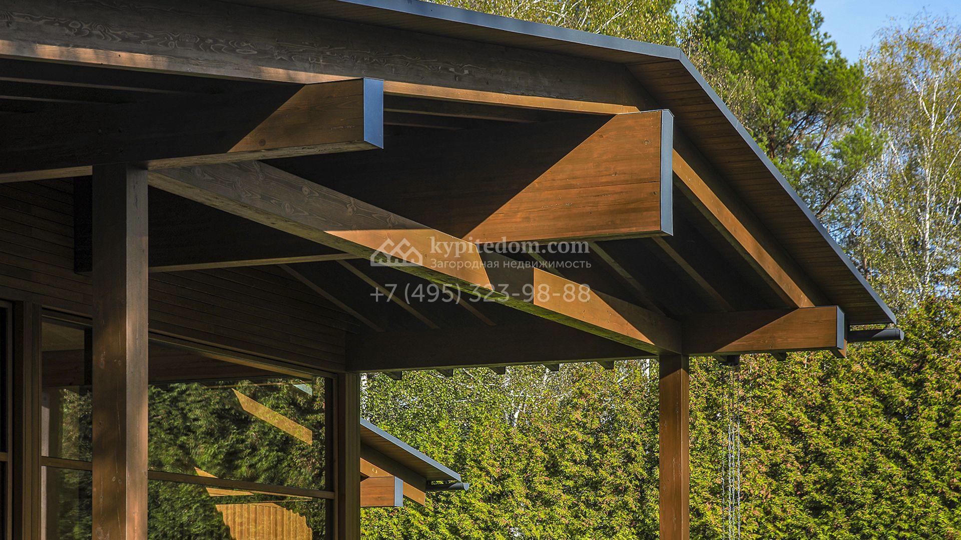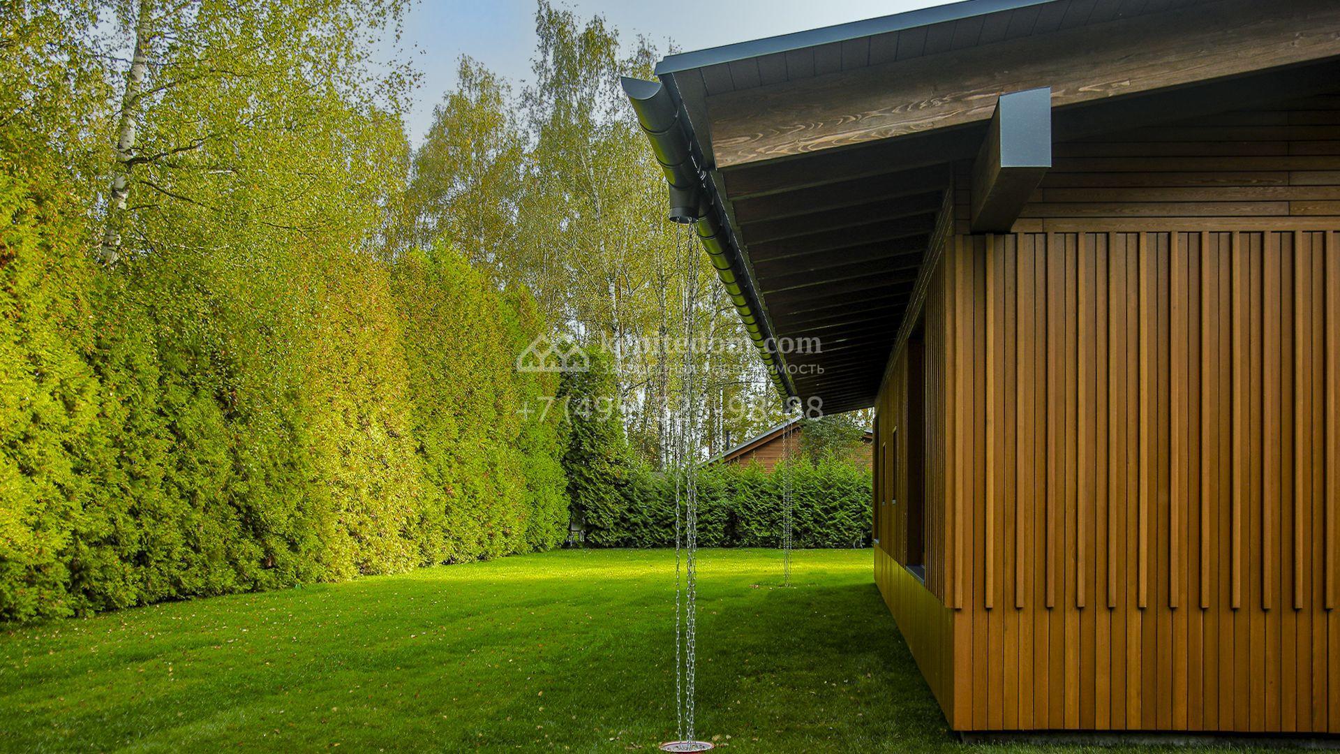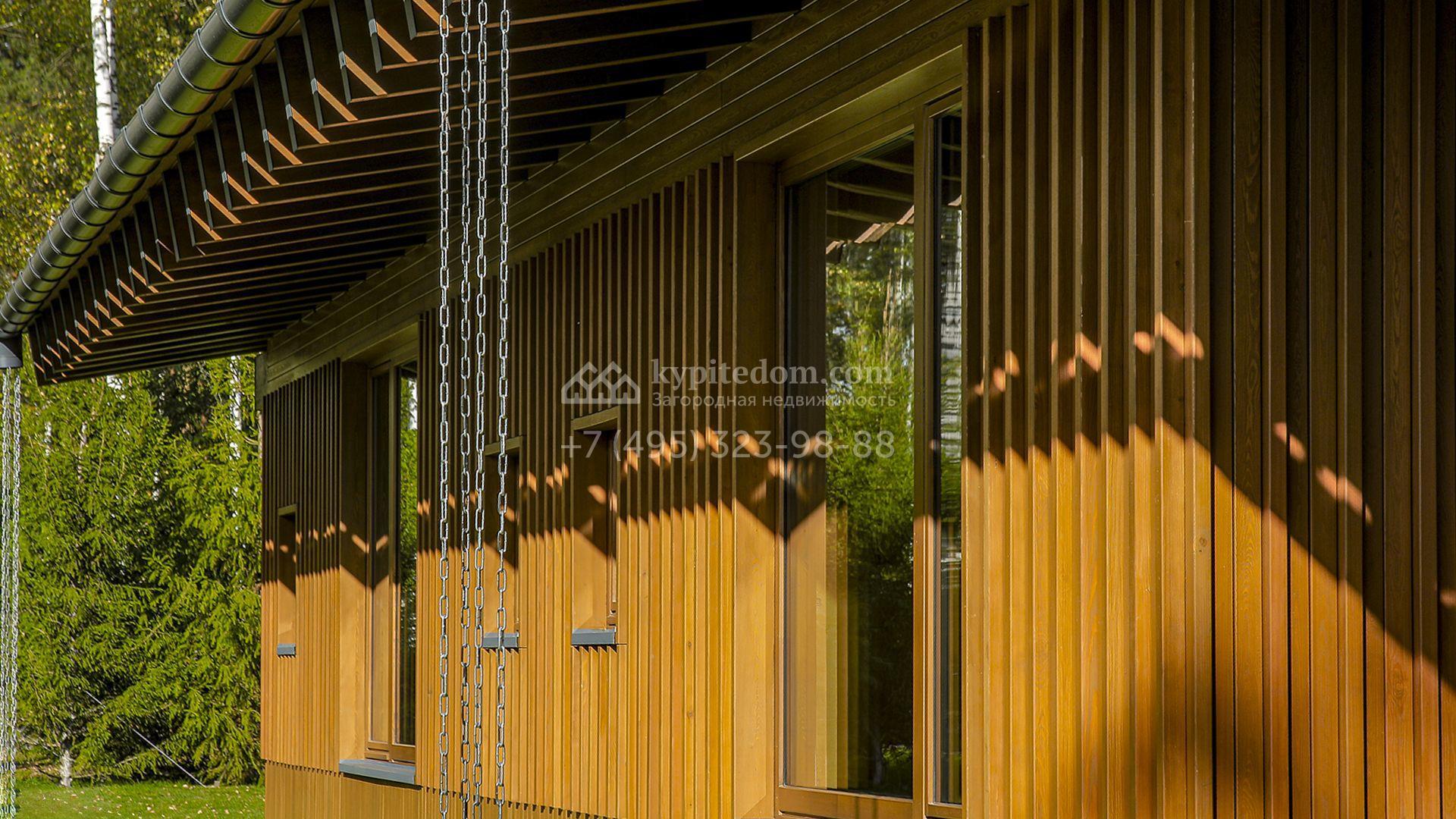 Загородный коттедж площадью 330 м² расположен на полевом участке 35 соток с живописным видом на гольф-поле. Деревянный фасад в стиле шале подчёркивают выразительные широкие свесы крыши и панорамное остекление. Отсутствие отделки позволяет будущим владельцам реализовать любой дизайн-проект.