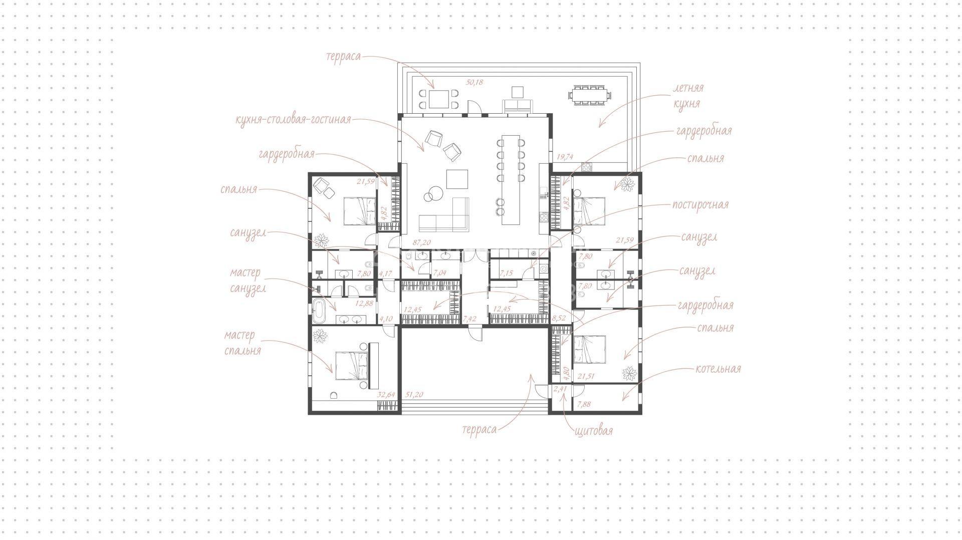 Центральное пространство занимает гостиная, объединённая с кухней-столовой, а для комфорта жителей и их гостей планировка включает 4 спальни с гардеробными. Просторные террасы и летняя кухня станут идеальным местом для романтичных посиделок на свежем воздухе. Автомобили можно разместить под двухместным навесом или же на открытой парковке. Завершают образ ухоженный газон и аккуратно высаженные по периметру туи, создающие ощущение приватности.