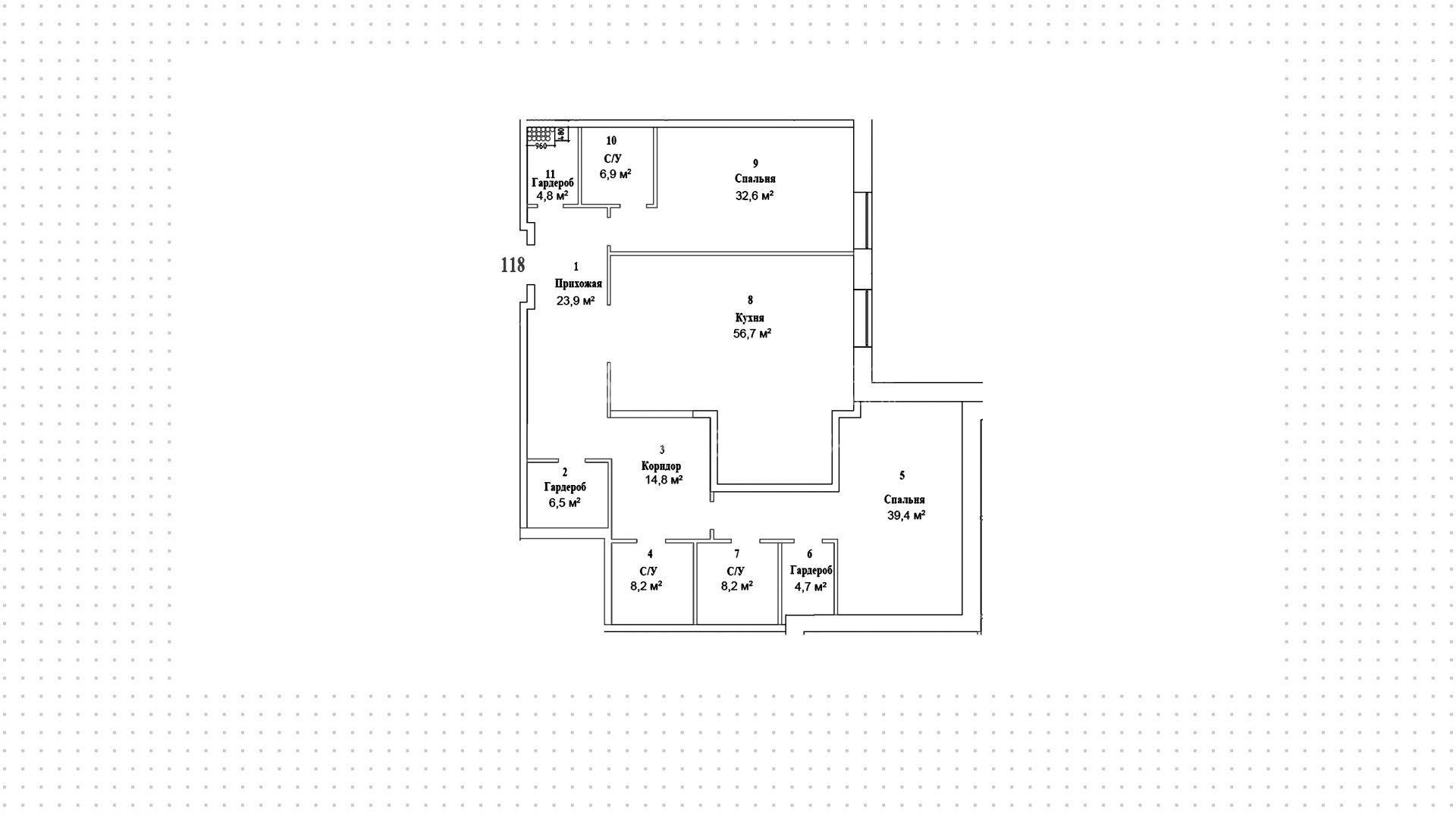 Квартира с 2-мя спальнями продается без отделки. Она расположена на пятом этаже многоквартирного дома и включает 2 гардеробных, 2 спальни с личными ванными комнатами, гостевой санузел и просторную кухню. Общая площадь квартиры — 201 м². Работает система кондиционирования.