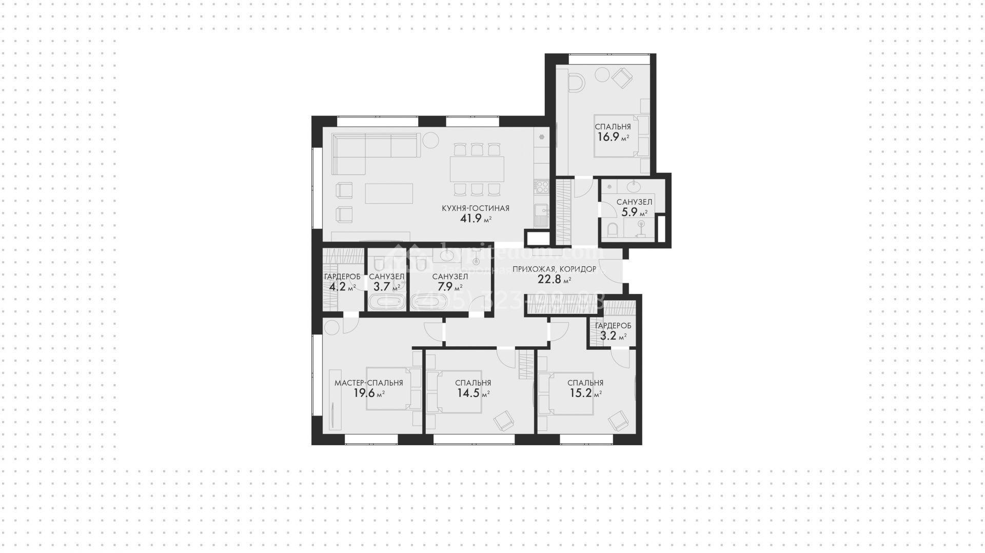 Квартира площадью 156 м² расположена на 2-м этаже семиэтажного дома. Свободная планировка позволяет воплотить множество интерьерных решений. Высота потолков достигает 3,35 метров. Проект включает просторную кухню-гостиную с выходом на лоджию, мастер-спальню с санузлом, вторую спальню с гардеробной, гостевую спальню и постирочную. Окна выходят на три стороны — приватный парк, бассейн и двор.