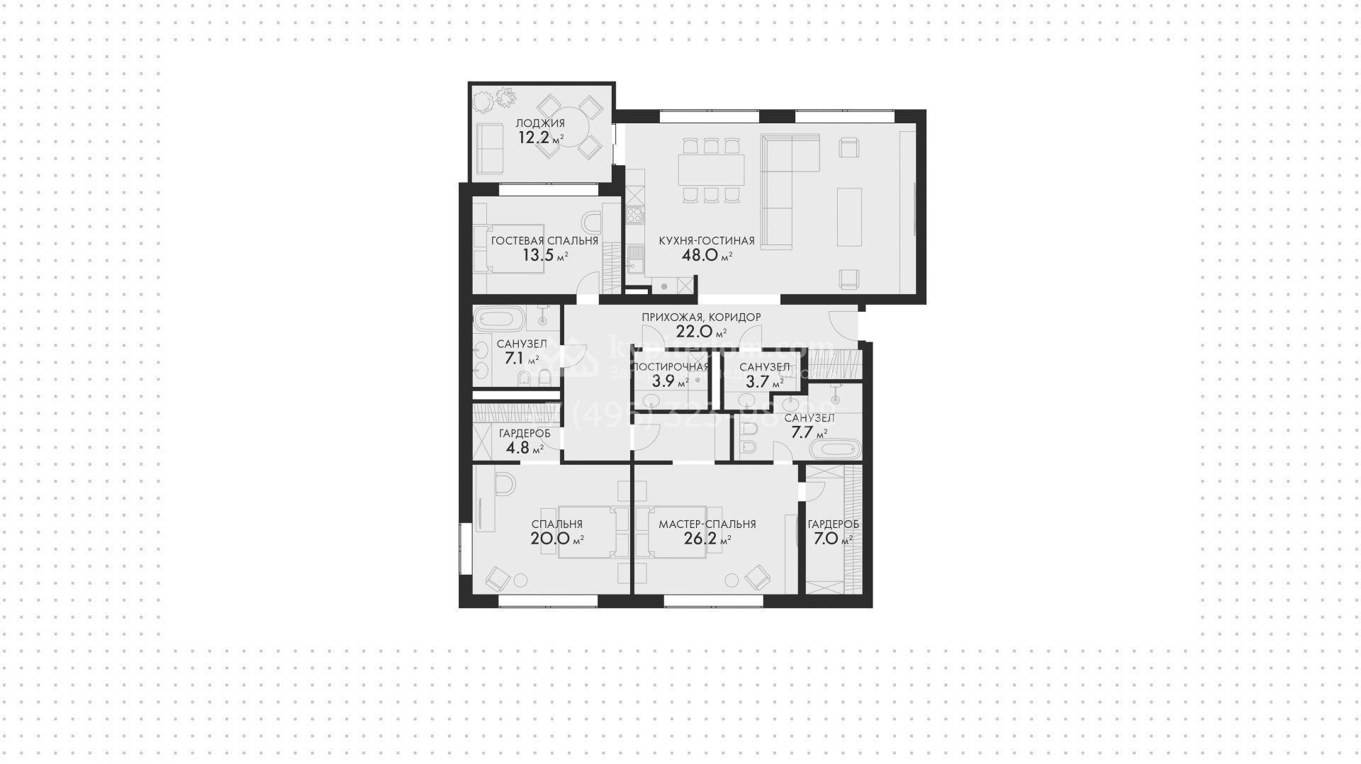 Квартира площадью 172,4 м² расположена на 3-м этаже семиэтажного дома. Свободная планировка позволяет воплотить множество интерьерных решений. Высота потолков достигает 3,35 метров. Планировка квартиры включает мастер-спальню с санузлом и гардеробной, спальню с гардеробной, гостевую спальню, кухню-гостиную и лоджию. Окна выходят на три стороны, открываются виды на приватный парк, бассейн и внутренний двор.
