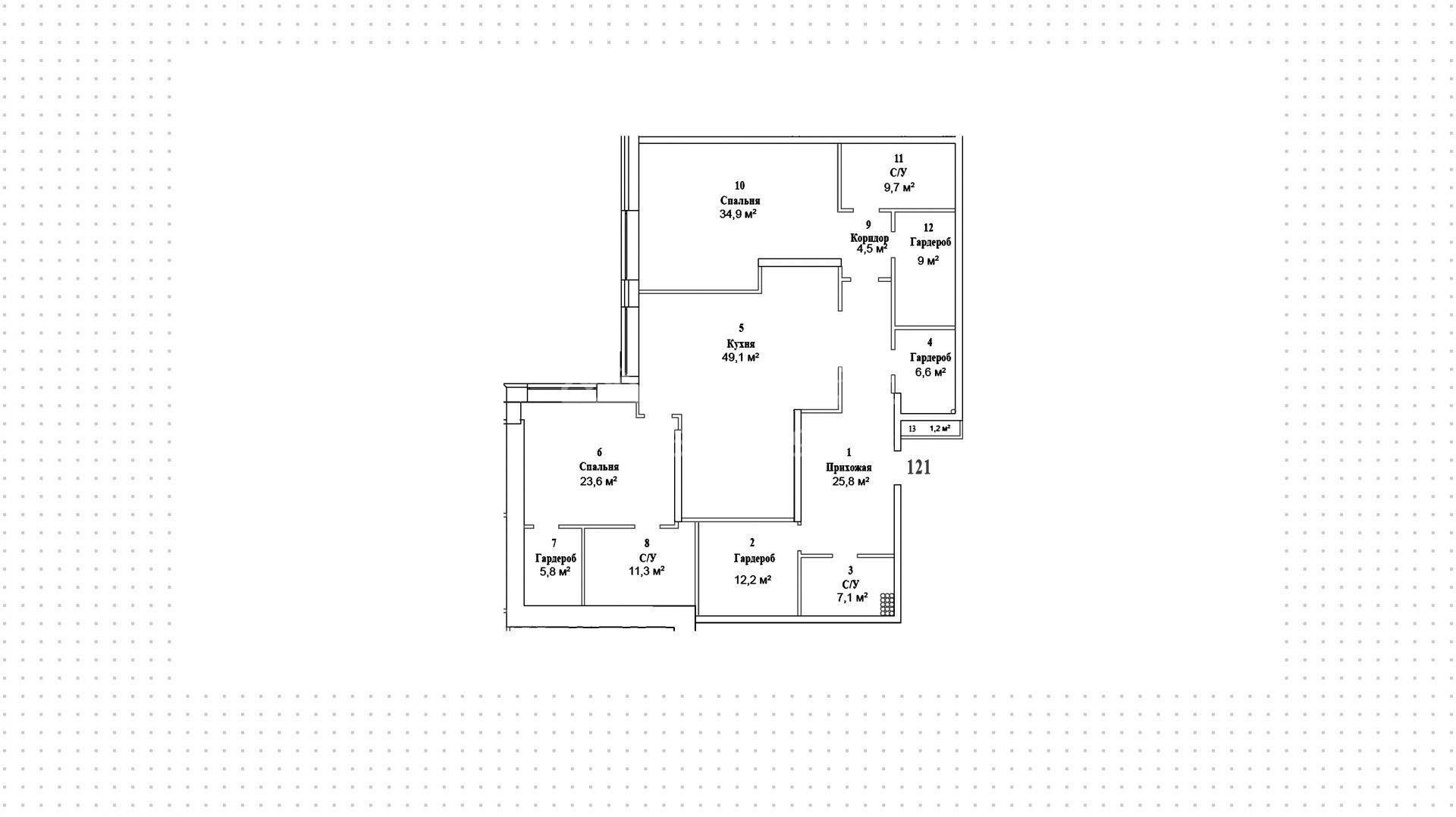 Квартира с 2-мя спальнями и видом на парк. Она находится на пятом этаже и занимает площадь 204 м². В квартире просторная прихожая, 2 гардеробных, гостевой санузел, 2 спальни с ванными комнатами и гардеробными, светлая кухня с большими окнами. Продается без отделки.