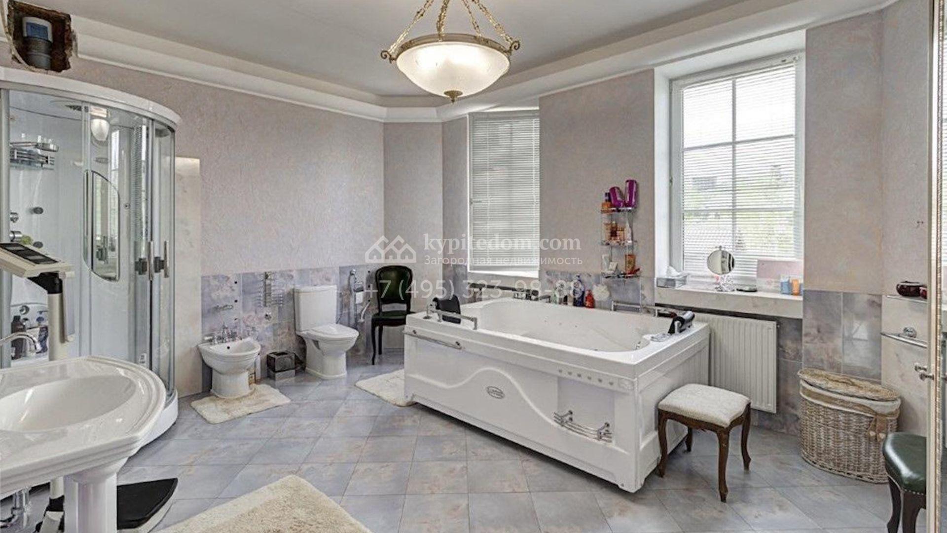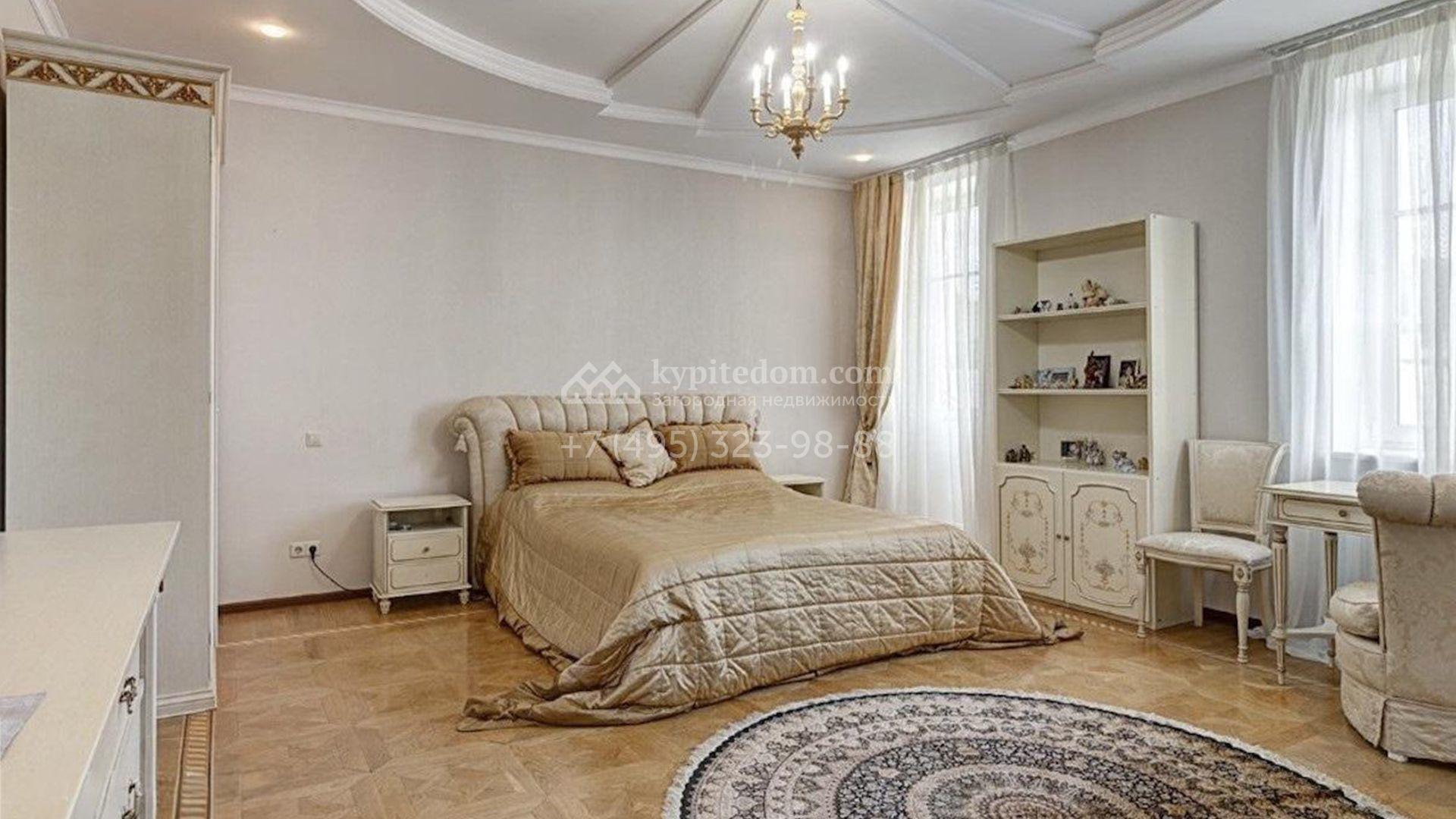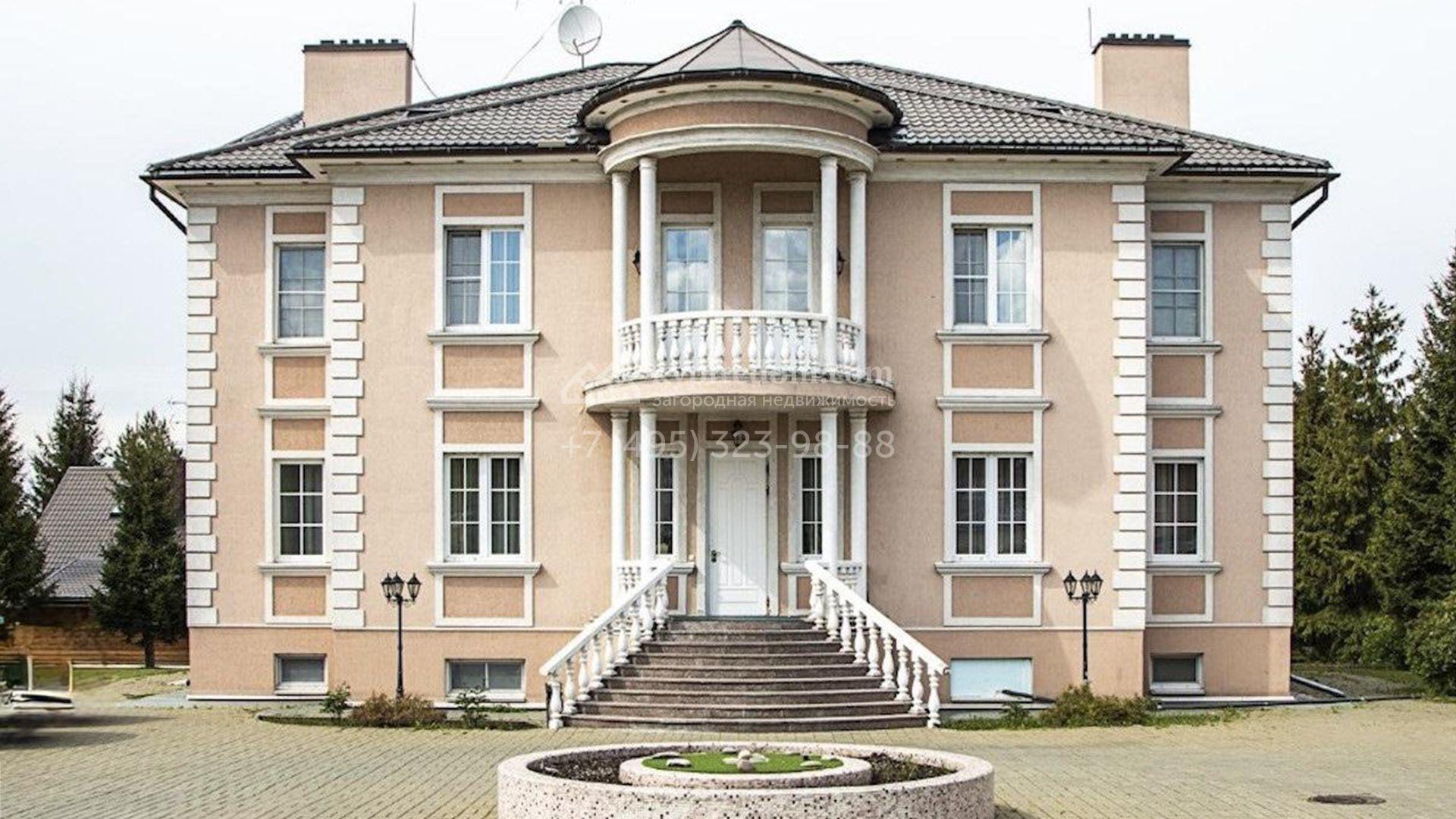 Загородный коттедж площадью 850 м² расположен на полевом участке 45 соток. Фасад выполнен в классическом стиле, облицован штукатуркой и украшен изящными колоннами, рустовкой и балюстрадой, что придает ему элегантный вид. Интерьеры гармонично сочетаются с внешним обликом, они выдержаны в светлых тонах и дополнены комфортной мебелью, бытовой техникой и сантехникой.