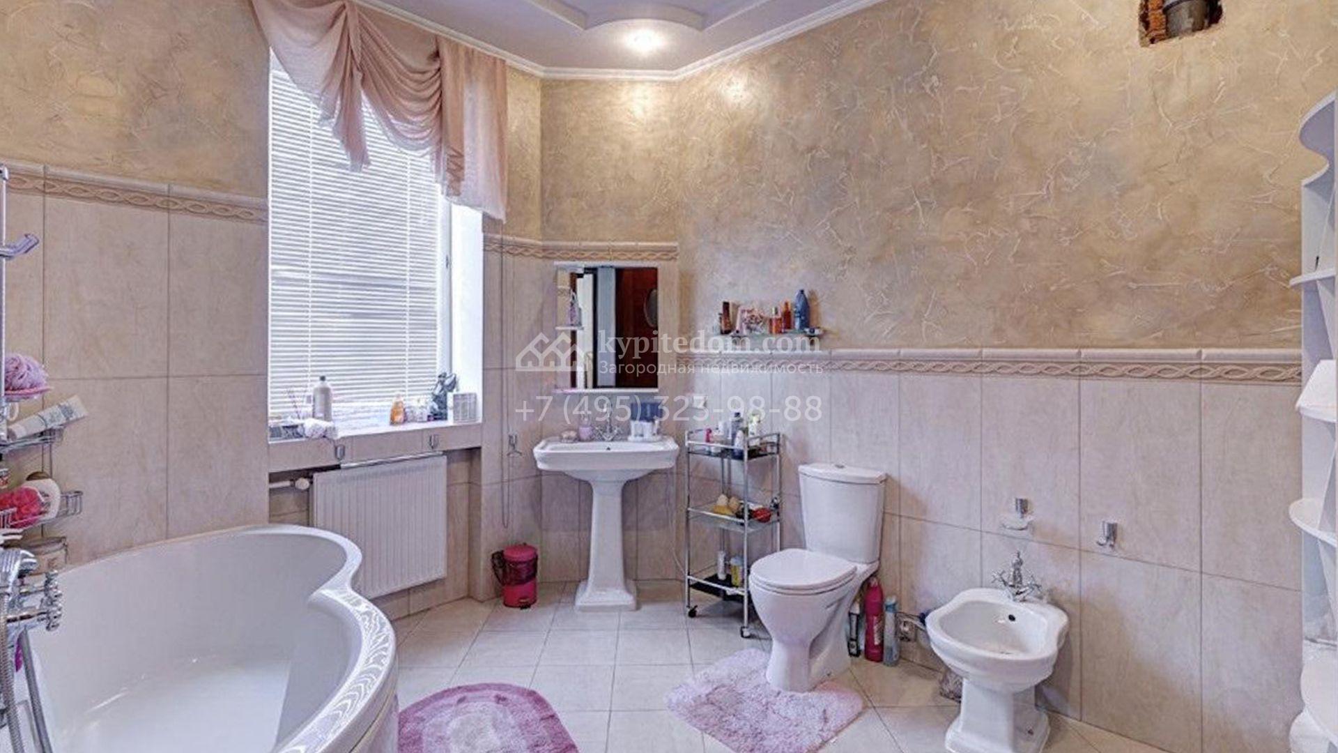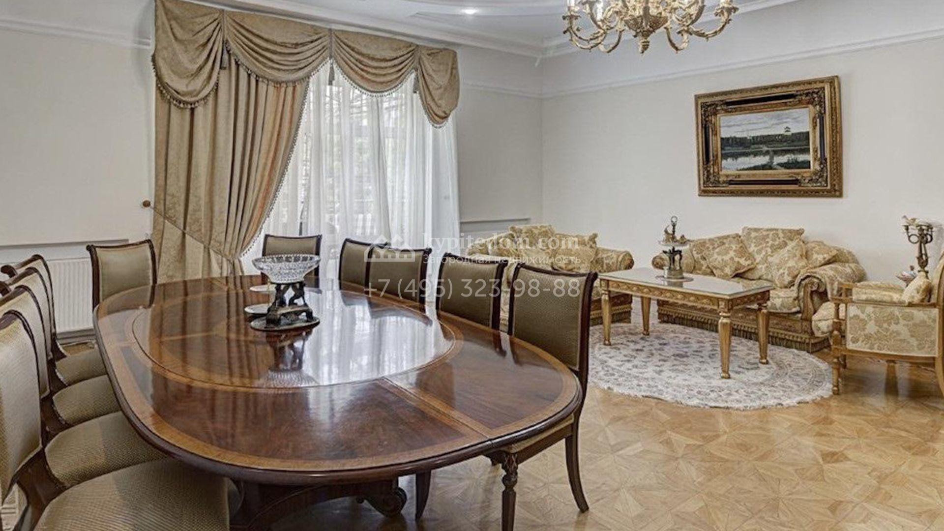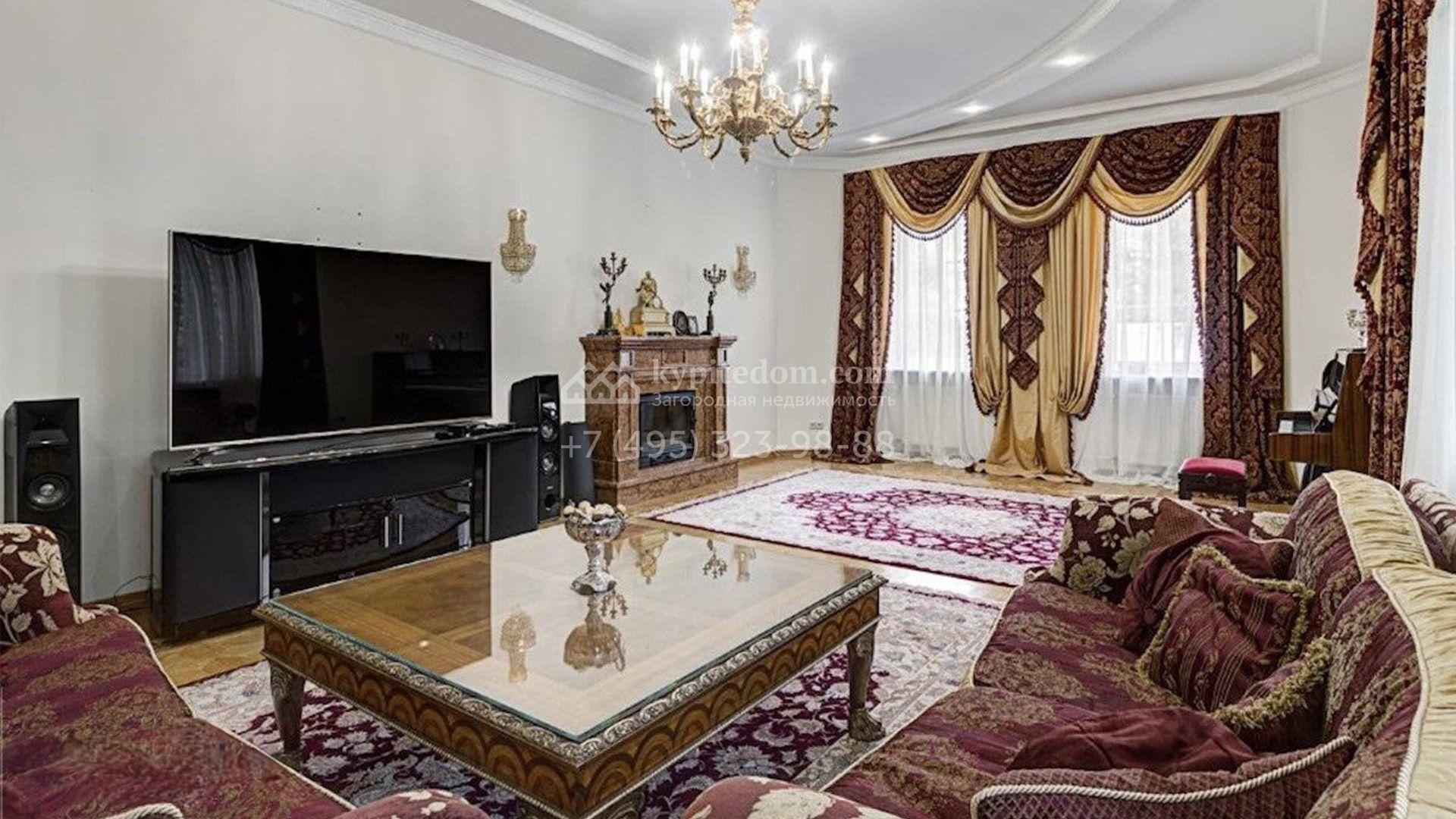 Загородный коттедж площадью 850 м² расположен на полевом участке 45 соток. Фасад выполнен в классическом стиле, облицован штукатуркой и украшен изящными колоннами, рустовкой и балюстрадой, что придает ему элегантный вид. Интерьеры гармонично сочетаются с внешним обликом, они выдержаны в светлых тонах и дополнены комфортной мебелью, бытовой техникой и сантехникой.