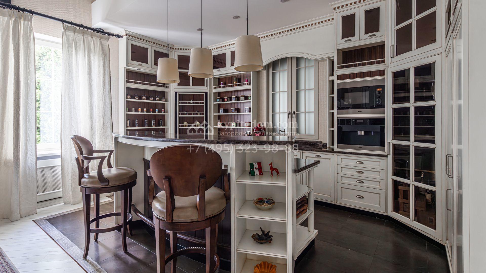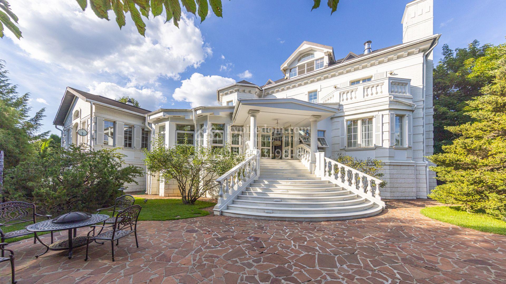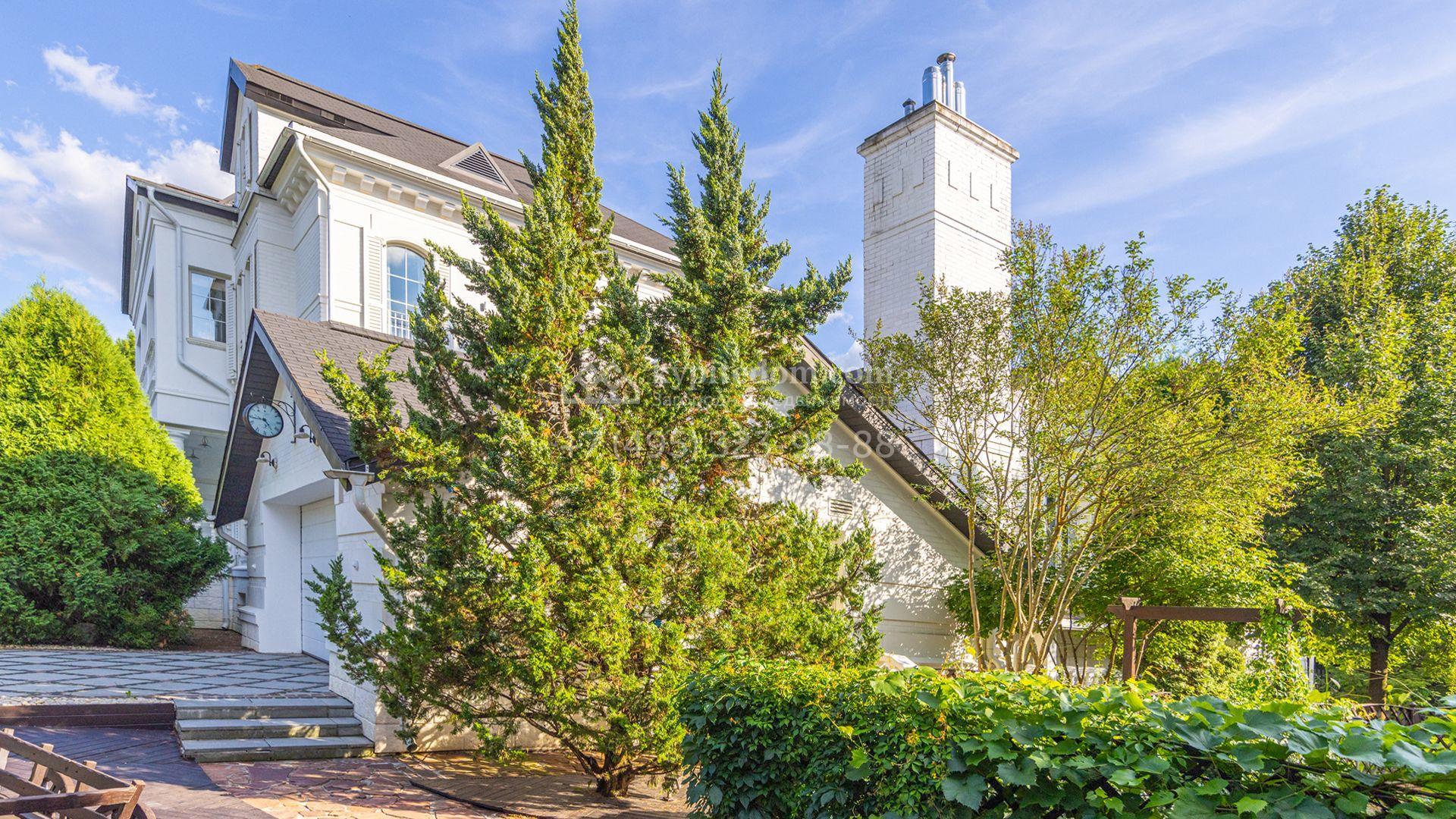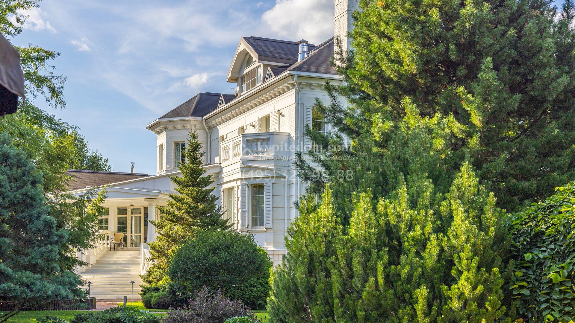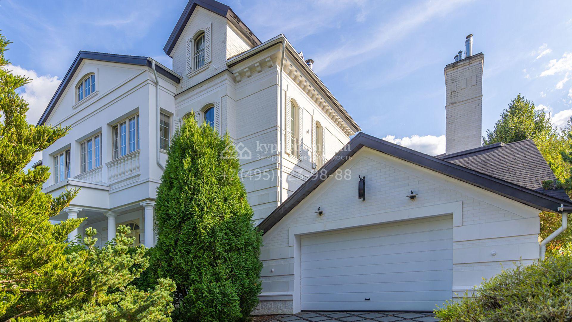 Загородная резиденция площадью 1245 м² расположена на просторном участке 50 соток. Фасад здания в классическом стиле облицован молочным кликером и декорирован колоннами, балясинами и ставнями. В отделке светлого интерьера преобладают теплые оттенки, создающие атмосферу уюта. Планировкой дома предусмотрены 5 спален, гостиная с камином, столовая с камином, рабочая с выходом в гараж и лестницей на цокольный этаж и парадная кухни, кабинет с зоной отдыха, зимний сад, веранда с барной зоной, столом на 12 персон, диванной зоной и отдельным выходом в сад, бильярдная-кинозал и гараж на 2 машины.