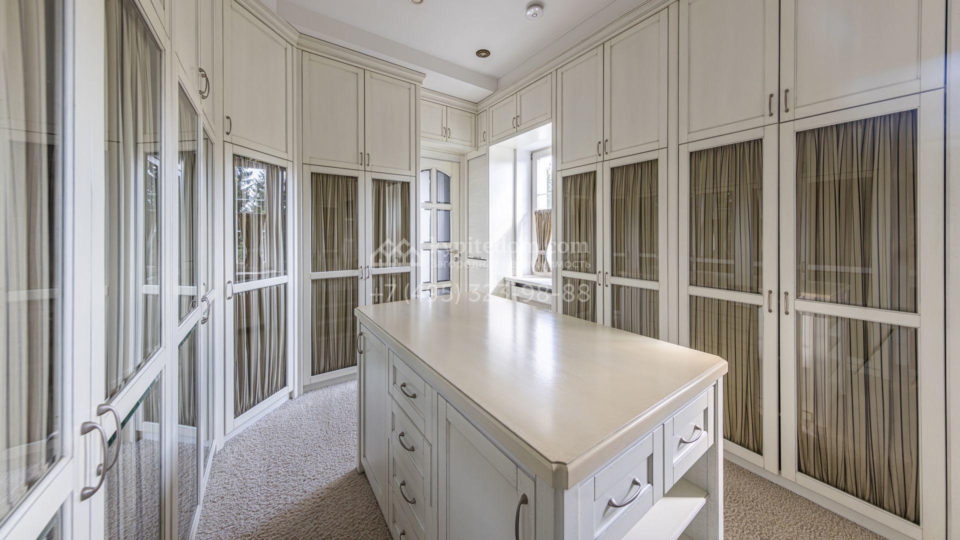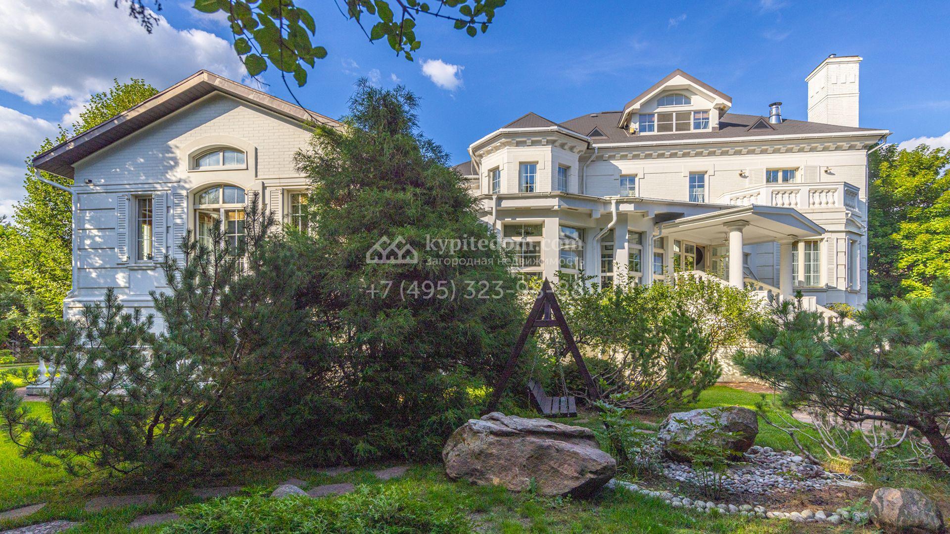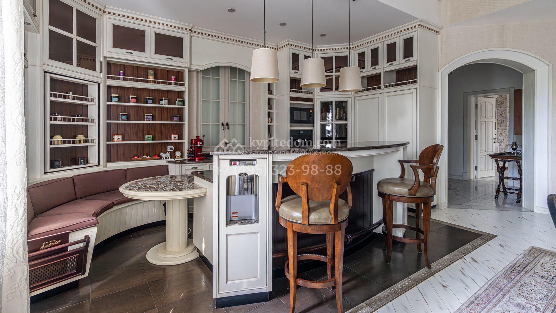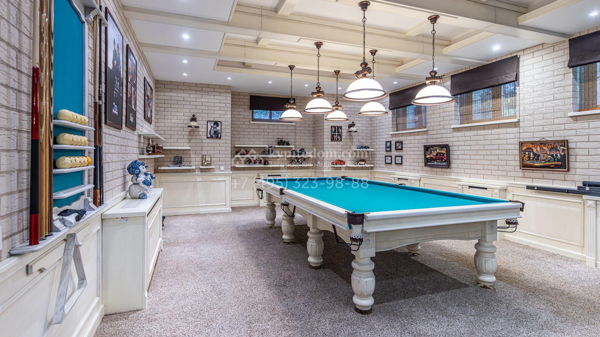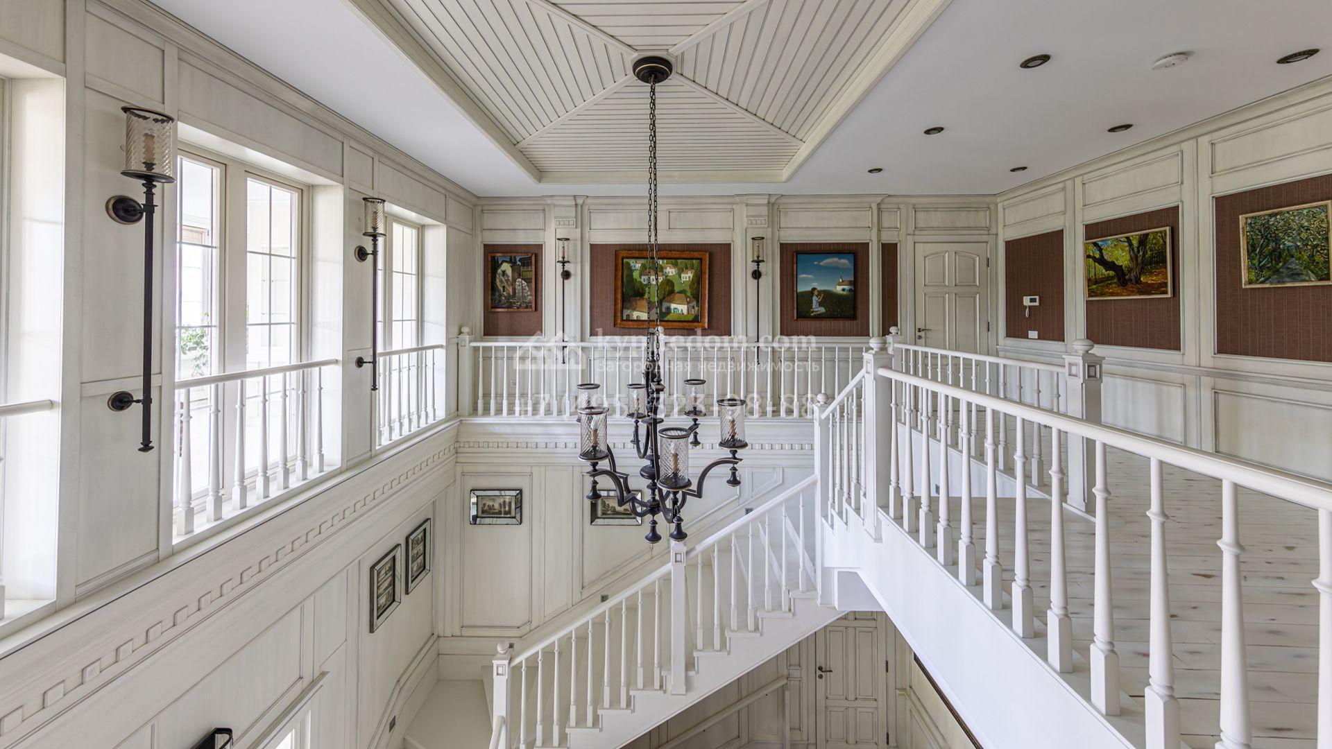 Загородная резиденция площадью 1245 м² расположена на просторном участке 50 соток. Фасад здания в классическом стиле облицован молочным кликером и декорирован колоннами, балясинами и ставнями. В отделке светлого интерьера преобладают теплые оттенки, создающие атмосферу уюта. Планировкой дома предусмотрены 5 спален, гостиная с камином, столовая с камином, рабочая с выходом в гараж и лестницей на цокольный этаж и парадная кухни, кабинет с зоной отдыха, зимний сад, веранда с барной зоной, столом на 12 персон, диванной зоной и отдельным выходом в сад, бильярдная-кинозал и гараж на 2 машины.
