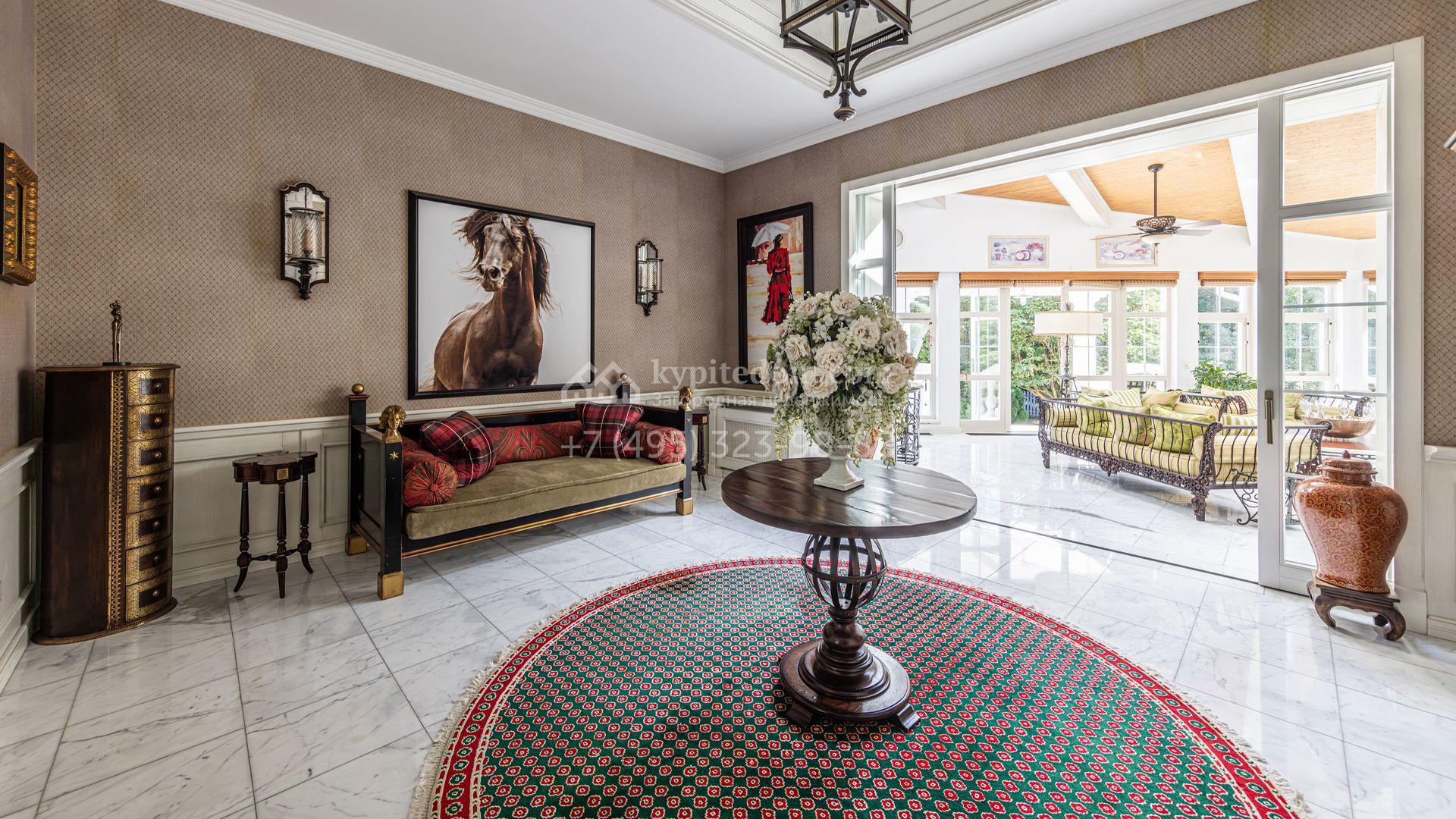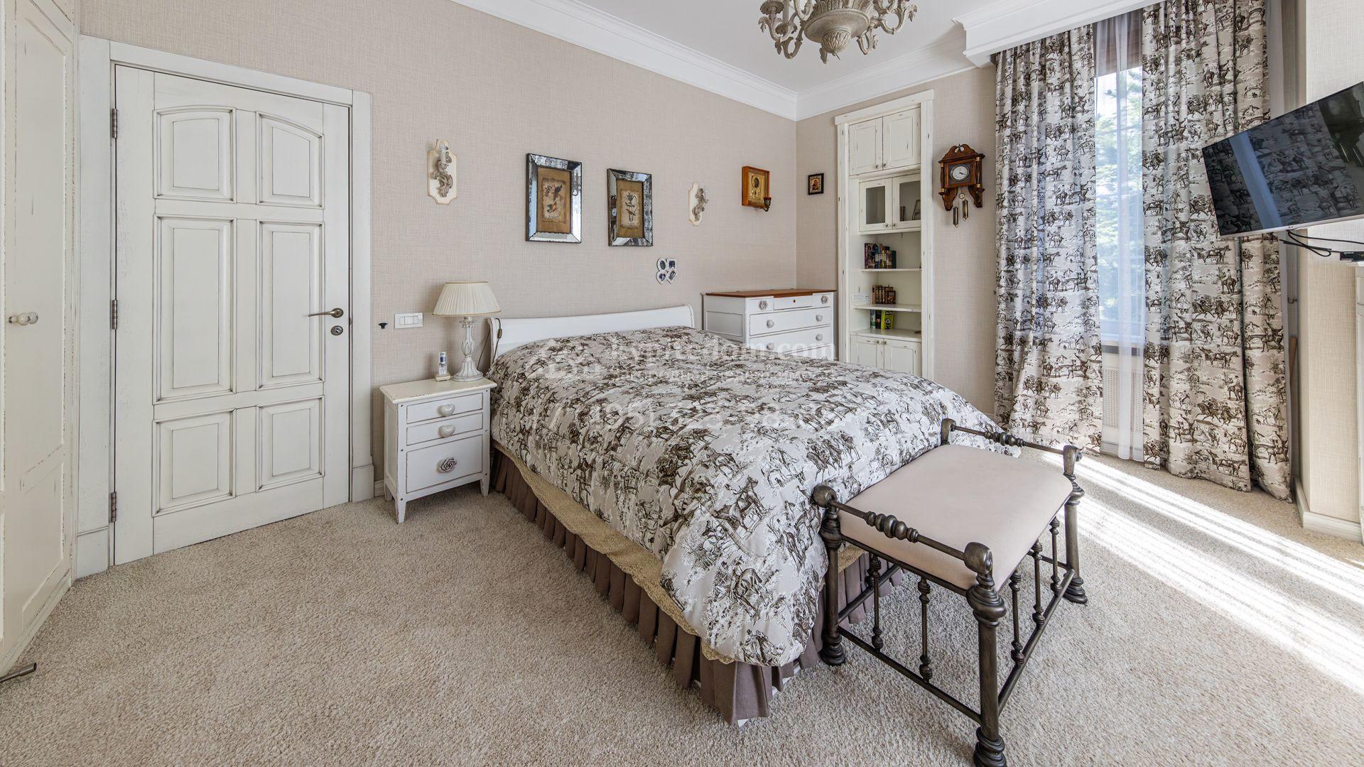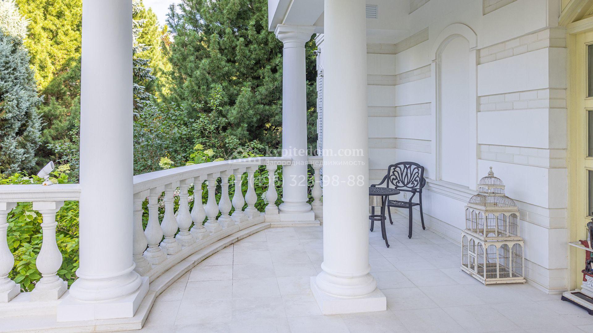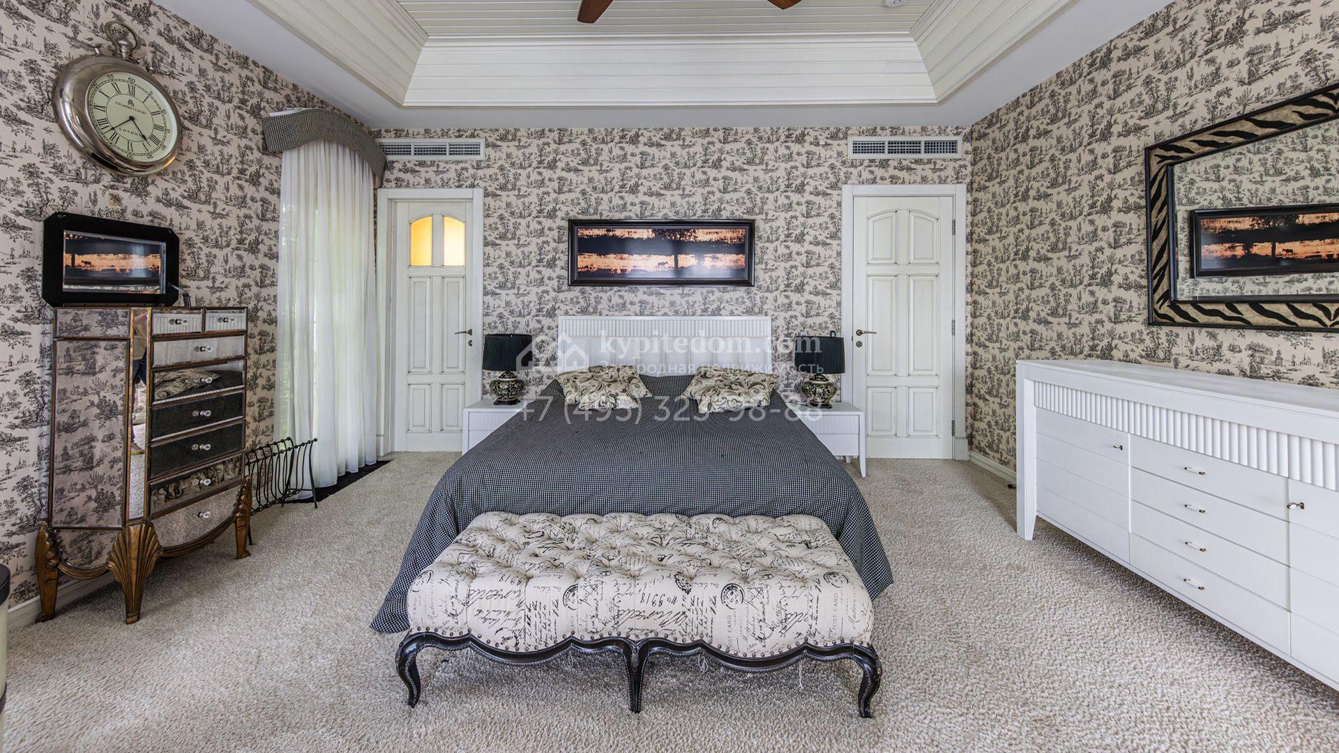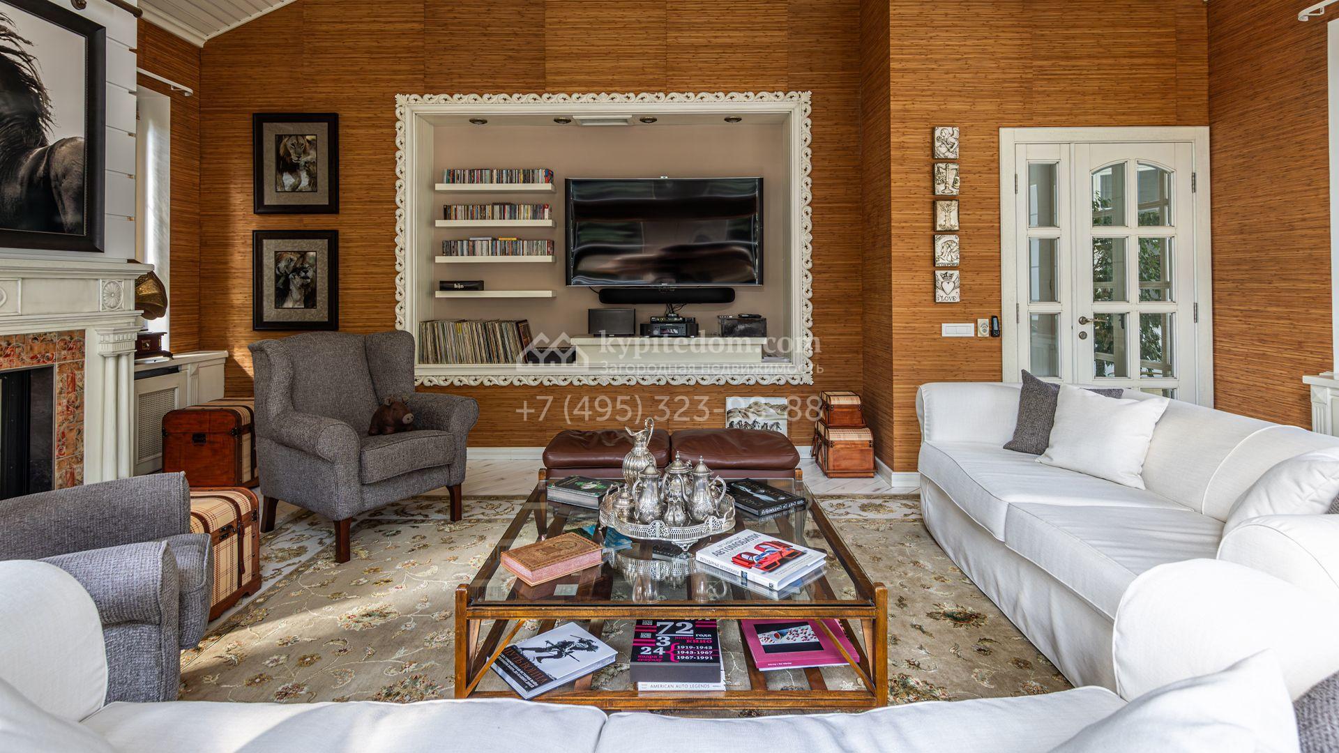 Загородная резиденция площадью 1245 м² расположена на просторном участке 50 соток. Фасад здания в классическом стиле облицован молочным кликером и декорирован колоннами, балясинами и ставнями. В отделке светлого интерьера преобладают теплые оттенки, создающие атмосферу уюта. Планировкой дома предусмотрены 5 спален, гостиная с камином, столовая с камином, рабочая с выходом в гараж и лестницей на цокольный этаж и парадная кухни, кабинет с зоной отдыха, зимний сад, веранда с барной зоной, столом на 12 персон, диванной зоной и отдельным выходом в сад, бильярдная-кинозал и гараж на 2 машины.